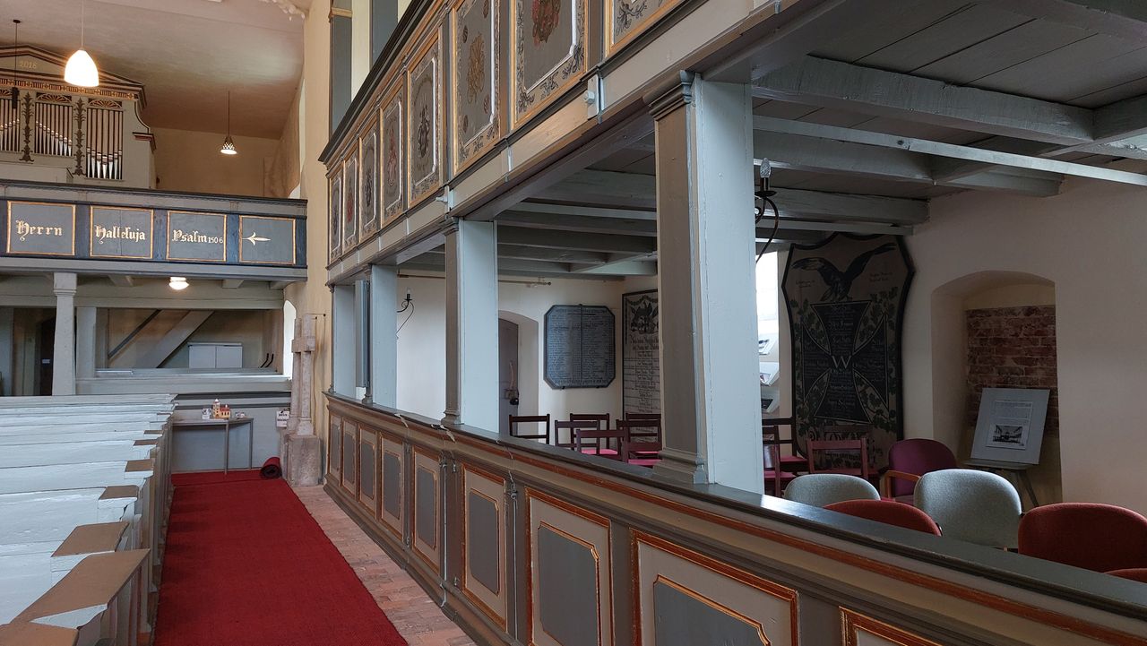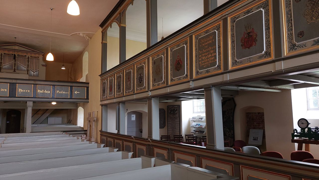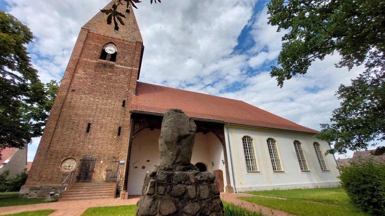 "Die als die älteste Kirche des Westhavellands[5] geltende Dorfkirche wurde im Kern in der zweiten Hälfte des 15. Jahrhunderts errichtet, jedoch werden Teile der Kirche als wesentlich älter erachtet.[6] Sie vereint mehrere Baustile; so ist der ältere aus Feldstein errichtete westliche Teil des Kirchenschiffes dem spätgotischen Feldsteinbau zuzuordnen. Querturm und östliches Kirchenschiff von 1739 sind aus Backstein und werden der Backsteingotik zugeordnet." (zi. nach: de.wikipedia.org)
