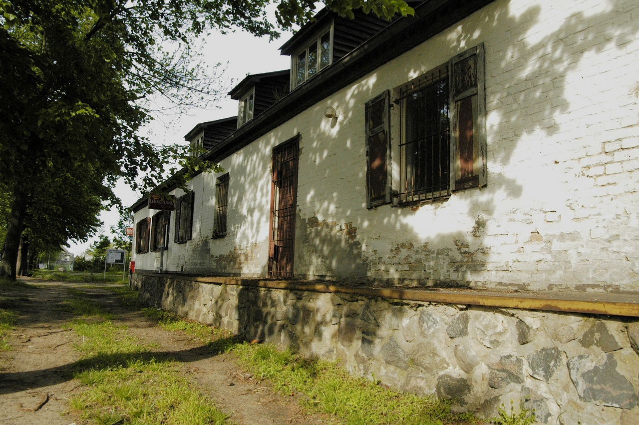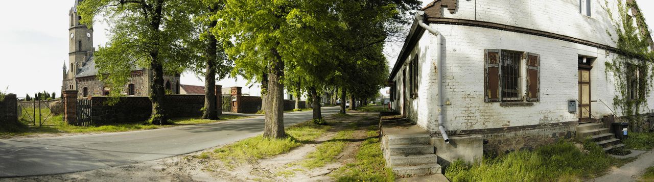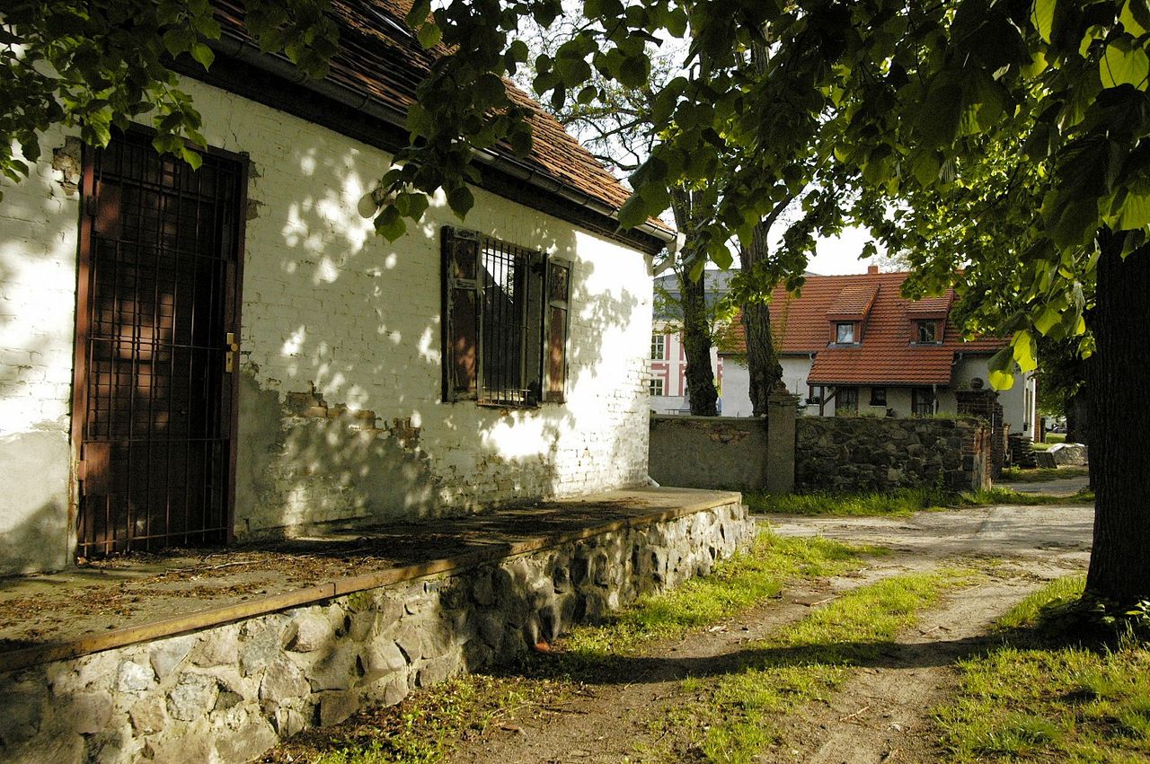 schöne dörfliche Hauptstrasse, eingeschossiger Fachwerkbau gegenüber einer Kirche, leerstehend