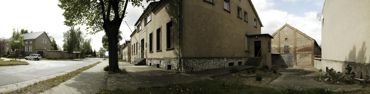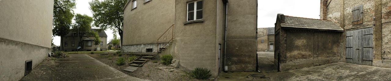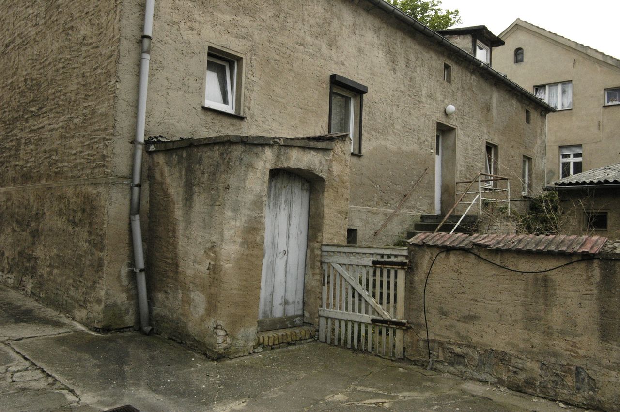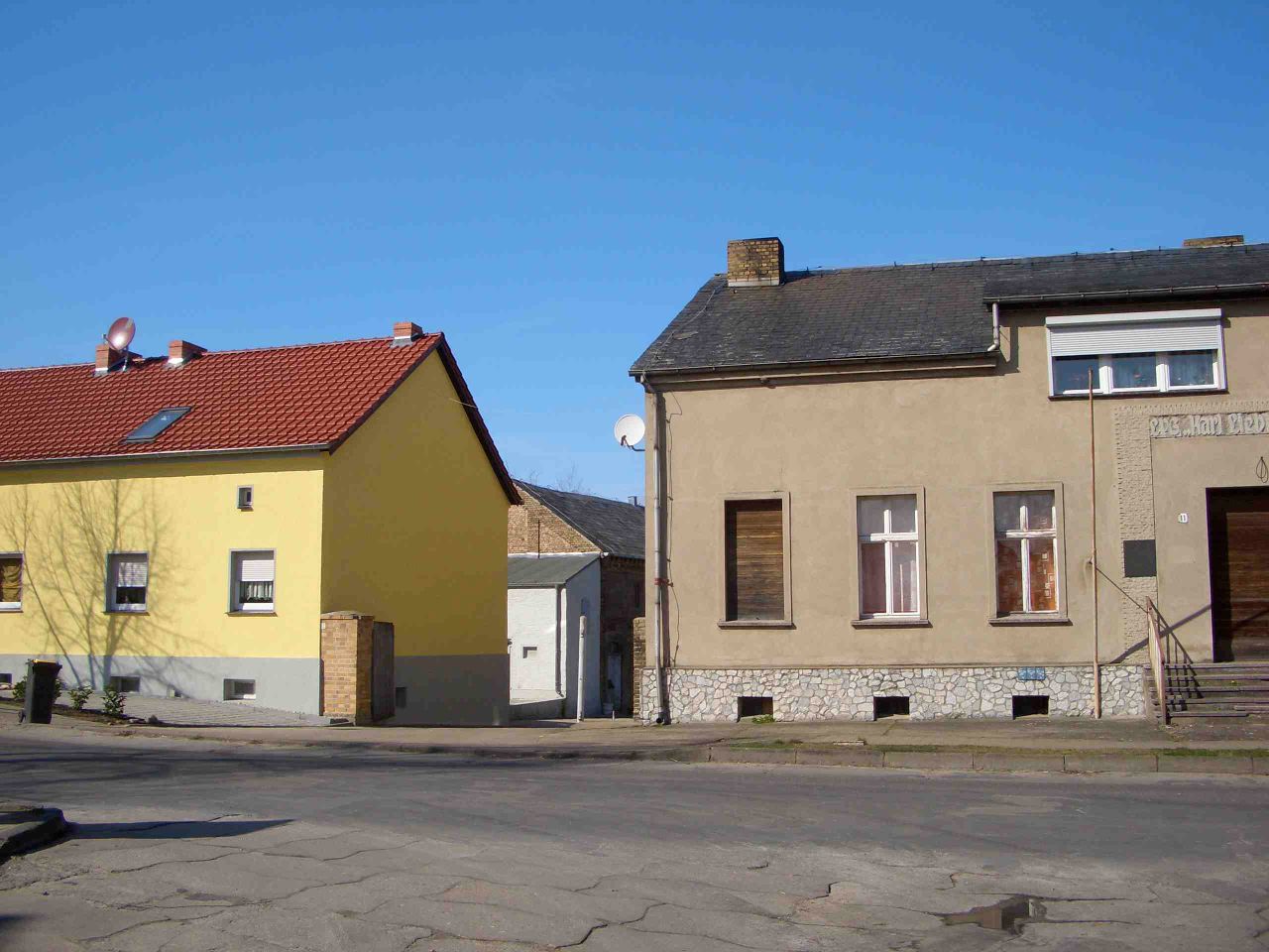 mehrere Gebäude hinter dem Haupthaus bilden einen Hof. Dieser liegt direkt an einer verträumten Dorfstrasse. Wirkt trist und grau