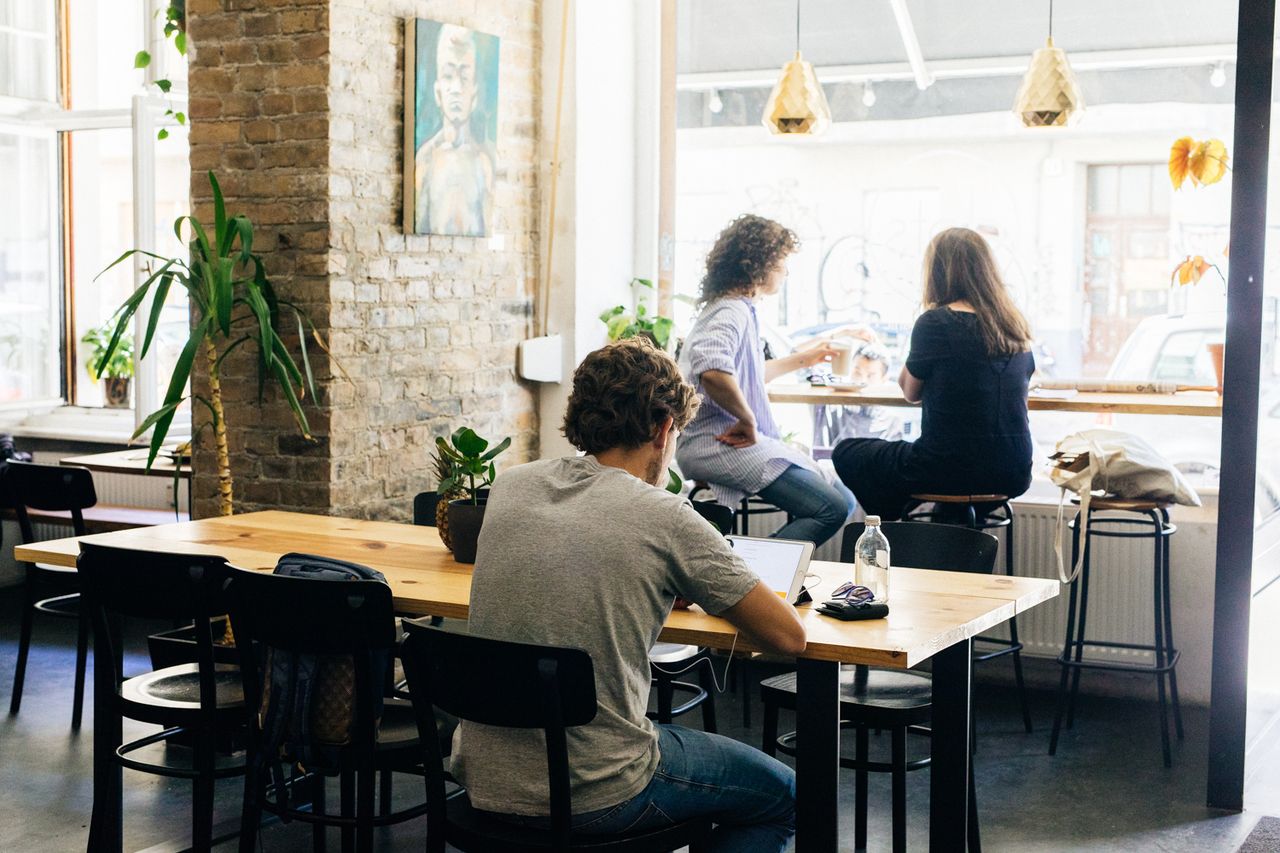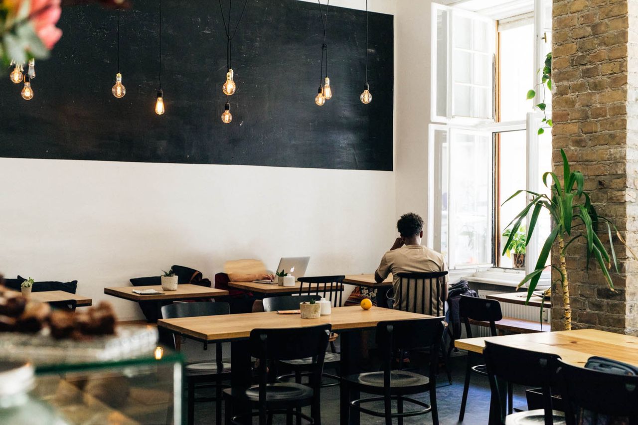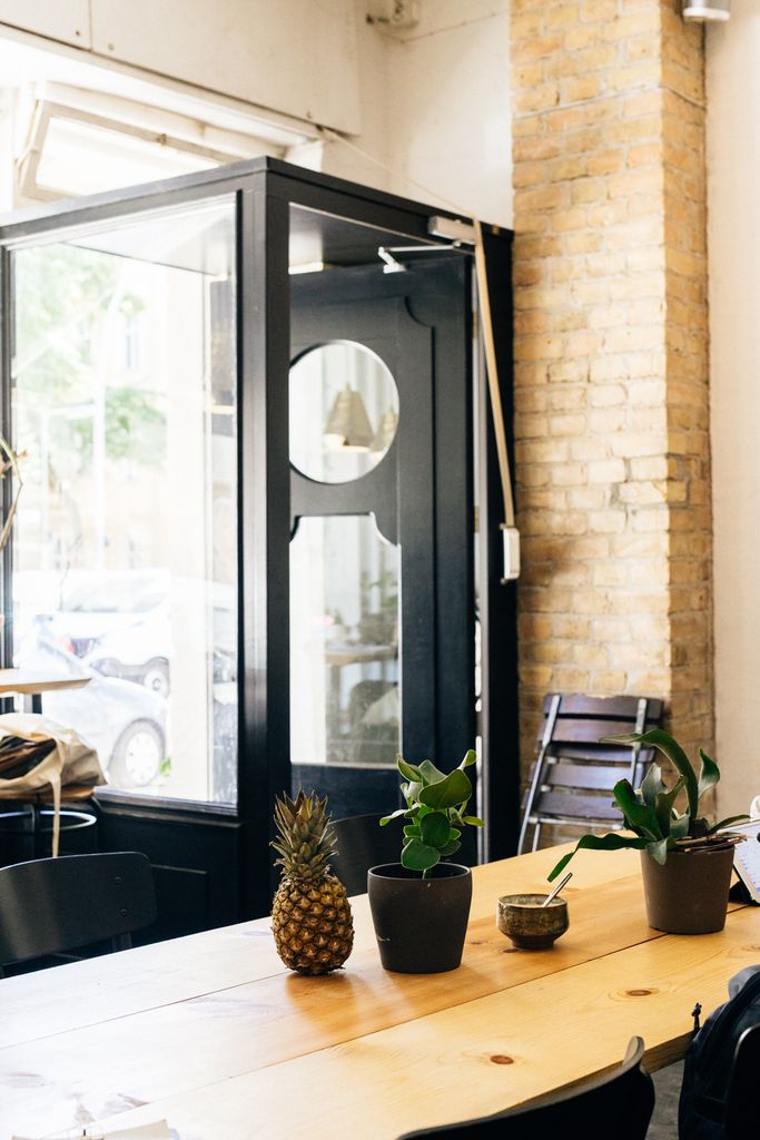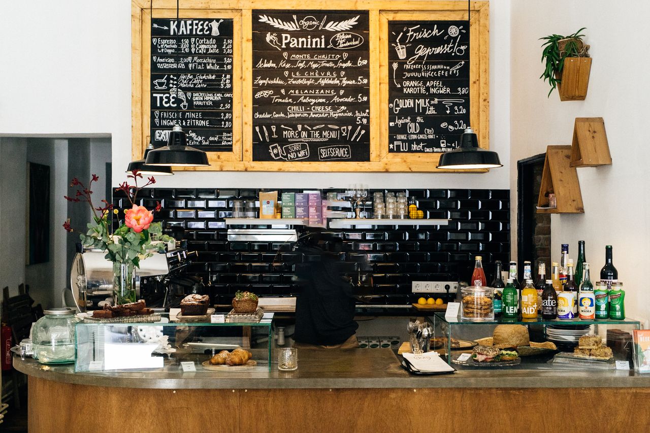 Brunch-Restaurant mit 28 flexiblen Sitzplätzen, Gastro-Küche, Bar mit Espressomaschine. Wände zT. Ziegelsteine freigelegt.