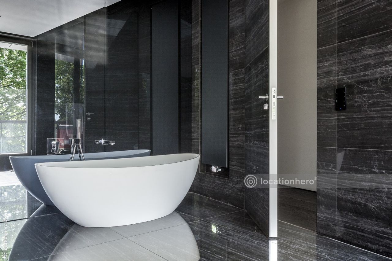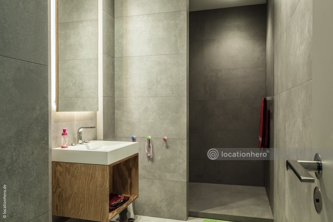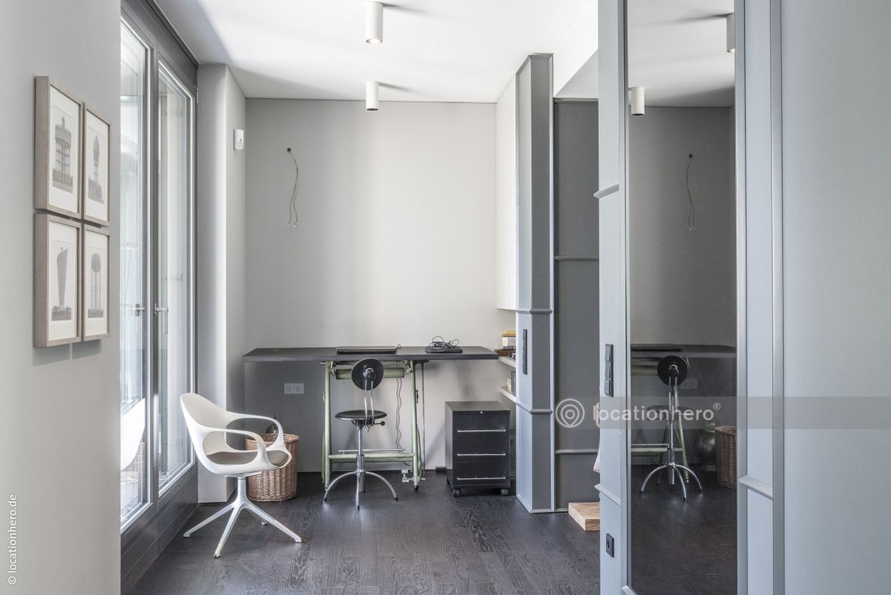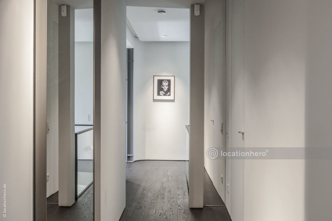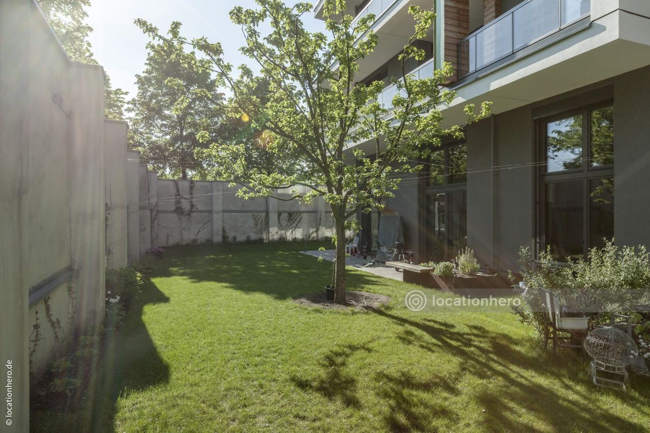 Aufwändig gestaltetes Architektenloft mit 4 Meter Höhe und viel Raum für Produktionstechnik und besondere Perspektiven. Die ebenerdige Wohnung ist umgeben von einer Rasenfläche und einer Mauer. Die Hintergründe sind abwechslungsreich in Farbton und Textur, die Materialien hochwertig.