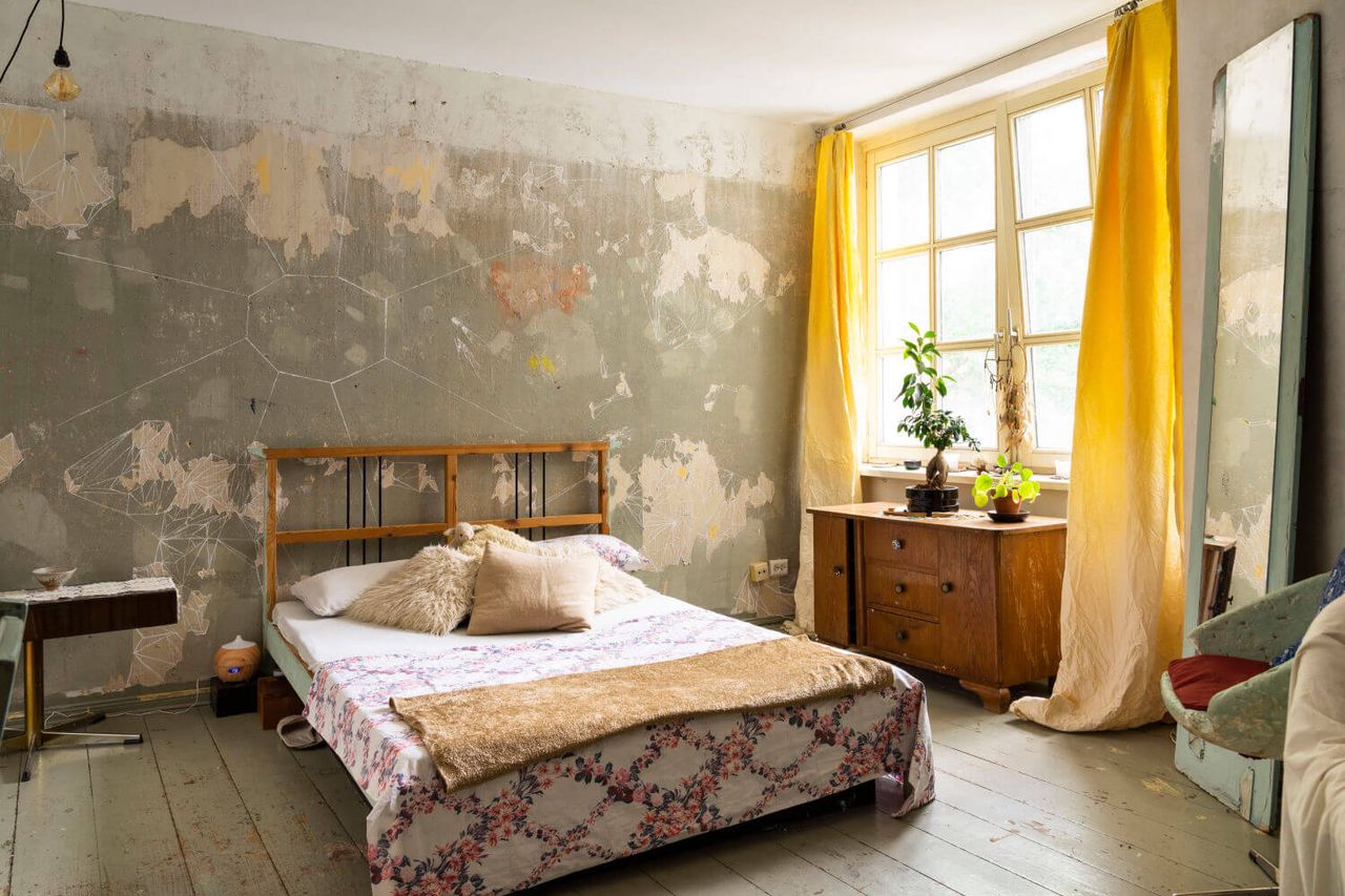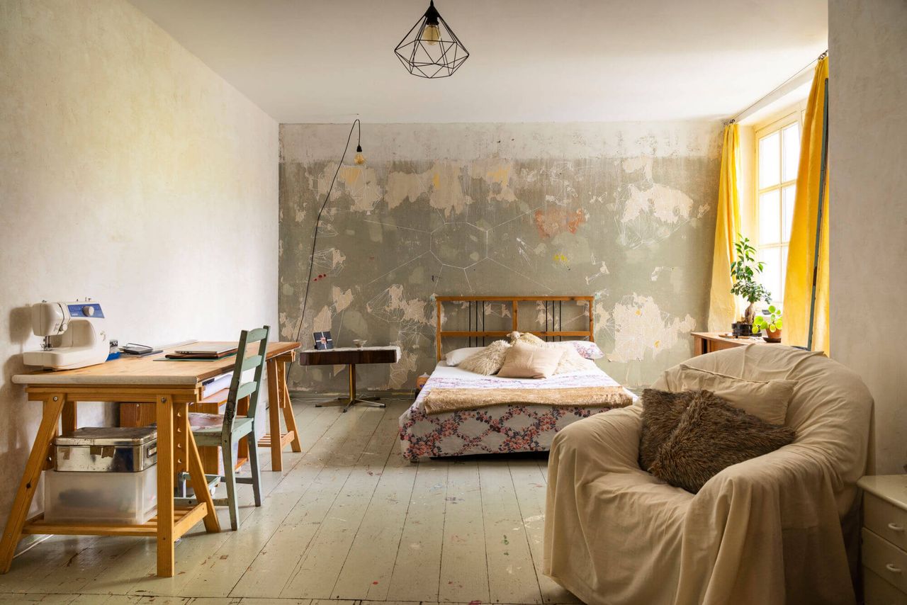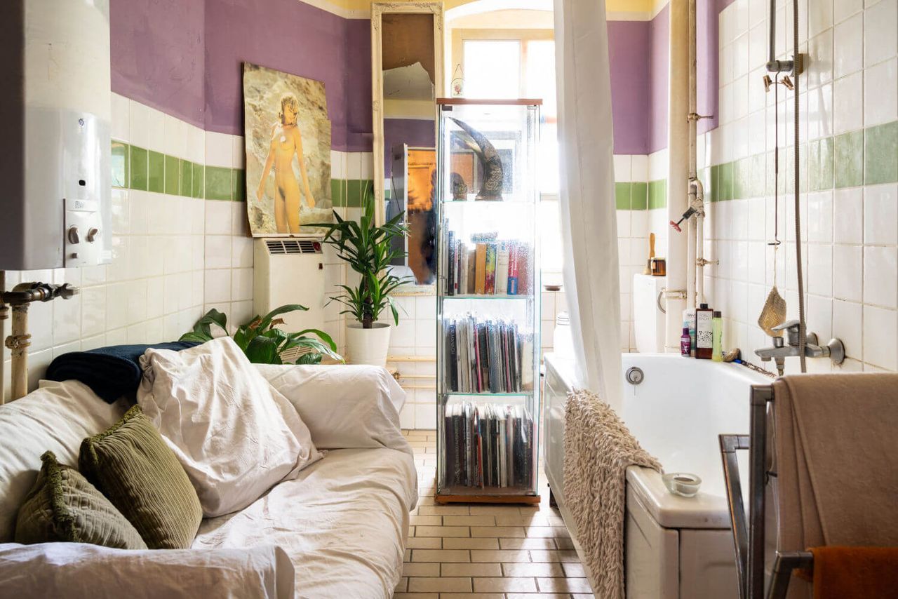 Taking inspiration from her own work as a jewellery designer, the owner of this Home Studio has scratched the bedroom walls with the jagged forms of crystals and filled the entire space with eclectic embellishments . The spacious green-tiled bathroom also leads a double life, additionally playing the part of living room and library, with its sofa, bookshelves, paintings and potted plants. Yet despite the worn furniture, fading fabrics and vintage details, the rust and the rough come together elegantly, creating a set that is authentically shabby chic and interesting to explore.