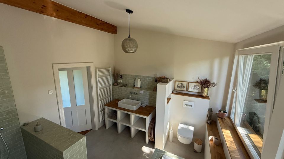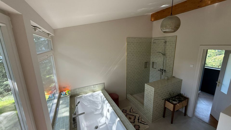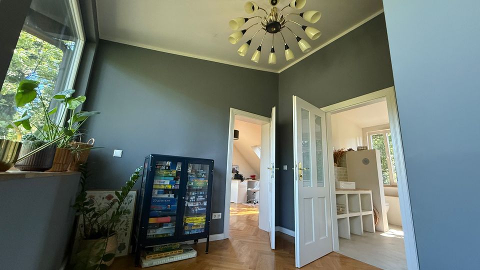 Einfamilienhaus auf großem 1000m2 Grundstück mit hohen Bäumen. Deckenhöhe im Wohnzimmer und Essbereich 4,8m. Einrichtung Bauhaus. Das Haus besticht durch die Farbauswahl, die Grundrissgestaltung und die Einzigartigkeit der Immobile. Es ist farblich und gestalterisch aufeinander abgestimmt eingerichtet und begeistert die Besucher immer