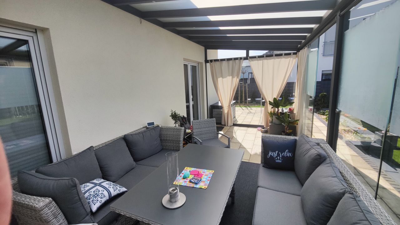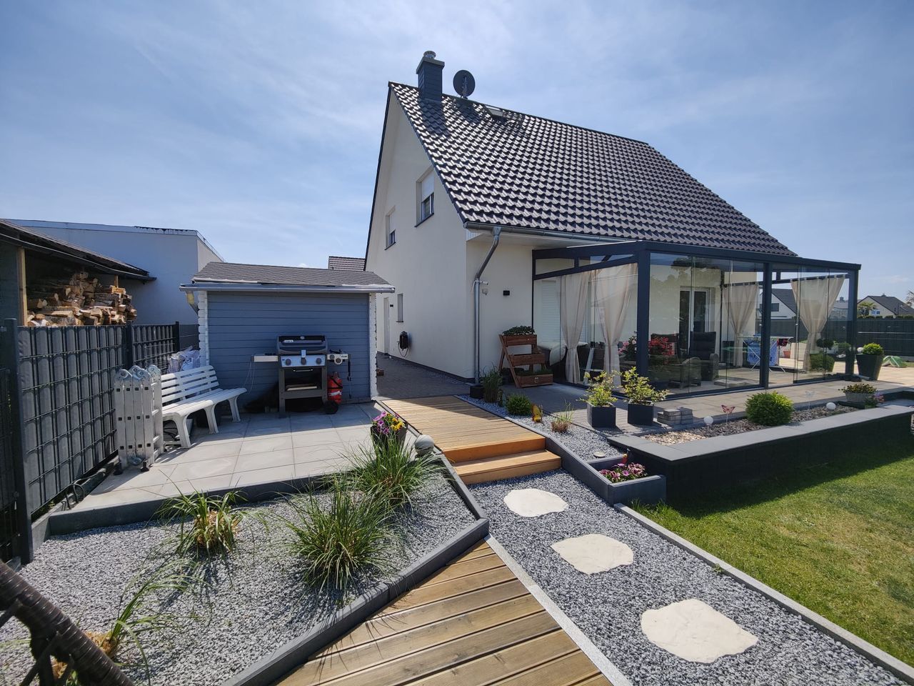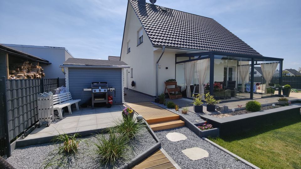 Zum Haus gehört ein Wintergarten, ein eingelassener Pool im Garten mit extra Sitzecke und für den Winter ein Whirlpool. Im Haus selbst strahl unser Kamin wohlige Wärme aus.