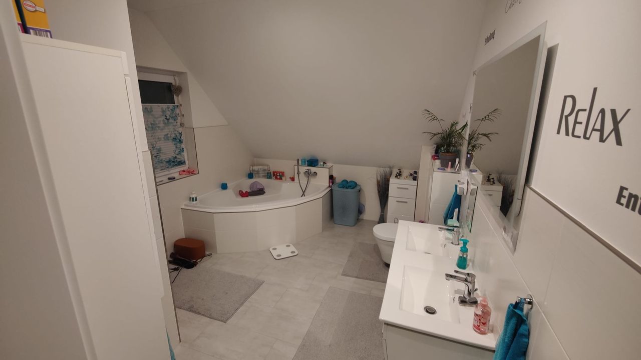 OG: Kinderzimmer ( Mädchen rosa ), Schlafzimmer, Arbeitszimmer und Bad mit Dusche und Eckbadewanne