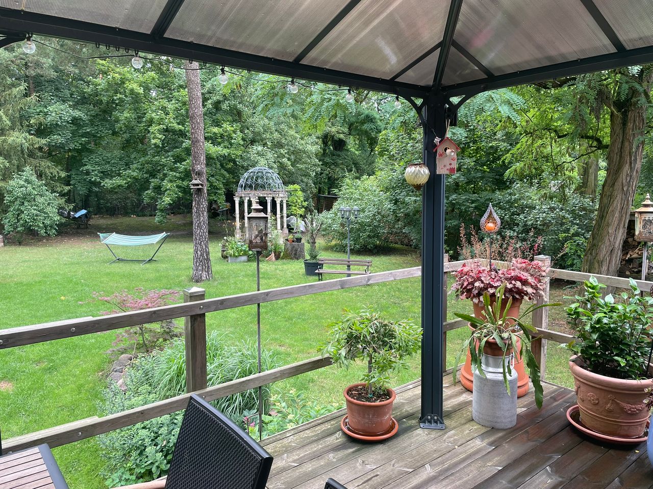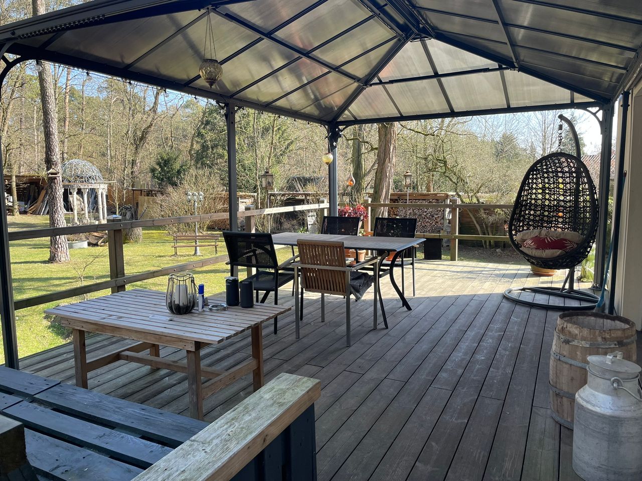 Auf dem Grundstück gibt es einen Schuppen, Carport, Unterstellmöglichkeiten, erhöhte überdachte Terrasse am Haus, Gartenpavillon mit Säulen.