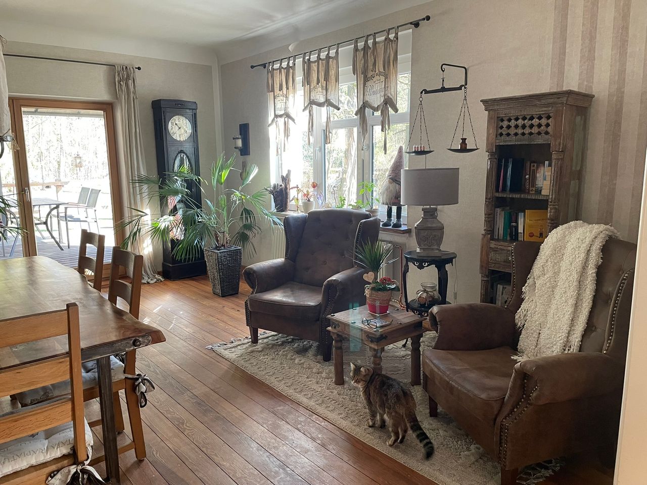 Küche und Esszimmer sind nur durch eine große Schiebetür voneinander getrennt. Vom Esszimmer kommt man auf die Terrasse und in den parkähnlichen Garten.