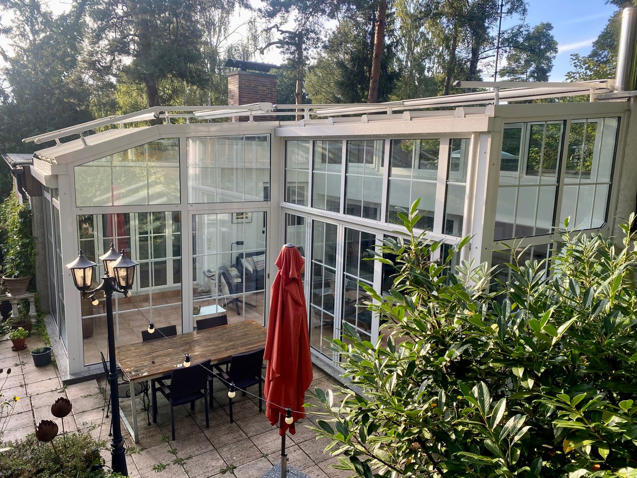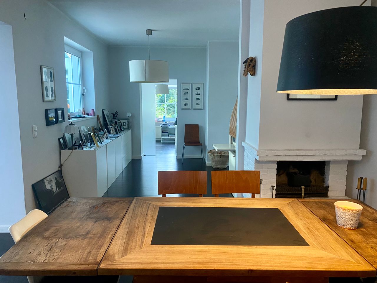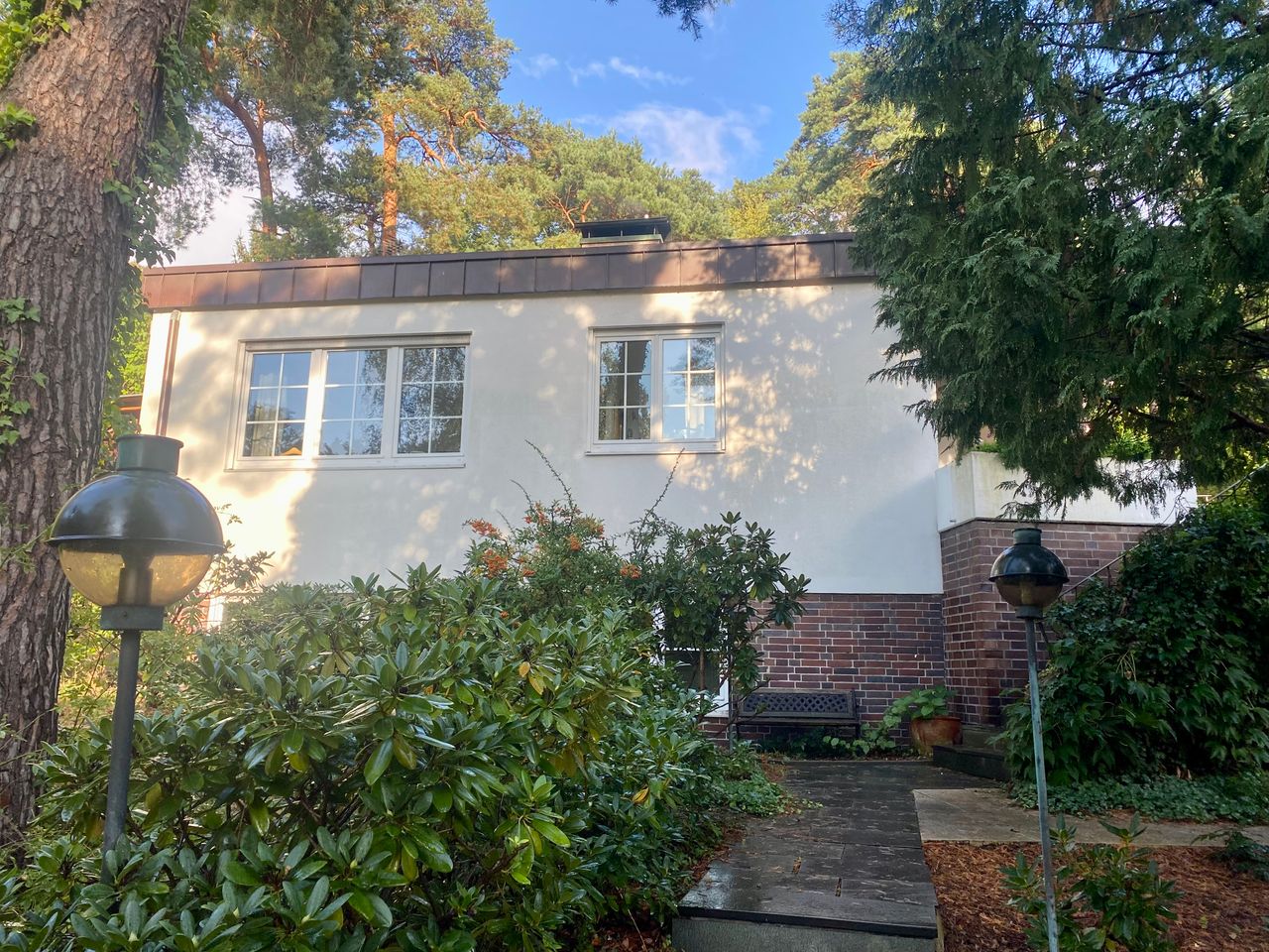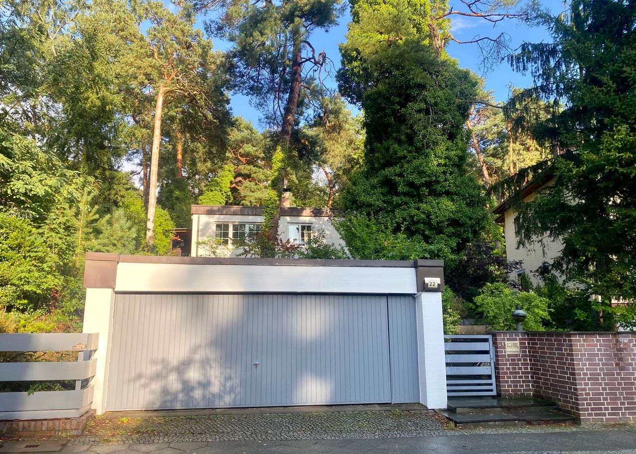Der alte 30-er-Jahre-Bungalow wurde modern renoviert und ist mit einem sehr großen Wintergarten, offener Küche und Esszimmer, zwei Kaminen und einer Sauna ausgestattet. Dunkles Holzparkett, grau gestrichene Wände im Erdgeschoss, Souterrain helles Parkett und weiße Wände. 1000 qm Garten mit altem Baumbestand (vor allem Kiefern) und einem Gartenhaus.
