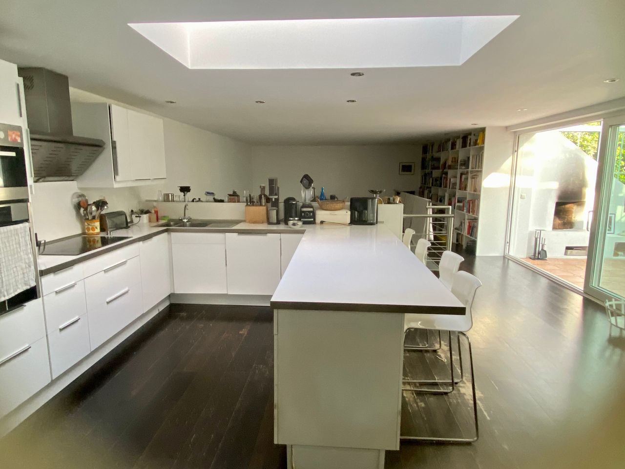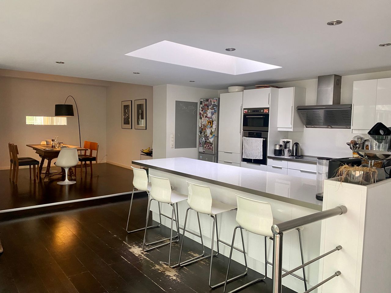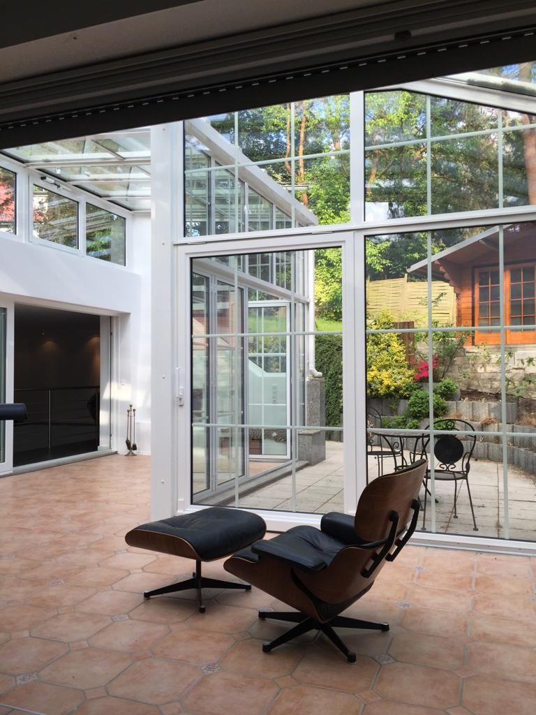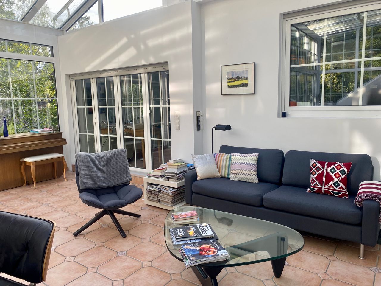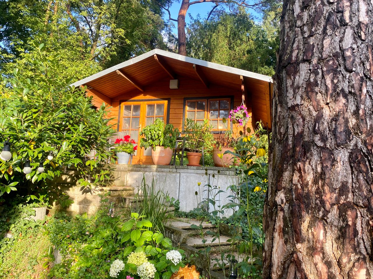 Der alte 30-er-Jahre-Bungalow wurde modern renoviert und ist mit einem sehr großen Wintergarten, offener Küche und Esszimmer, zwei Kaminen und einer Sauna ausgestattet. Dunkles Holzparkett, grau gestrichene Wände im Erdgeschoss, Souterrain helles Parkett und weiße Wände. 1000 qm Garten mit altem Baumbestand (vor allem Kiefern) und einem Gartenhaus.