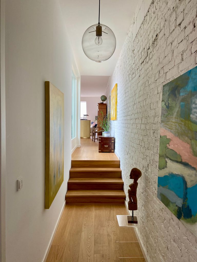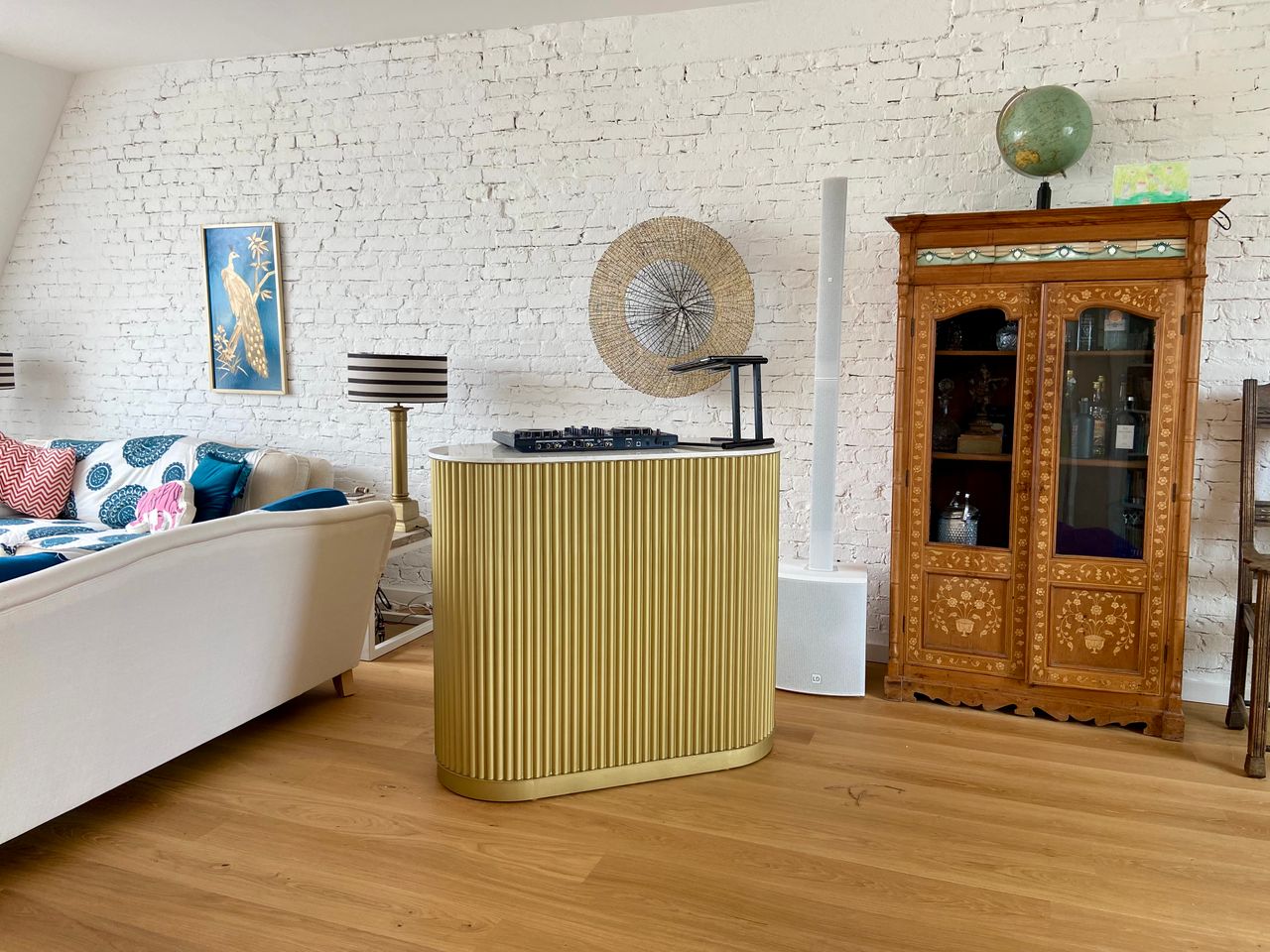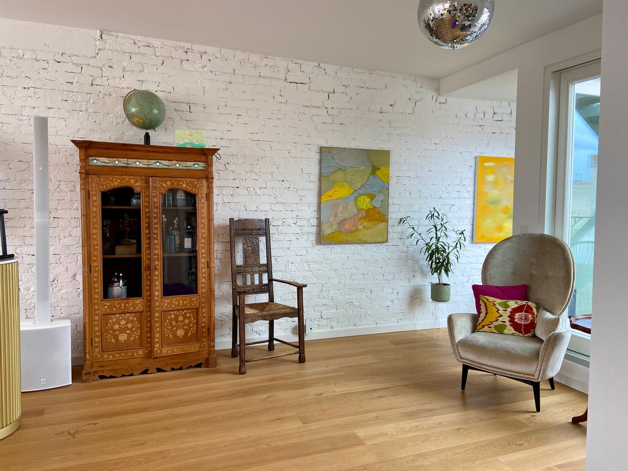 Die Einrichtung: Diskokugel, DJ Setup, Designermöbel, Kunst an den Wänden, Eichenfussboden, Bücherwand.