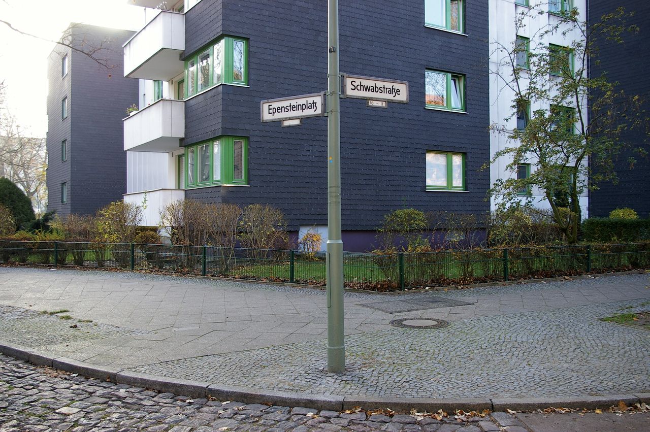 Der Epensteinplatz liegt an Schwab- und Epensteinstraße. Die Häuser sind zum Teil zum Platz hin gerundet.