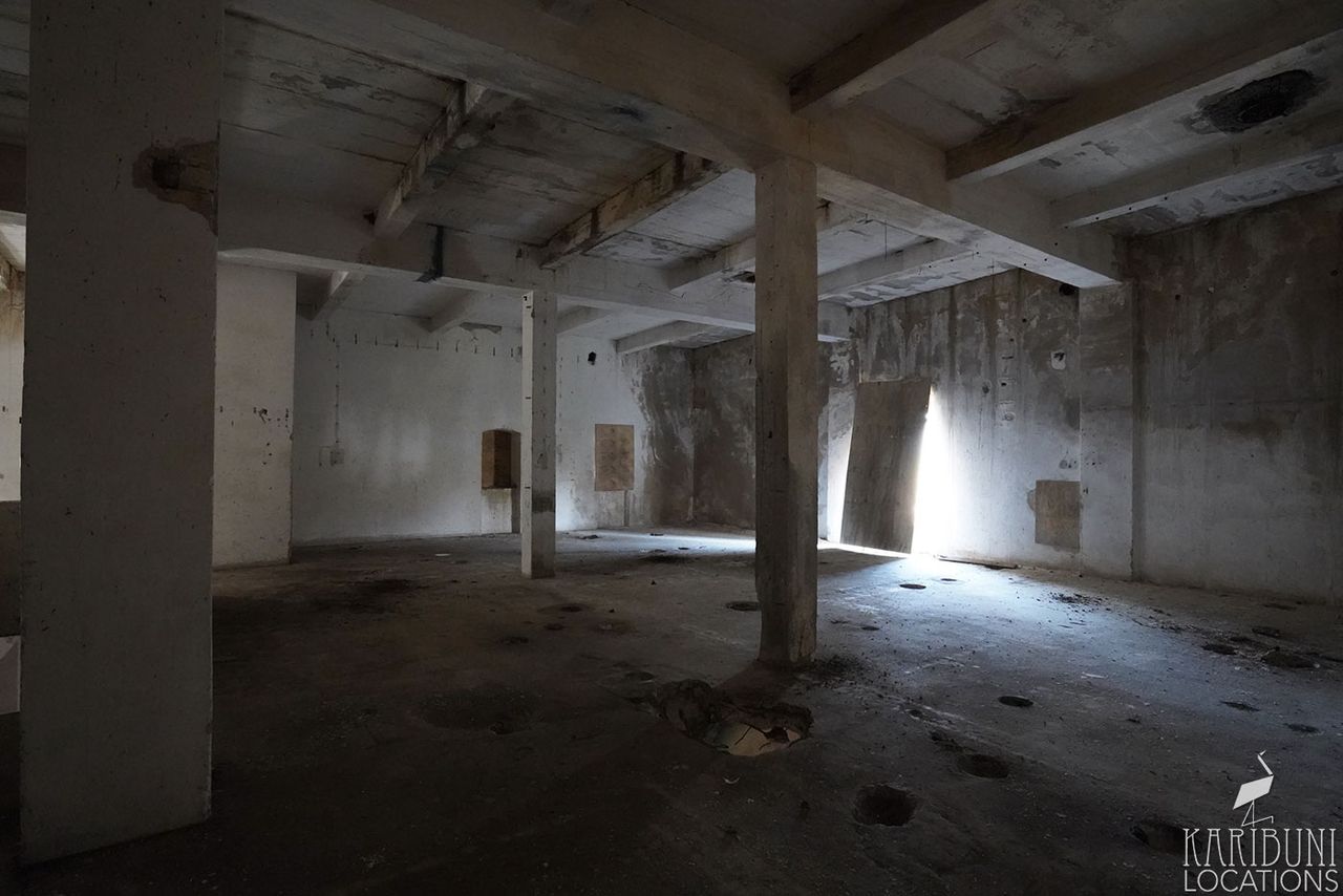 Das ehemalige Brauhaus erinnert äußerlich an einen Bunker: Nur durch schmale Spalten fällt spärliches Licht ins Innere und erzeugt eine beklemmend düstere, nahezu unheimliche Atmosphäre.