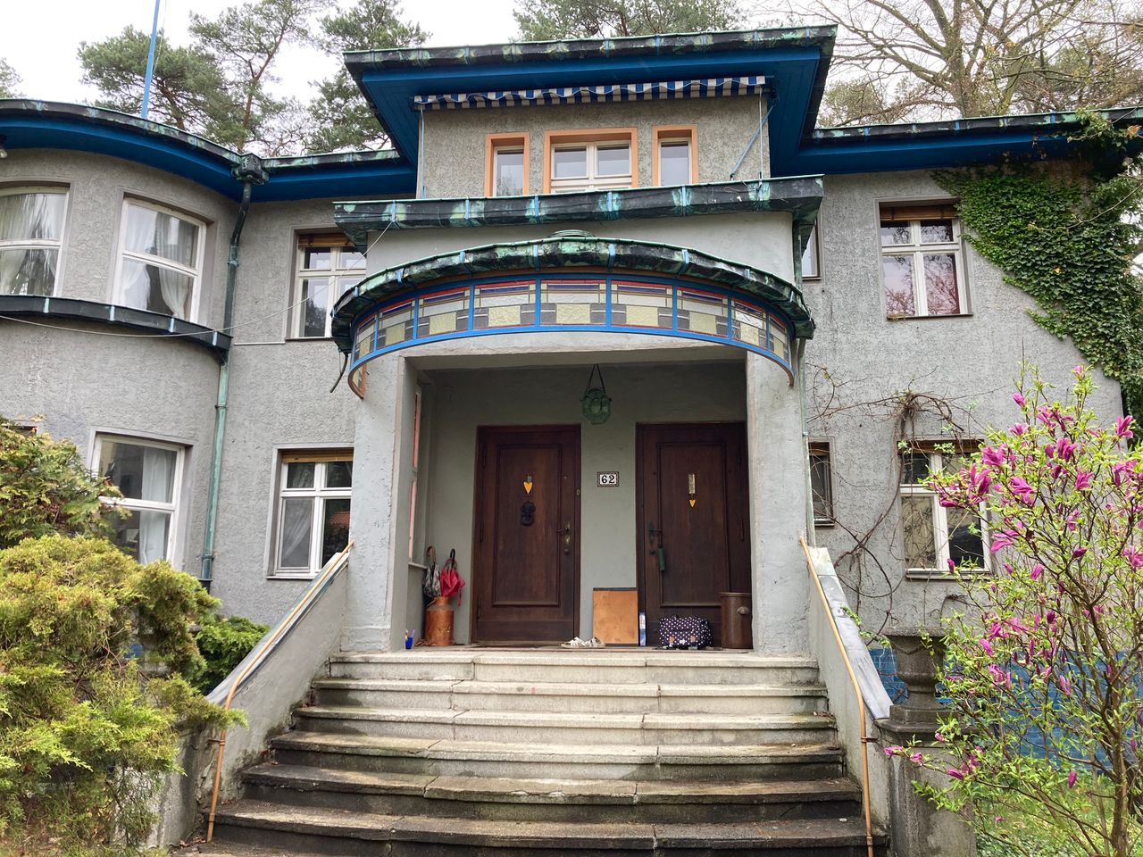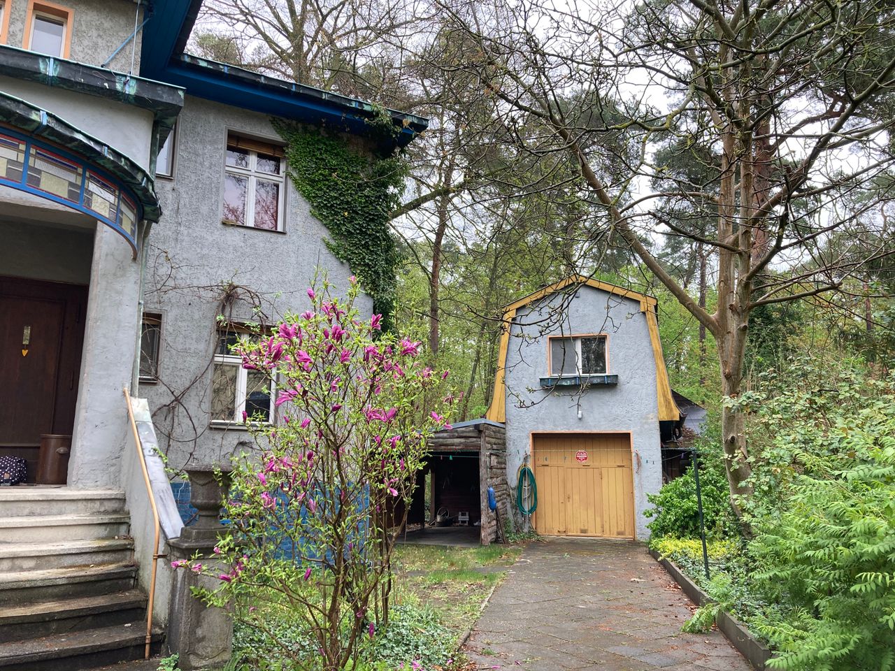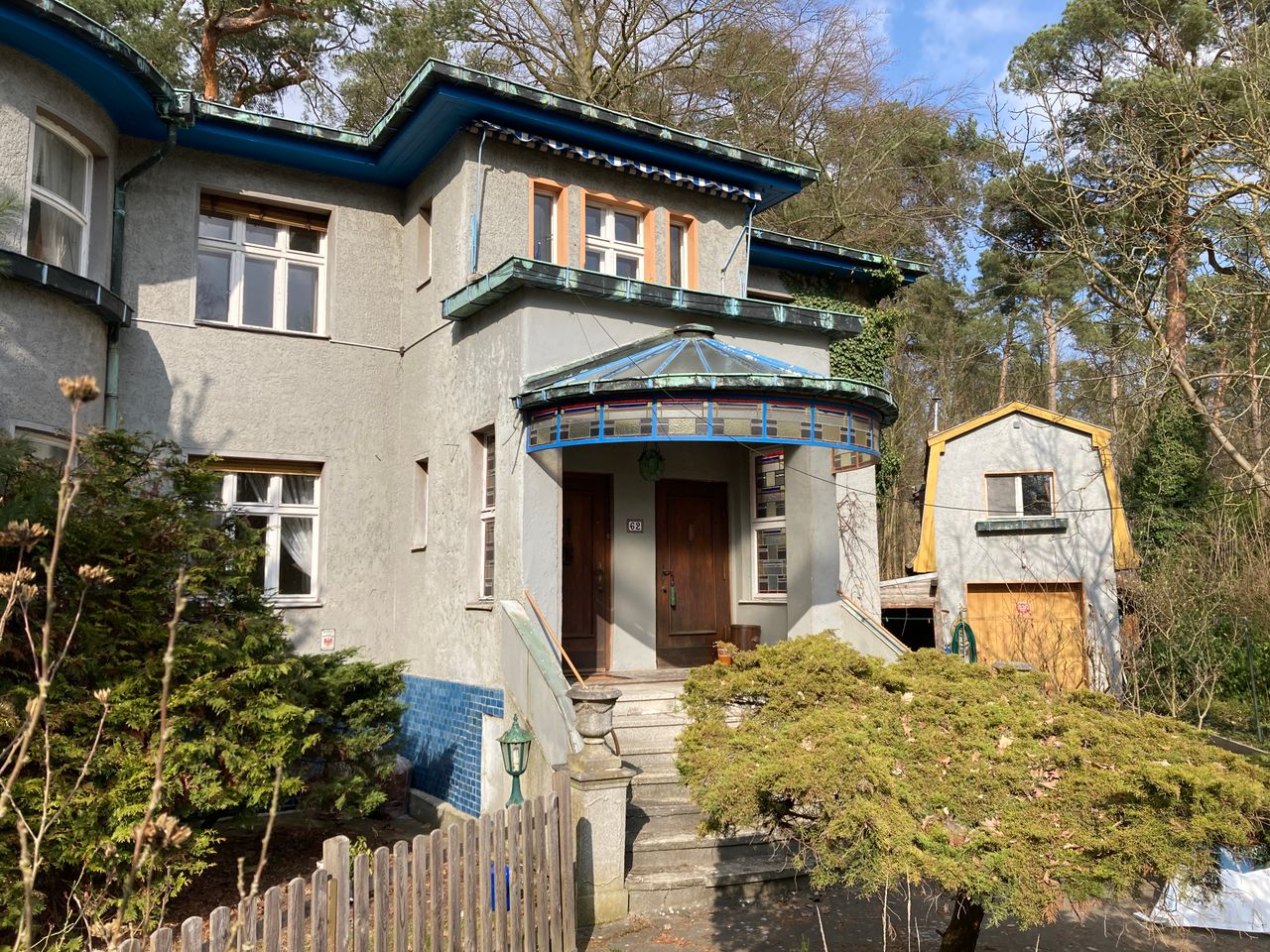 Markante Fabrikantenvilla aus den 1930-er-Jahren mit Freitreppe und schönen Glasdächern. Runder Vorbau und zwei Balkone (EG zum Wald und OG zur Straße). Flur im maritimen Stil, Keller mit viel Werkzeug und Drehbank. Freistehendes Garagenhaus auf dem Grundstück. Auf der Rückseite des Hauses Wald, nach vorne heraus und über die Straße die Havel. Parkett- und Dielenboden.