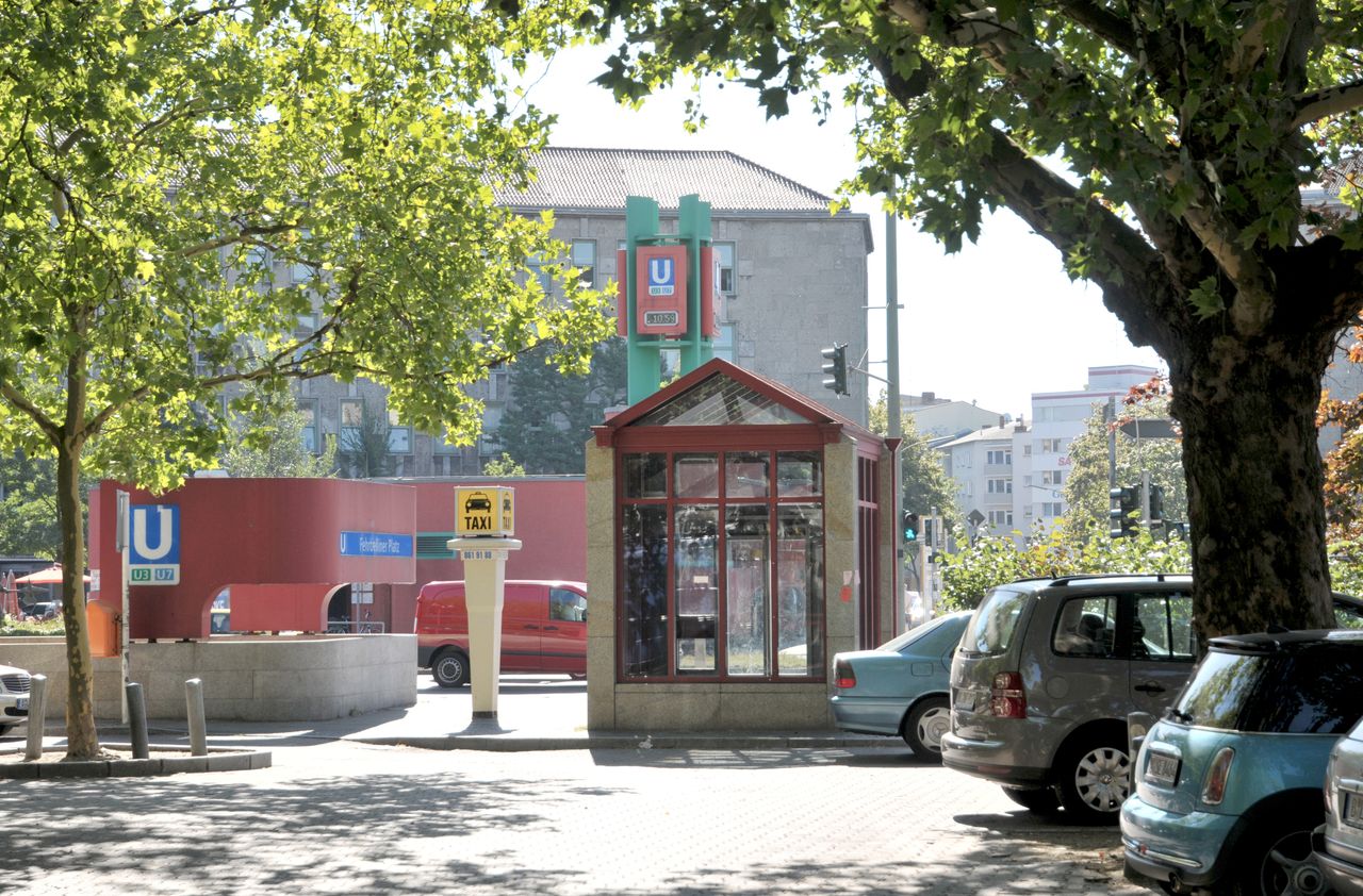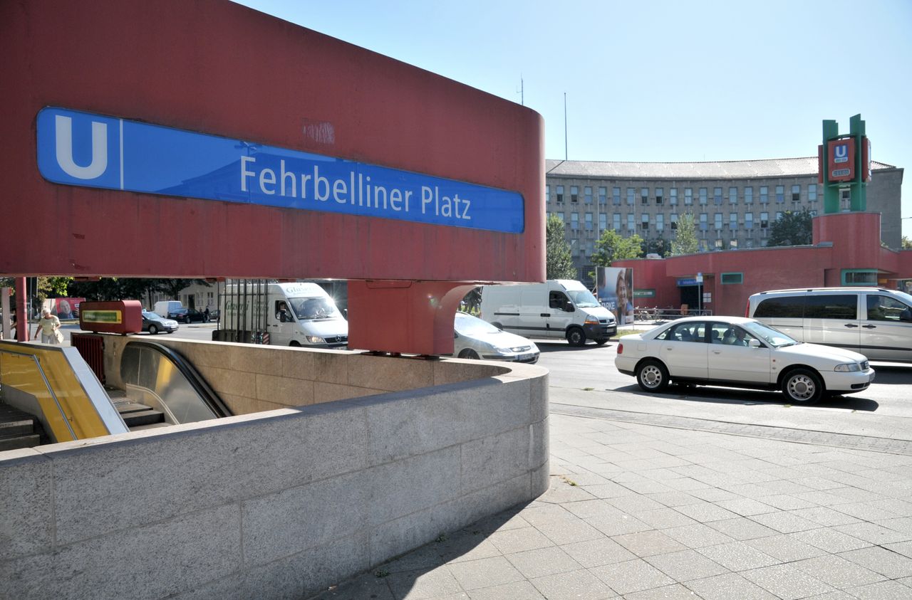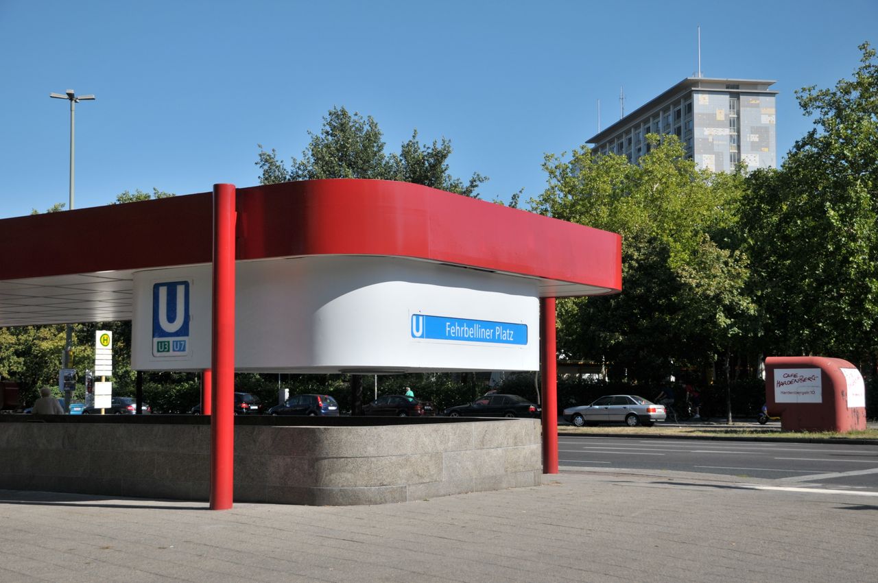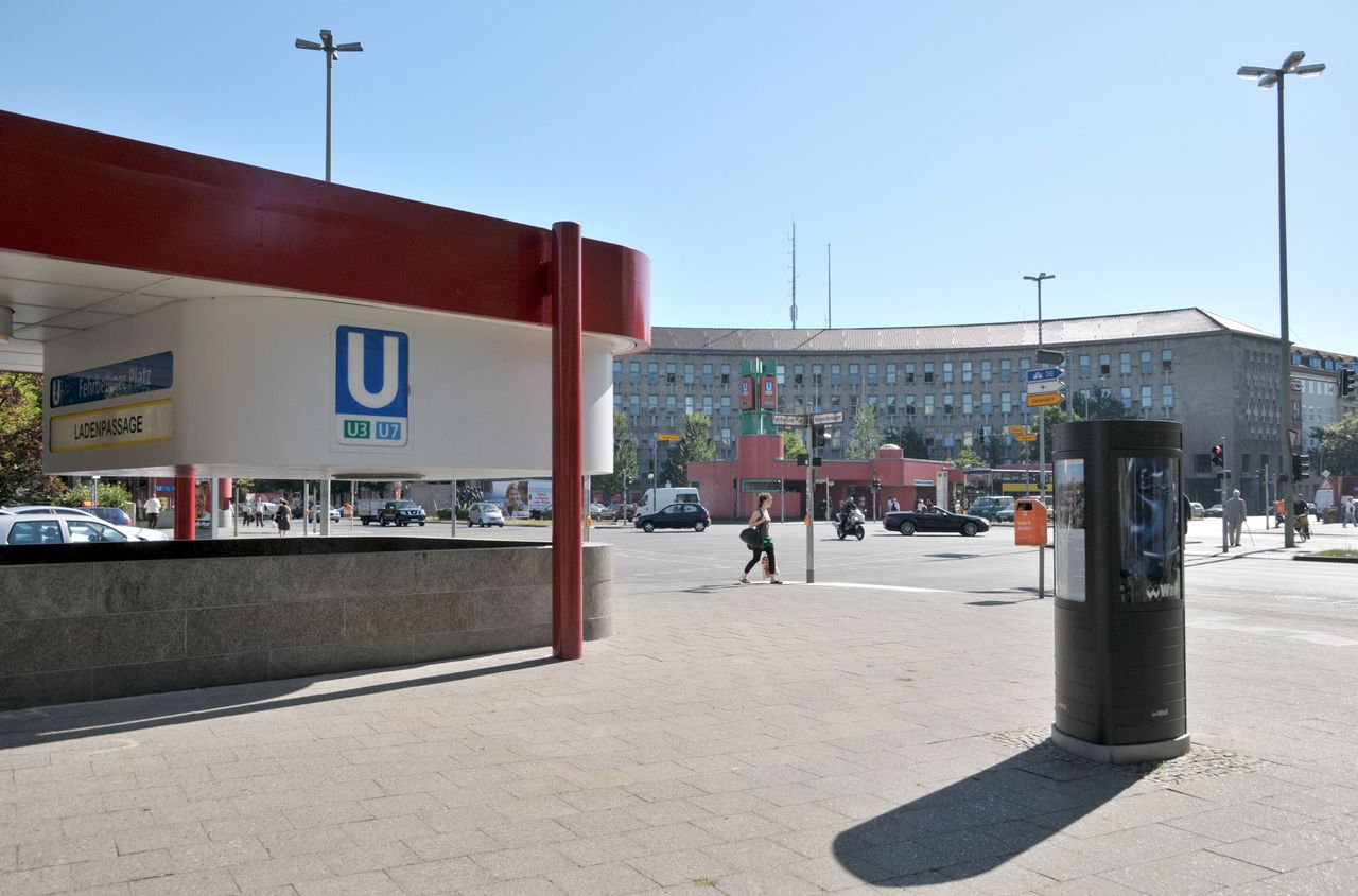 Stark befahrener Platz umsäumt von Ämtern und Wohnhäusern. Besonders auffällig sind das rot geflieste Eingangsgebäude zur U-Bahn Linie 7 und das Ratshaus Wilmersdorf