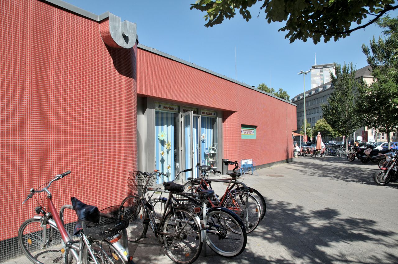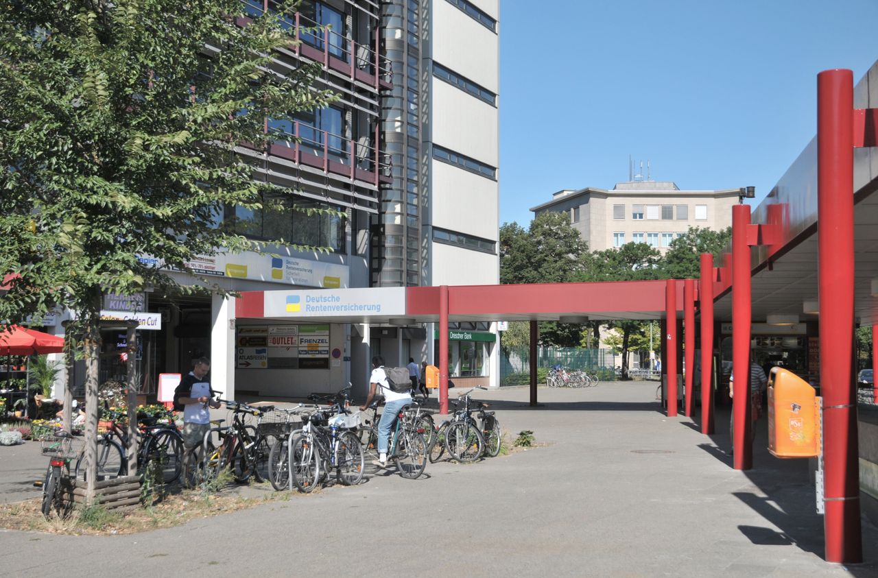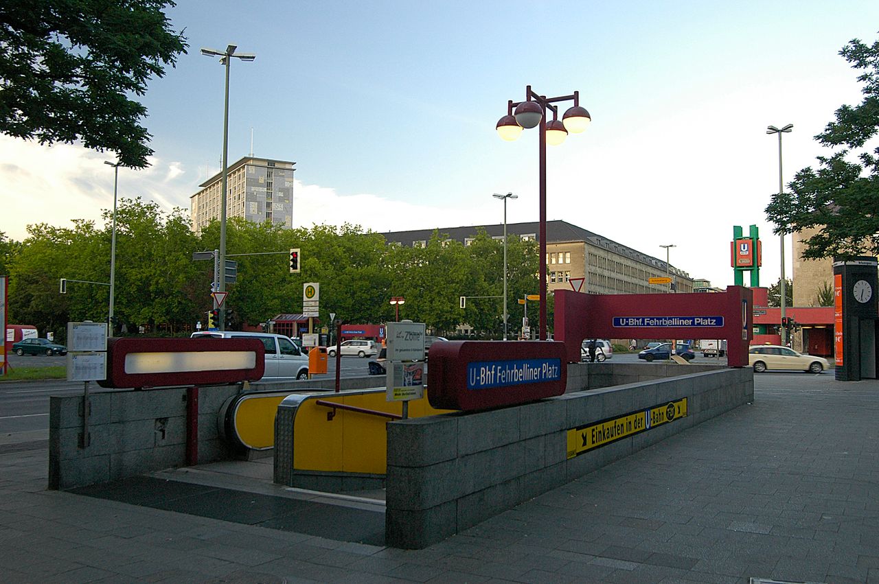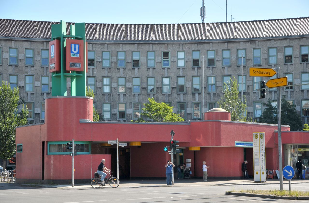 Stark befahrener Platz umsäumt von Ämtern und Wohnhäusern. Besonders auffällig sind das rot geflieste Eingangsgebäude zur U-Bahn Linie 7 und das Ratshaus Wilmersdorf