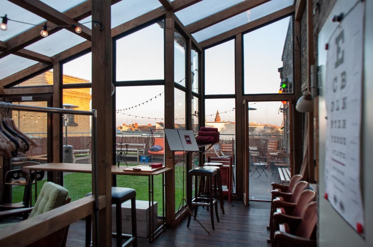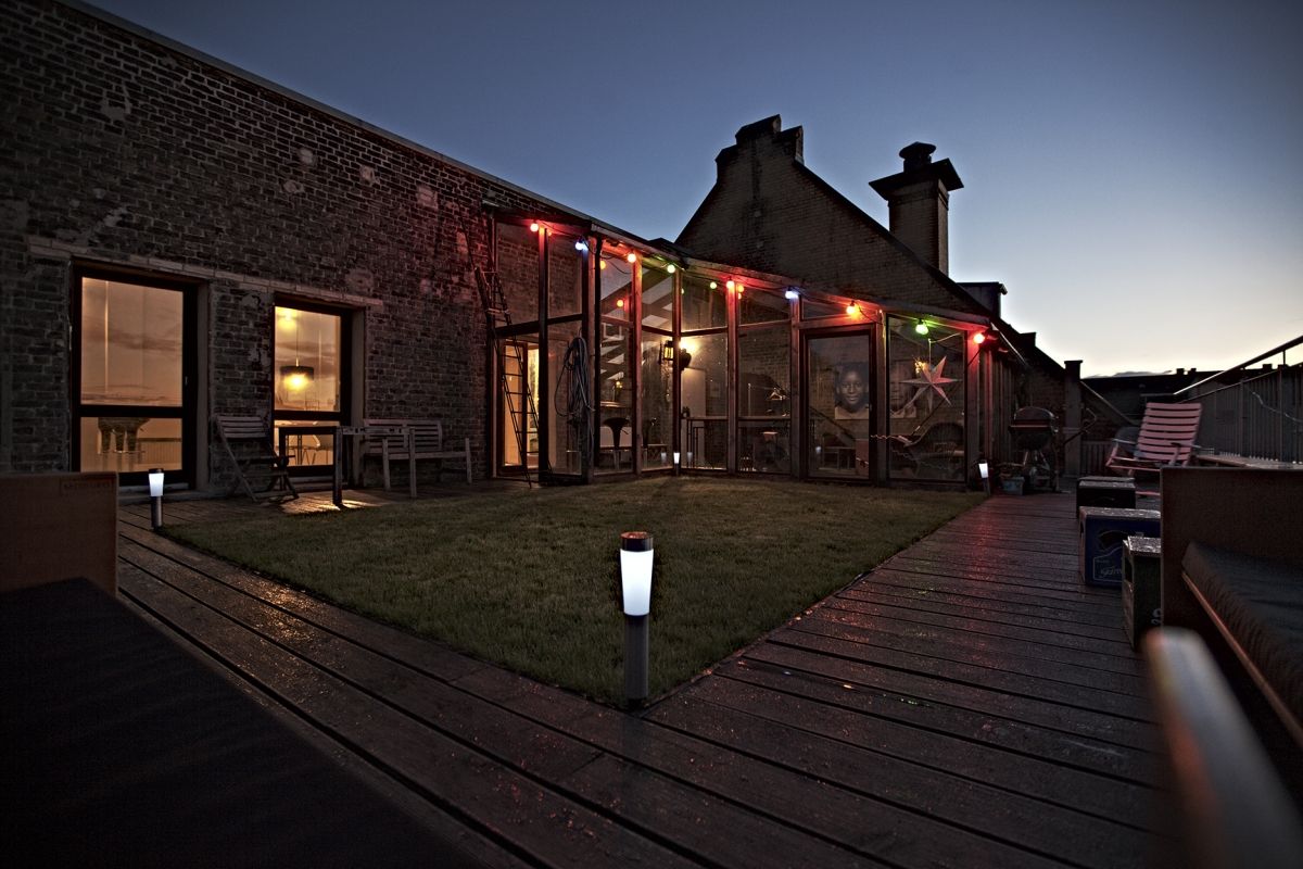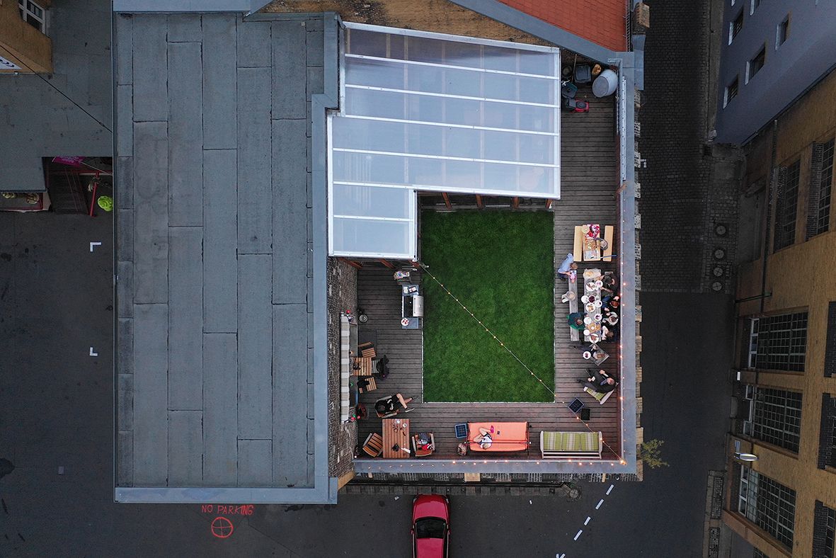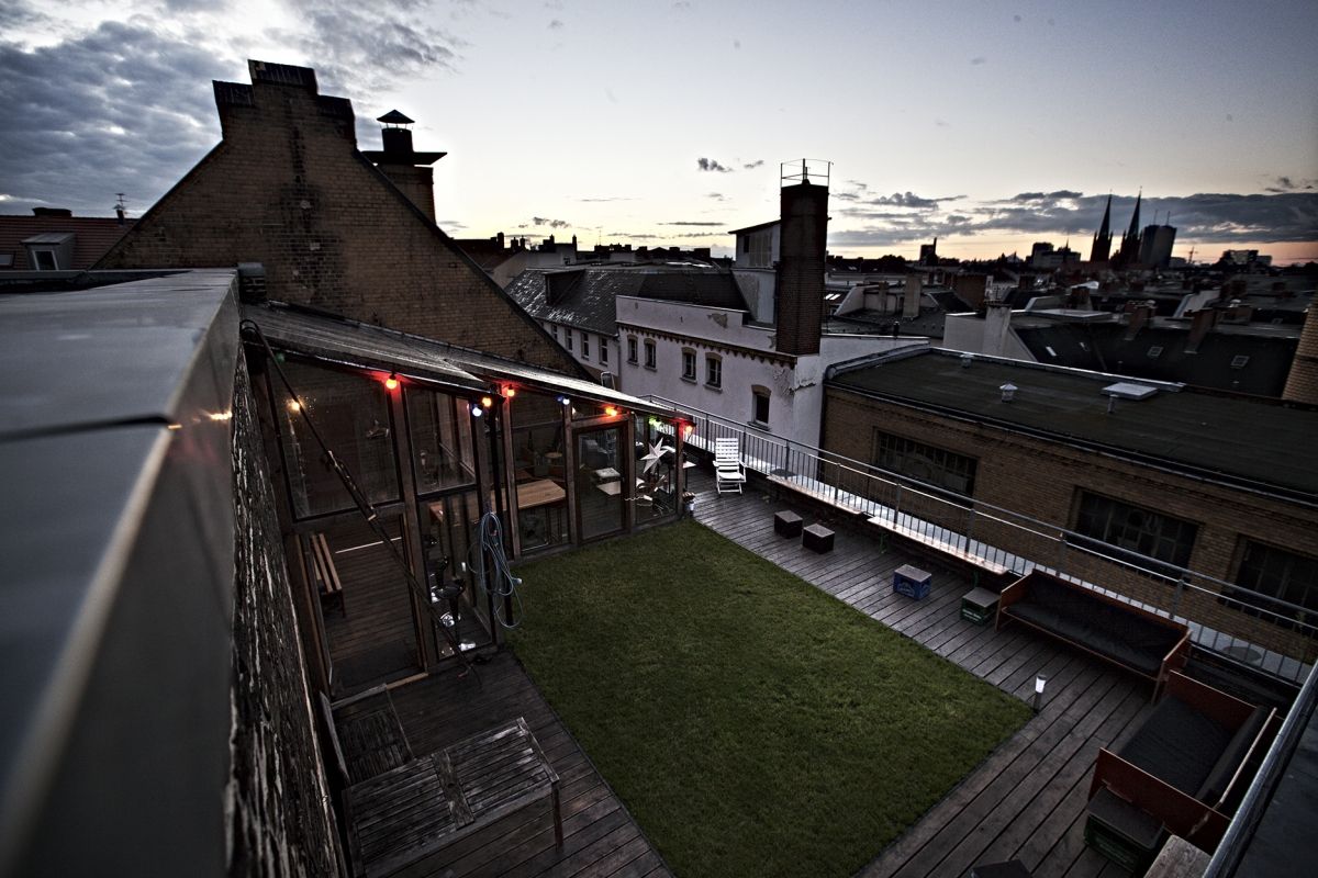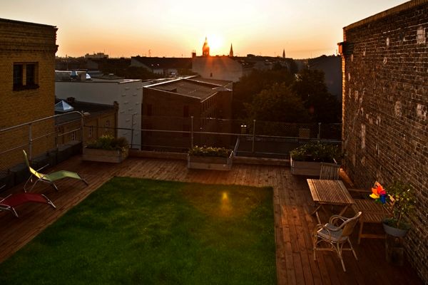 100qm Gesamtgrösse Dachgarten bzw Dachterrasse mit 25qm Wiese und 35 qm grossem Wintergarten und Blick über die Stadt.