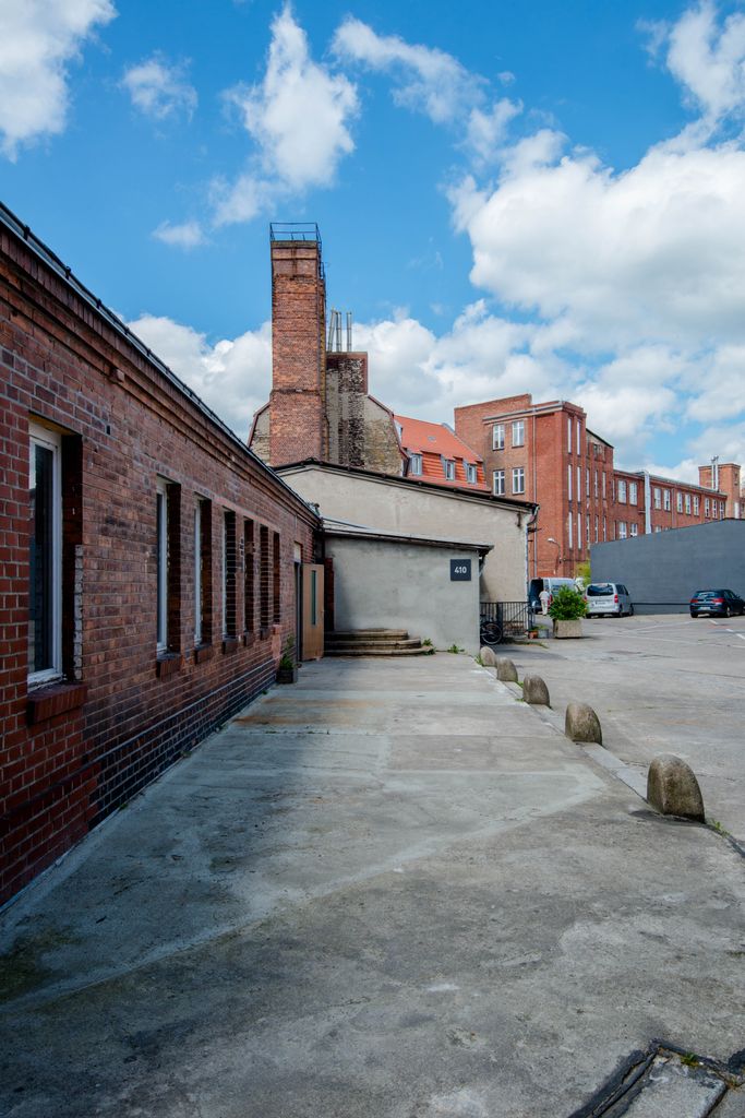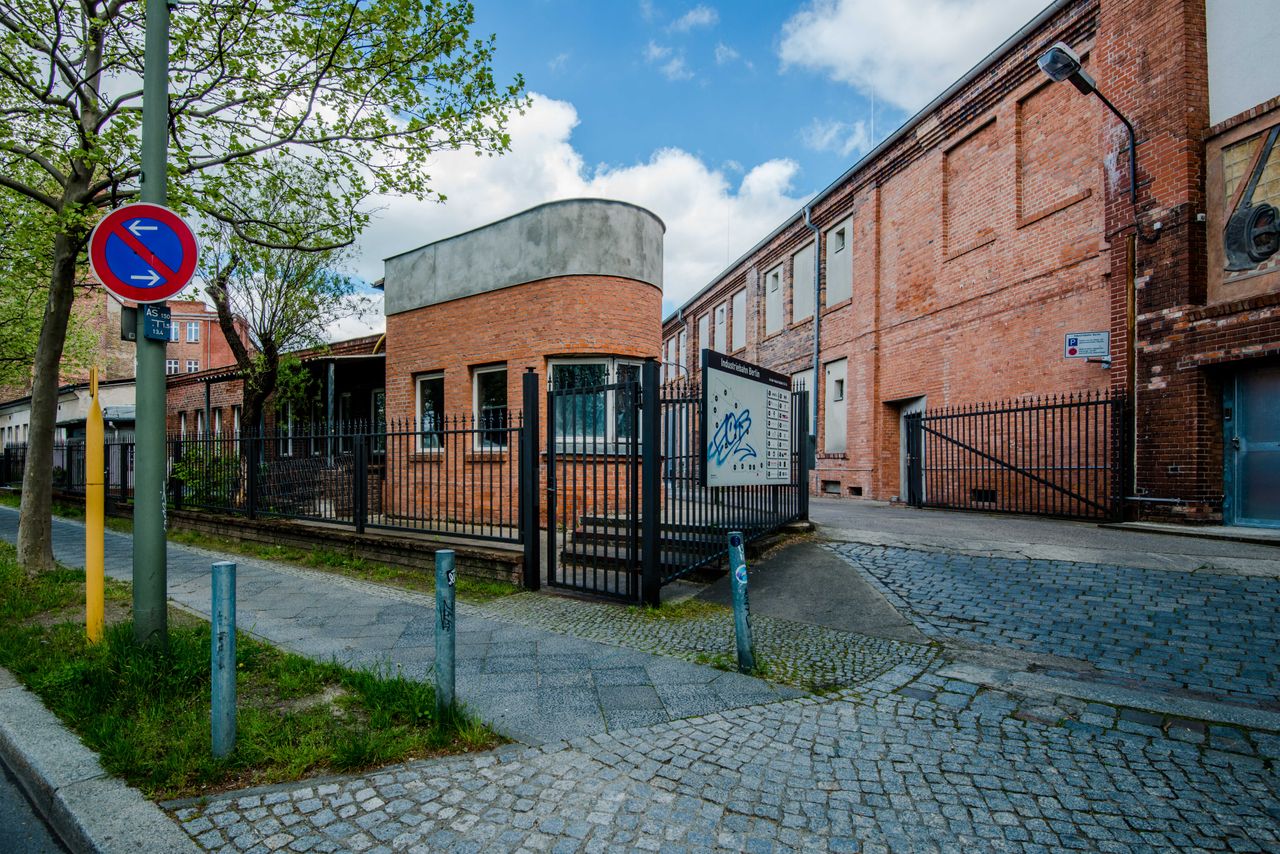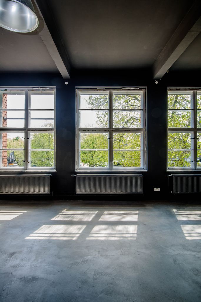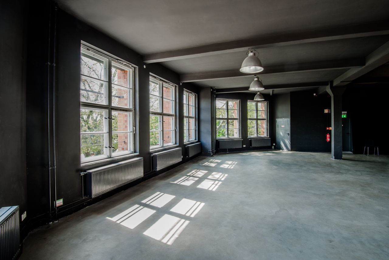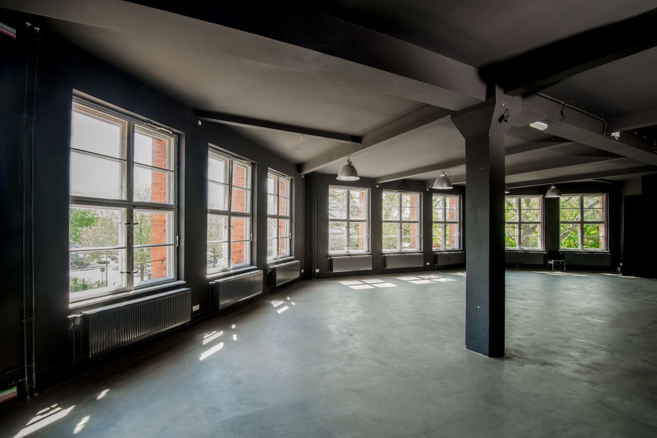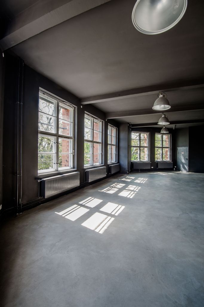 Die 200 qm große Studiofläche liegt im ersten Stock, angrenzend an die große Halle des Motorwerks. Der Studioboden ist aus grauem Sichtbeton, Wände und Decken sind schwarz gestrichen. Das Fotostudio kann mit schwarzen Rollos fast vollständig verdunkelt werden.