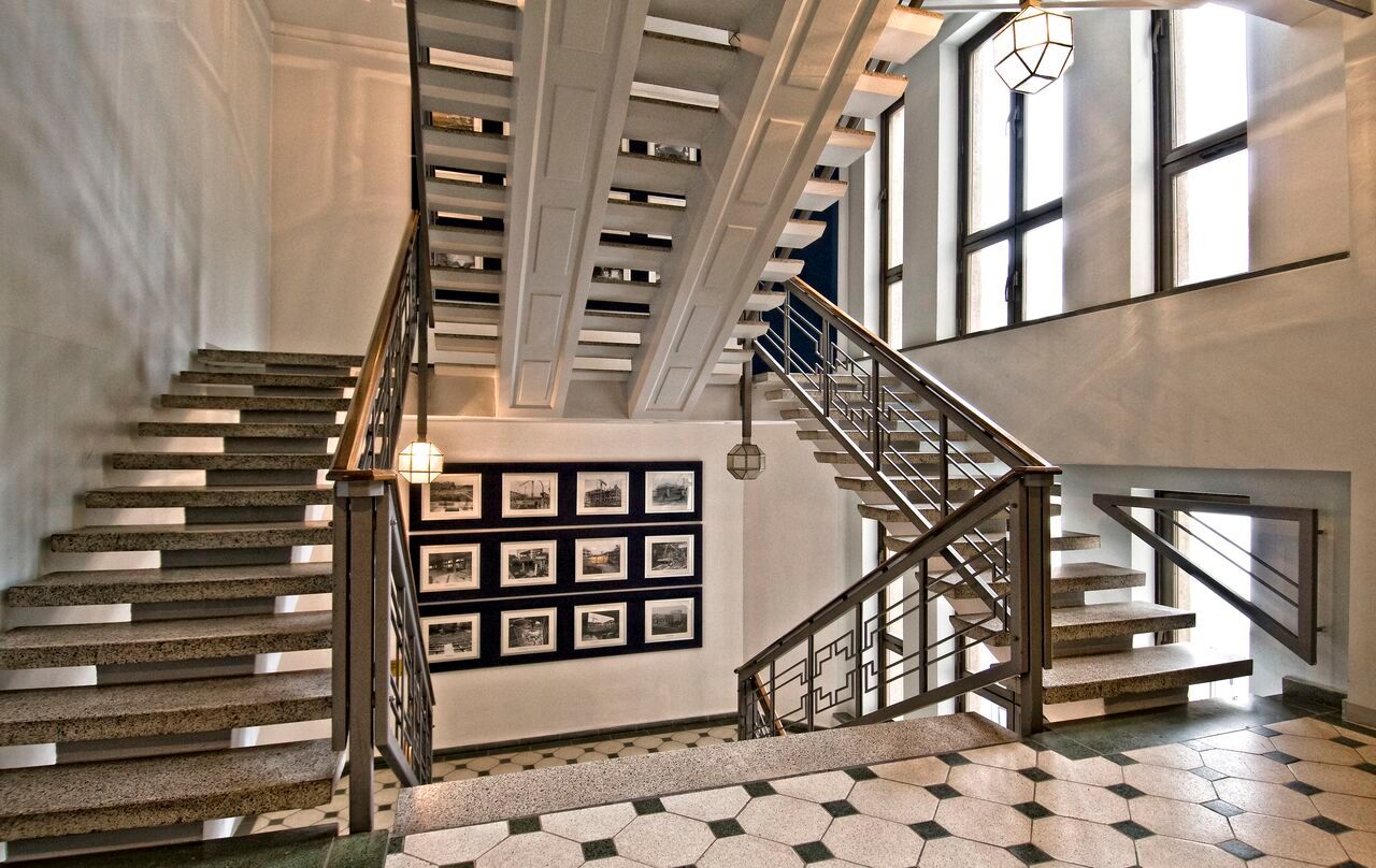 Dem Foyerkörper als dem Gesicht des Baus ist eine ornamentierte Wetterschale aus Formbetonplatten mit eingelegten farbigen Glasprismen vorgeblendet.