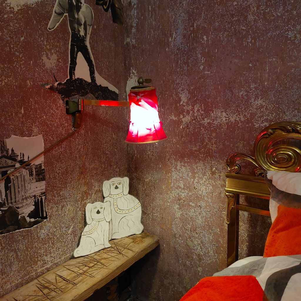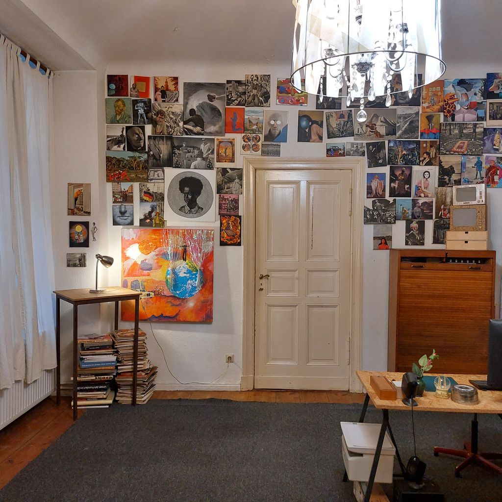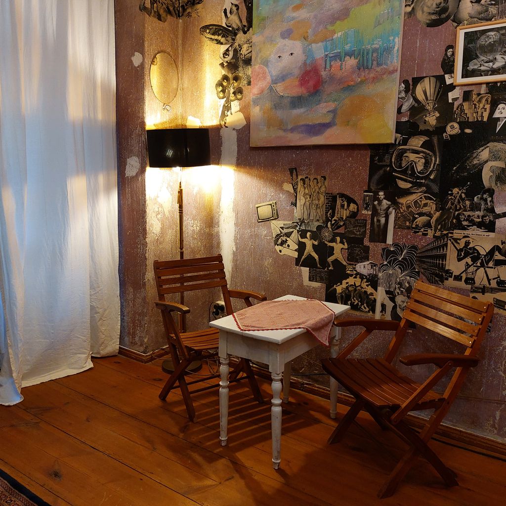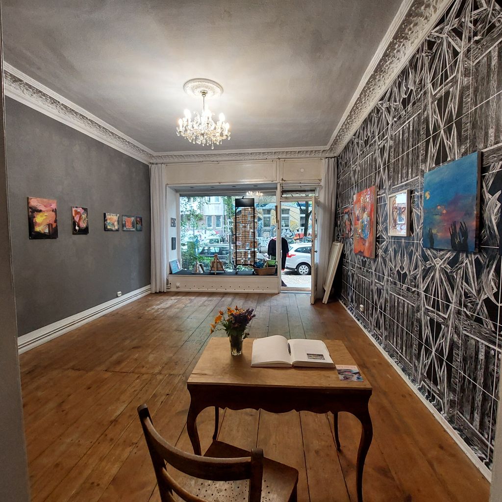 Dahinter ist eine großzügige Ladenwohnung mit Badezimmer. Hinter dem Galerie/Ladenraum befindet sich die Küche die von einem Künstler mit Holzklebefolien gestaltet wurde und viele Kunstwerke zeigt. Es folgt ein großes Wohnzimmer (Berliner Zimmer) mit Ledersofa, Schreibtisch, Teppich und Kronleuchter. Am Schluss schließt ein Schafzimmer mit zwei großen Fenstern zum Hof an. Dieses ist mit einem mit geschwungenen Messing Rahmen -Kingsize Bett , einem Teppich, eine Kommode, einem gr0ßen Spiegel und einem Teppich ausgestattet. Die Wände sind hier (roher alter Putz durch entfernte Tapeten) mit einer raumgreifenden schwarz-weiß Collage bedeckt.