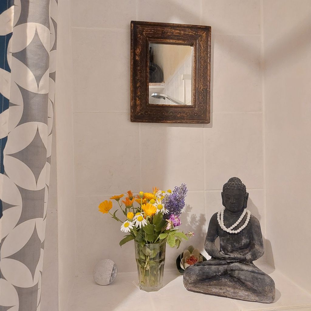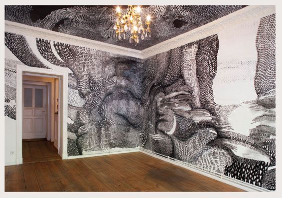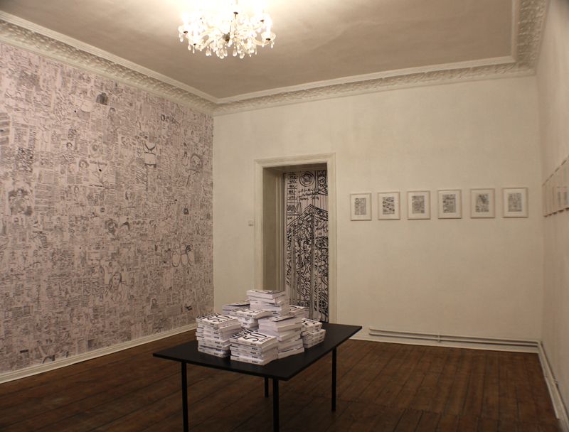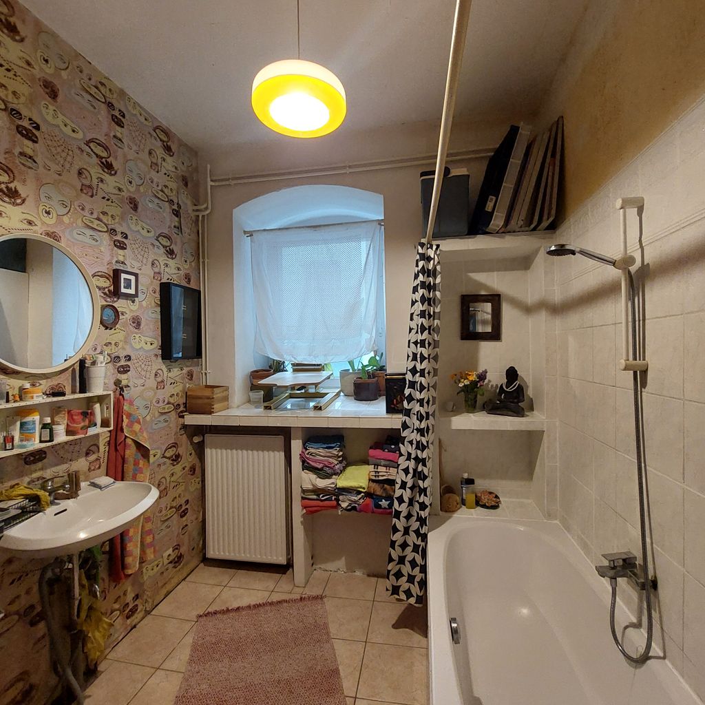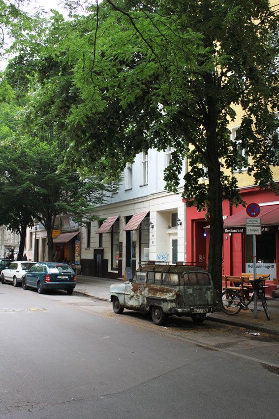 Dahinter ist eine großzügige Ladenwohnung mit Badezimmer. Hinter dem Galerie/Ladenraum befindet sich die Küche die von einem Künstler mit Holzklebefolien gestaltet wurde und viele Kunstwerke zeigt. Es folgt ein großes Wohnzimmer (Berliner Zimmer) mit Ledersofa, Schreibtisch, Teppich und Kronleuchter. Am Schluss schließt ein Schafzimmer mit zwei großen Fenstern zum Hof an. Dieses ist mit einem mit geschwungenen Messing Rahmen -Kingsize Bett , einem Teppich, eine Kommode, einem gr0ßen Spiegel und einem Teppich ausgestattet. Die Wände sind hier (roher alter Putz durch entfernte Tapeten) mit einer raumgreifenden schwarz-weiß Collage bedeckt.