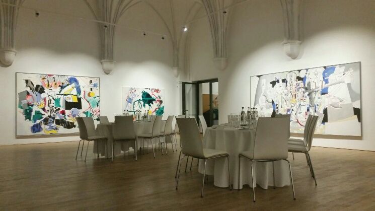 Großer Ausstellungsraum mit Kuppeldecke (8m) (Gotischer Saal, gebaut von Schultheißbrauerei) mit Flügel, angrenzender Galerieraum mit Empore, Schreibtisch und Regale, im Untergeschoss Bilderlager, Küchenzeile, Toiletten, je 2, Atelier
