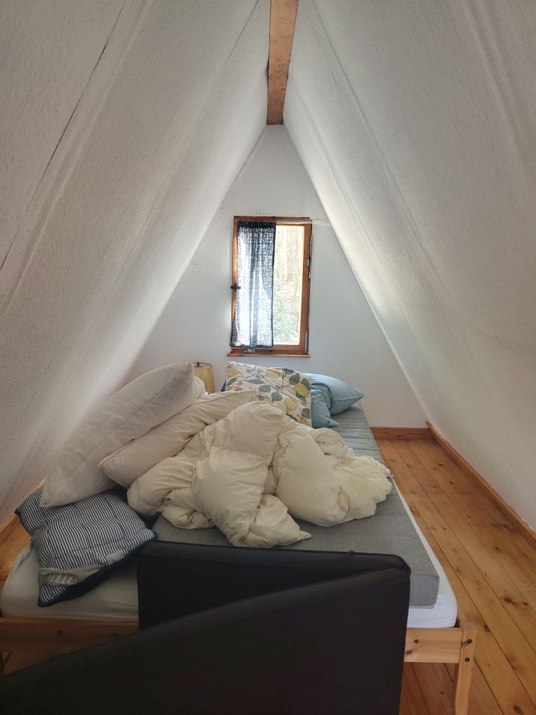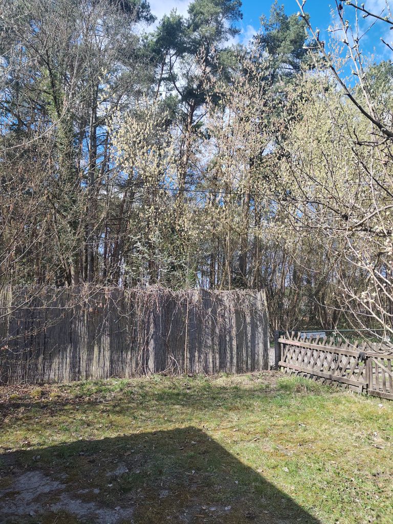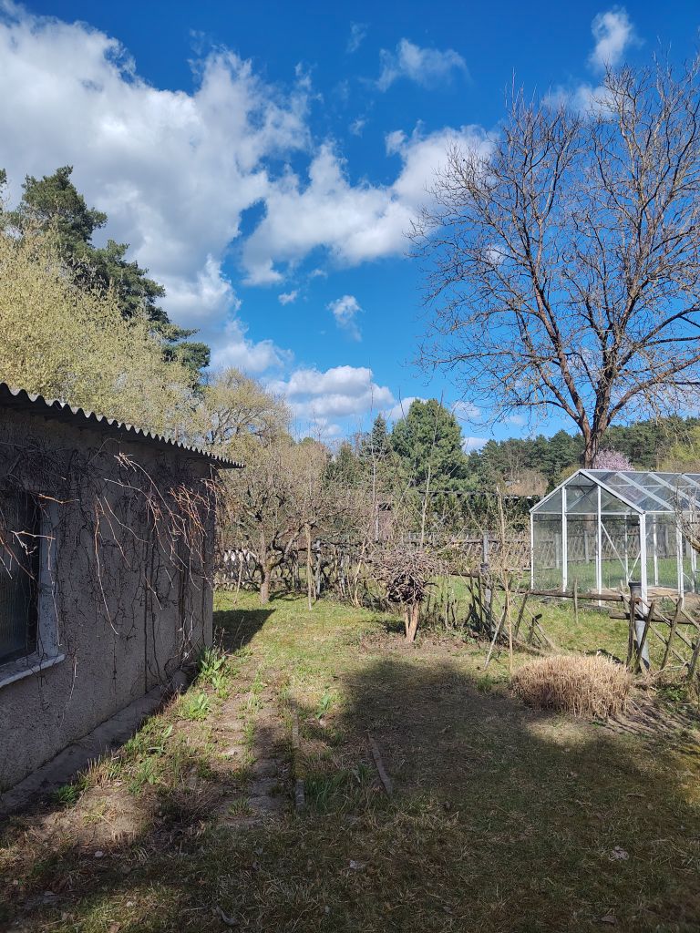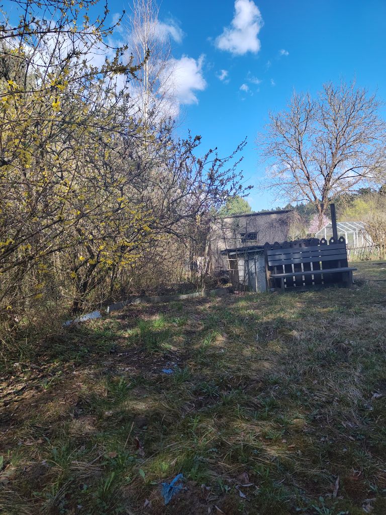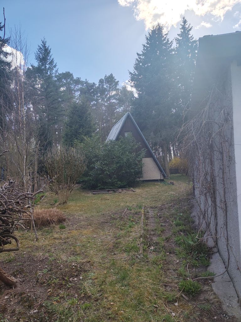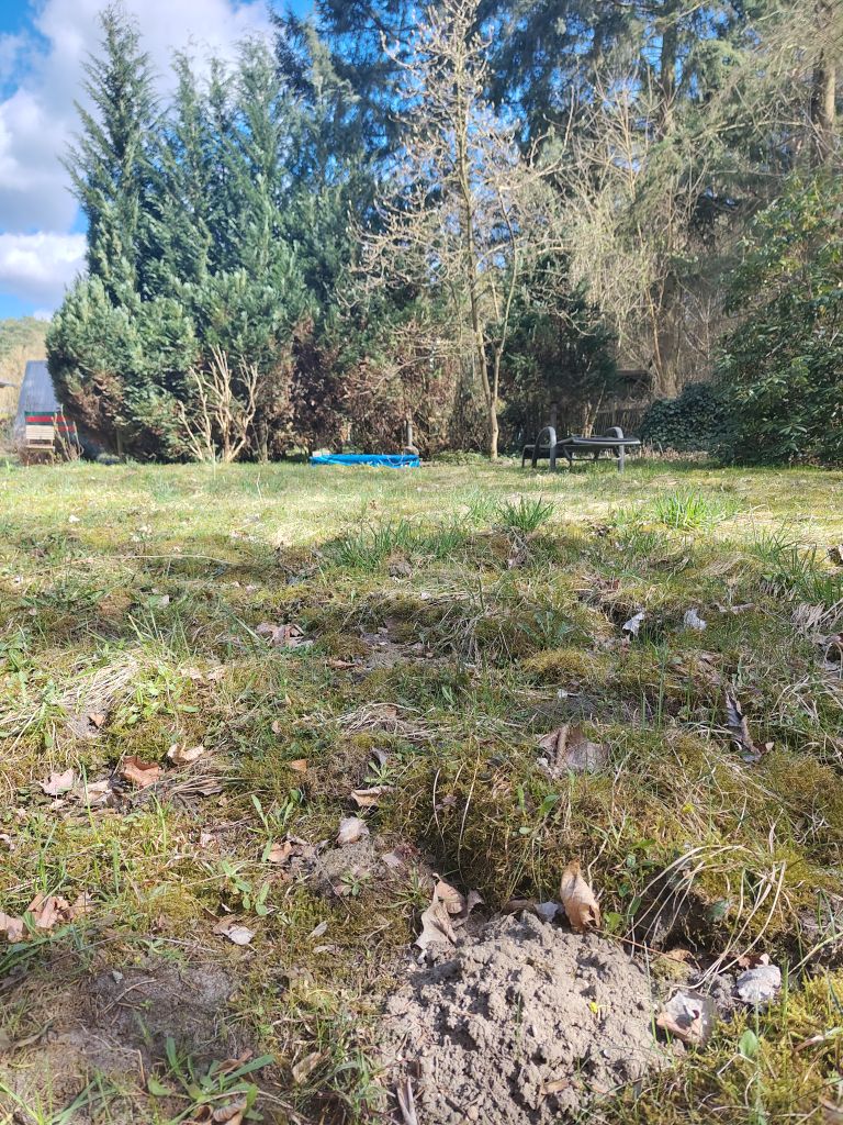 Der gesamte Garten ist ca 1000qm groß. Auf einer Seite schaut man in den Wald. Eine lange Seite grenzt an eine unasphaltierte Straße, auf der anderen Seite sind Nachbarn. Der große Hauptrasen hat aktuell einen Wildschweinschaden und ist ziemlich durchgewühlt. Generell ist alles eher wild und improvisiert. Es gibt ein A-Shape Nurdachhaus mit Terrasse, ein kleines Pumpenhaus, WC mit Dusche und einen Schuppen mit vielen Gartensachen.