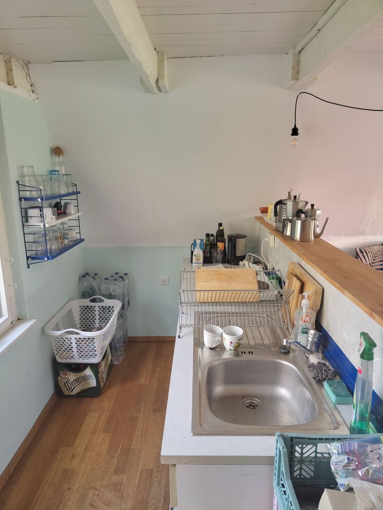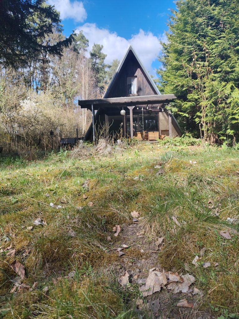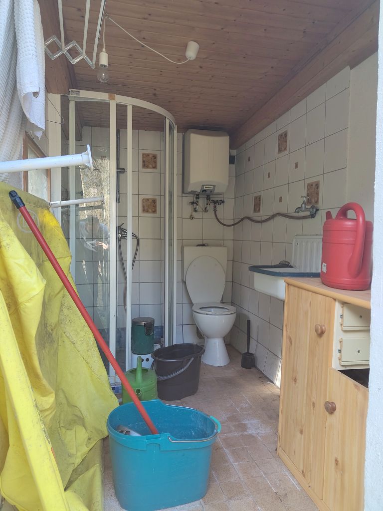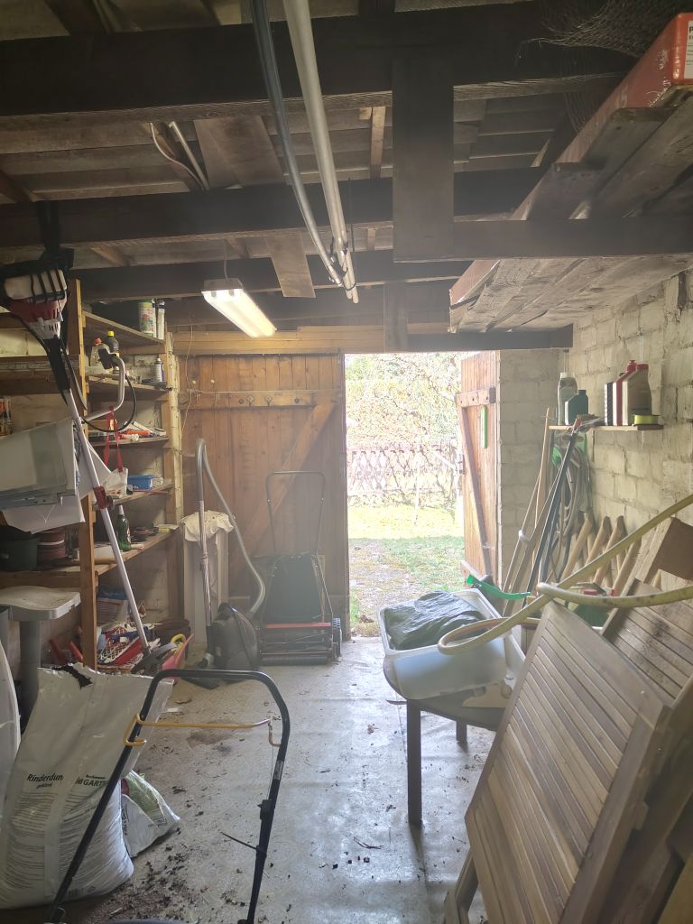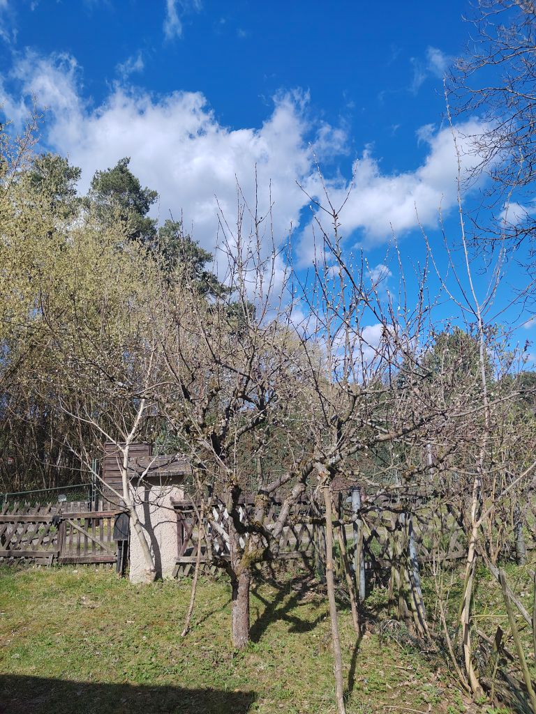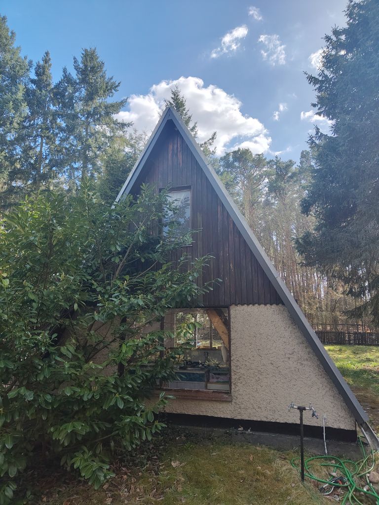 Der gesamte Garten ist ca 1000qm groß. Auf einer Seite schaut man in den Wald. Eine lange Seite grenzt an eine unasphaltierte Straße, auf der anderen Seite sind Nachbarn. Der große Hauptrasen hat aktuell einen Wildschweinschaden und ist ziemlich durchgewühlt. Generell ist alles eher wild und improvisiert. Es gibt ein A-Shape Nurdachhaus mit Terrasse, ein kleines Pumpenhaus, WC mit Dusche und einen Schuppen mit vielen Gartensachen.