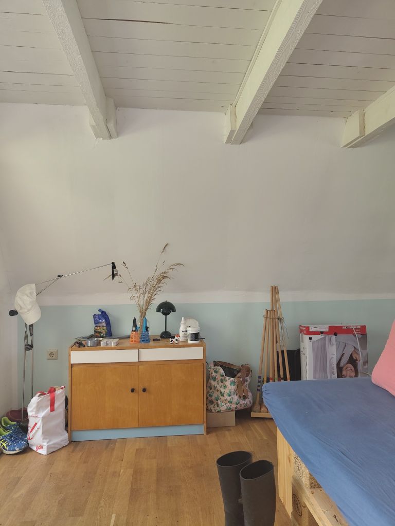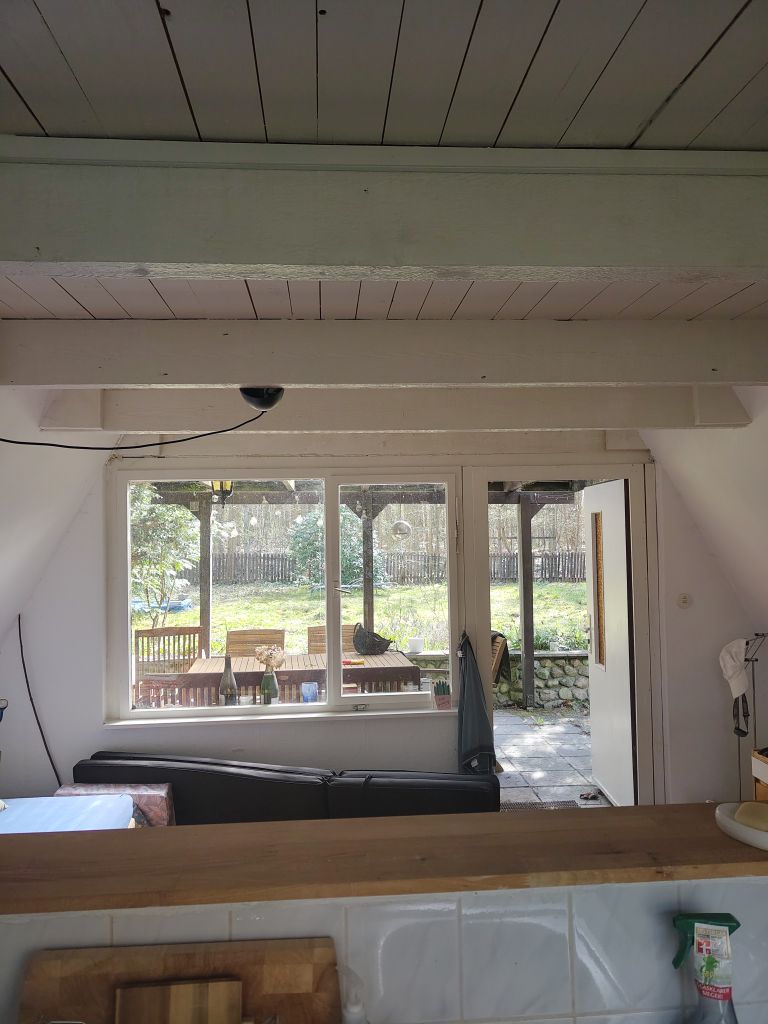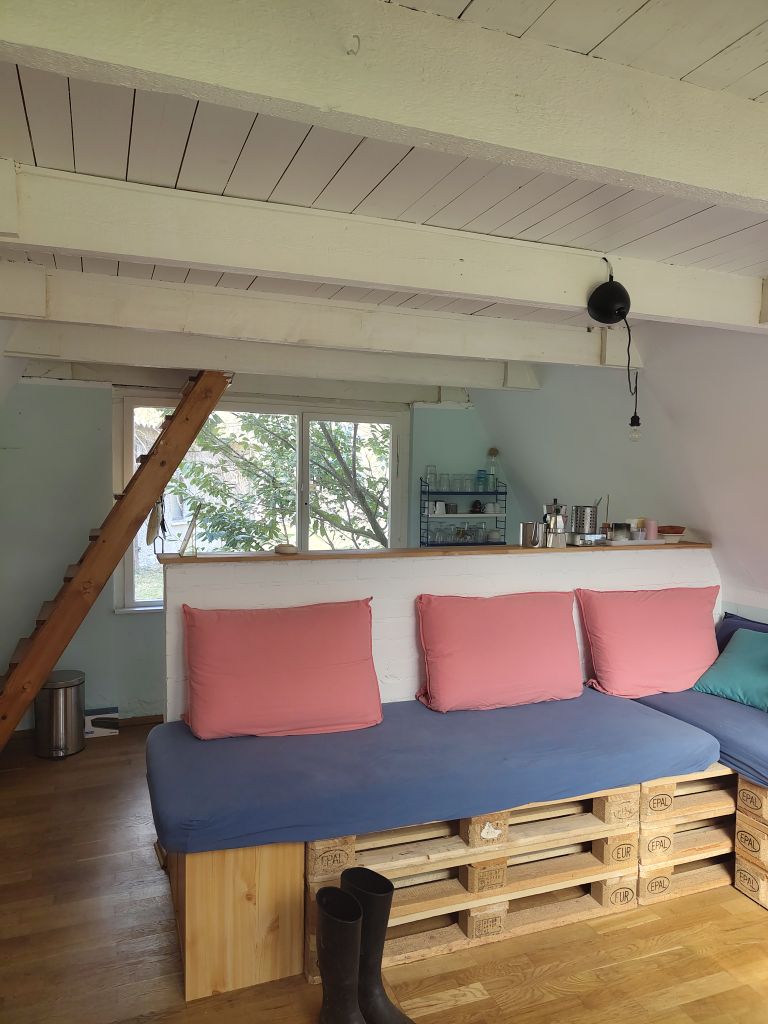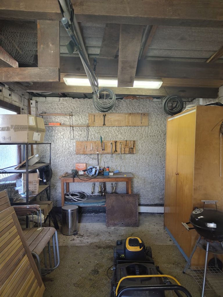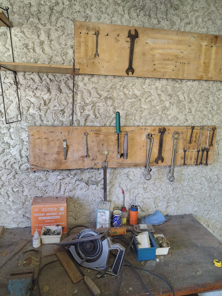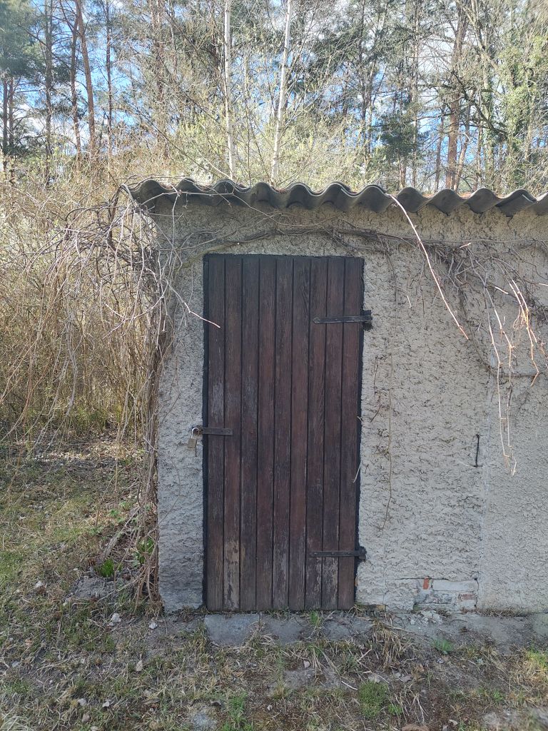 Der gesamte Garten ist ca 1000qm groß. Auf einer Seite schaut man in den Wald. Eine lange Seite grenzt an eine unasphaltierte Straße, auf der anderen Seite sind Nachbarn. Der große Hauptrasen hat aktuell einen Wildschweinschaden und ist ziemlich durchgewühlt. Generell ist alles eher wild und improvisiert. Es gibt ein A-Shape Nurdachhaus mit Terrasse, ein kleines Pumpenhaus, WC mit Dusche und einen Schuppen mit vielen Gartensachen.