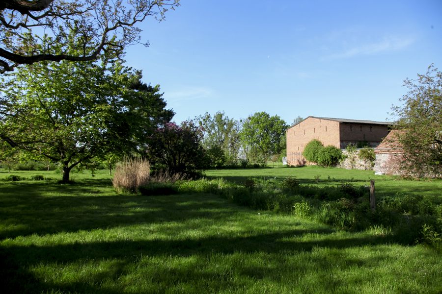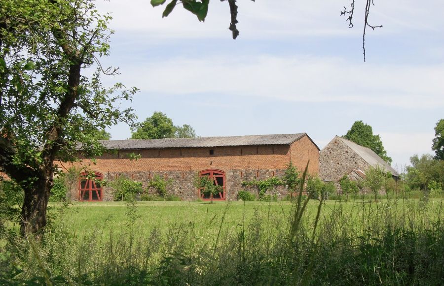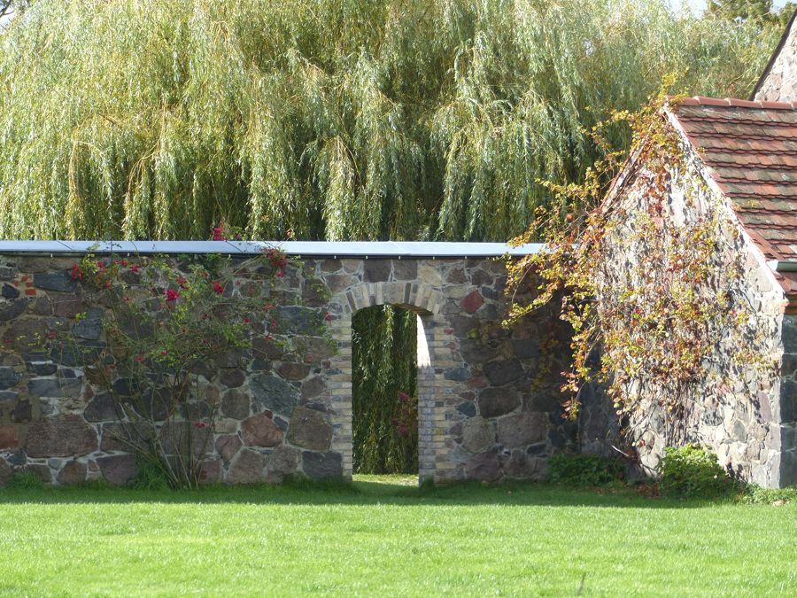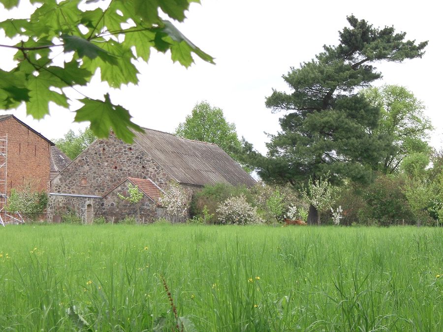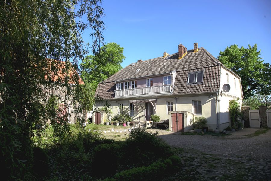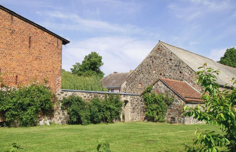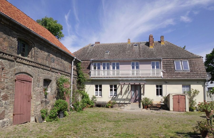 Gartenglück Wegendorf - typischer Brandenburgischer Vierseithof, bestehend aus dem Wohnhaus mit 2 großen Wohnungen im Landhausstil, mit zahlreichen historischen Details, dem ehemaligen Kuhstall mit dem Gartenloft (mit Flügel) und dem rustikalen Kutschflur, der großen Feldsteinscheune sowie dem "Leutehaus" mit der Maisonettewohnung.