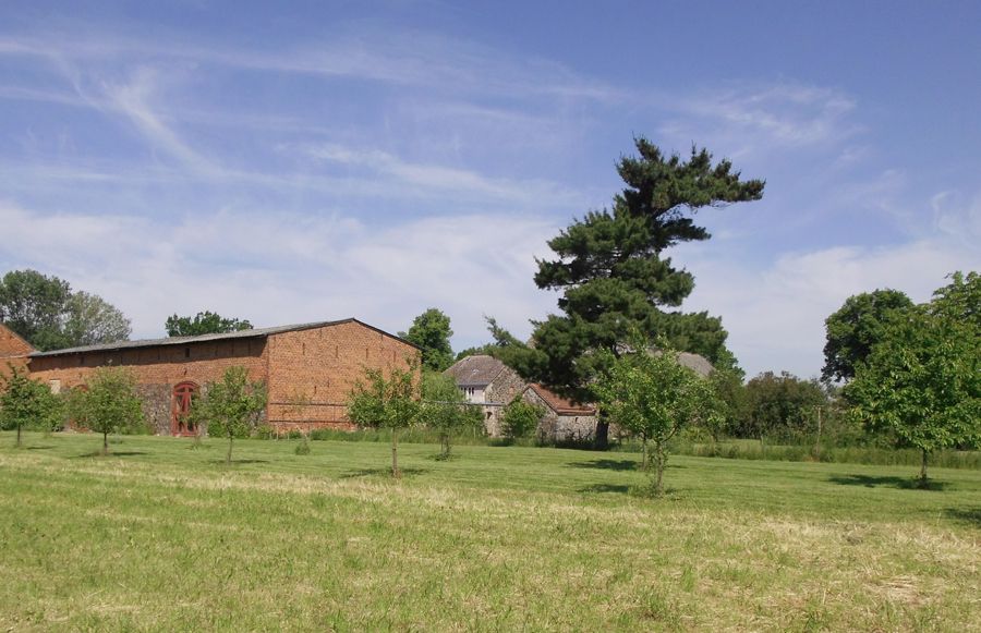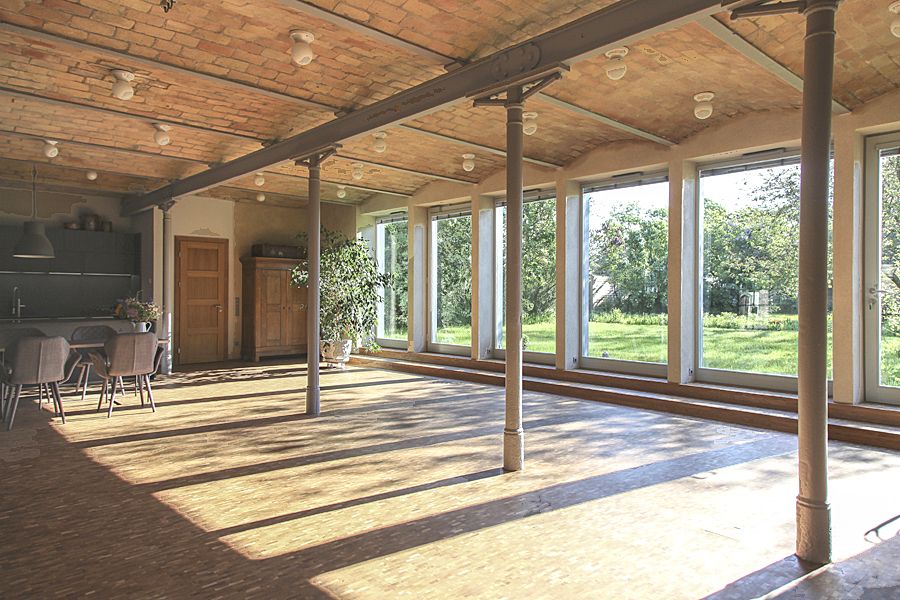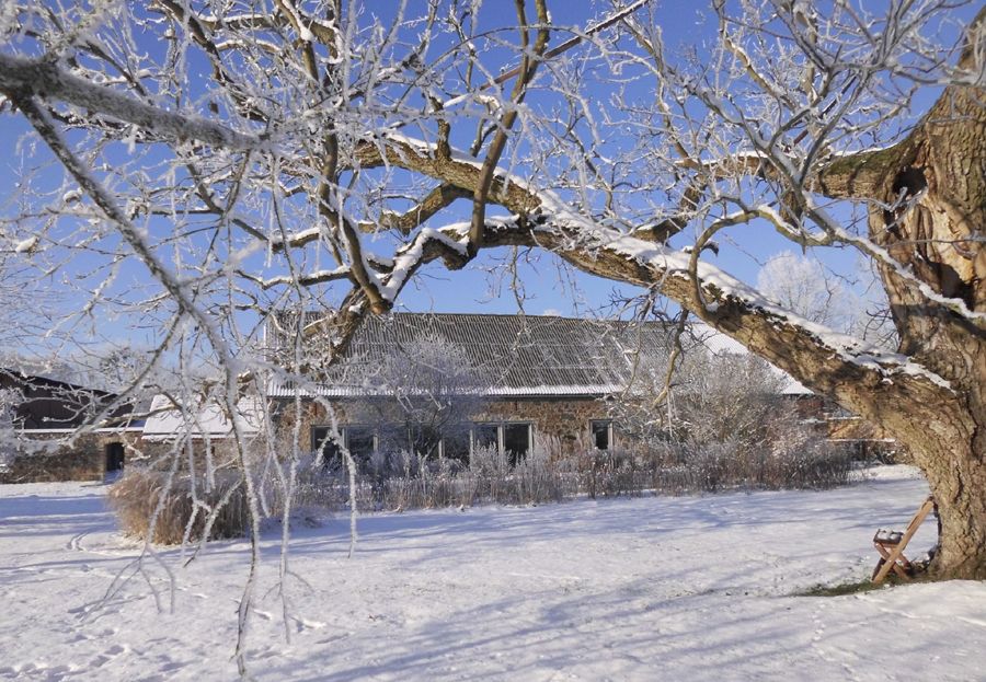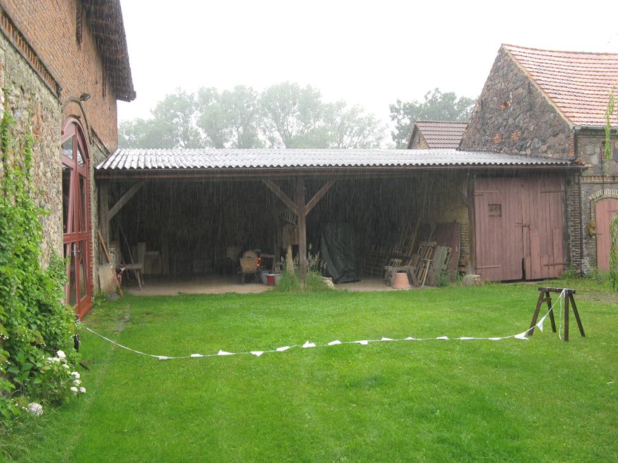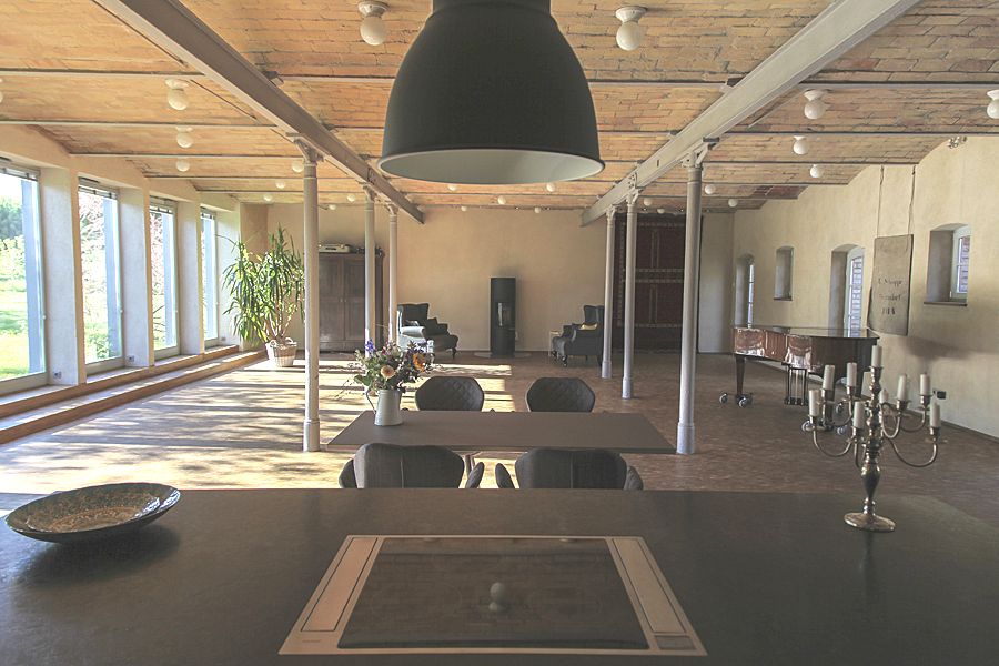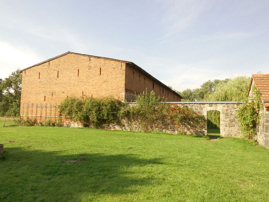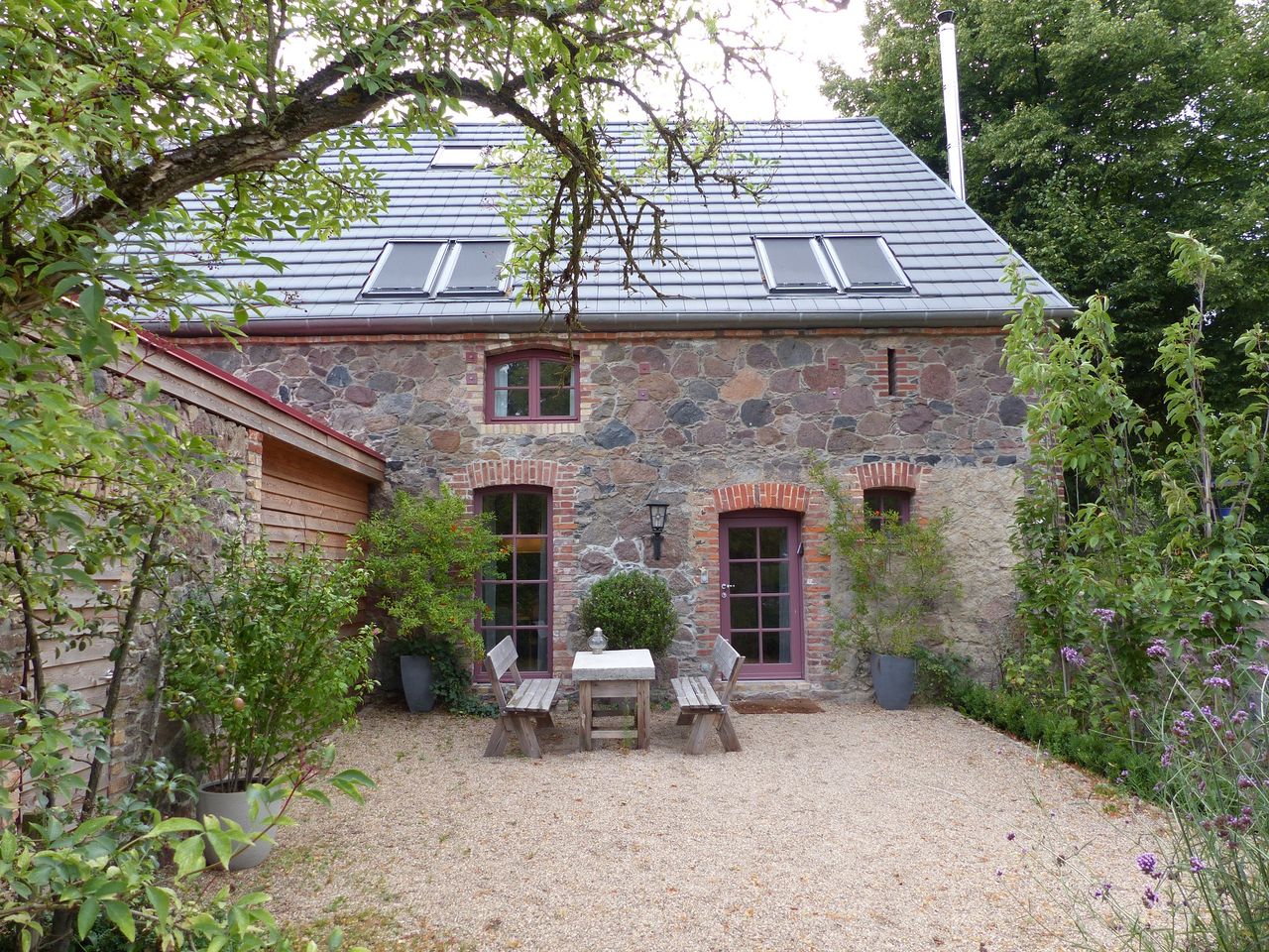 Gartenglück Wegendorf - typischer Brandenburgischer Vierseithof, bestehend aus dem Wohnhaus mit 2 großen Wohnungen im Landhausstil, mit zahlreichen historischen Details, dem ehemaligen Kuhstall mit dem Gartenloft (mit Flügel) und dem rustikalen Kutschflur, der großen Feldsteinscheune sowie dem "Leutehaus" mit der Maisonettewohnung.