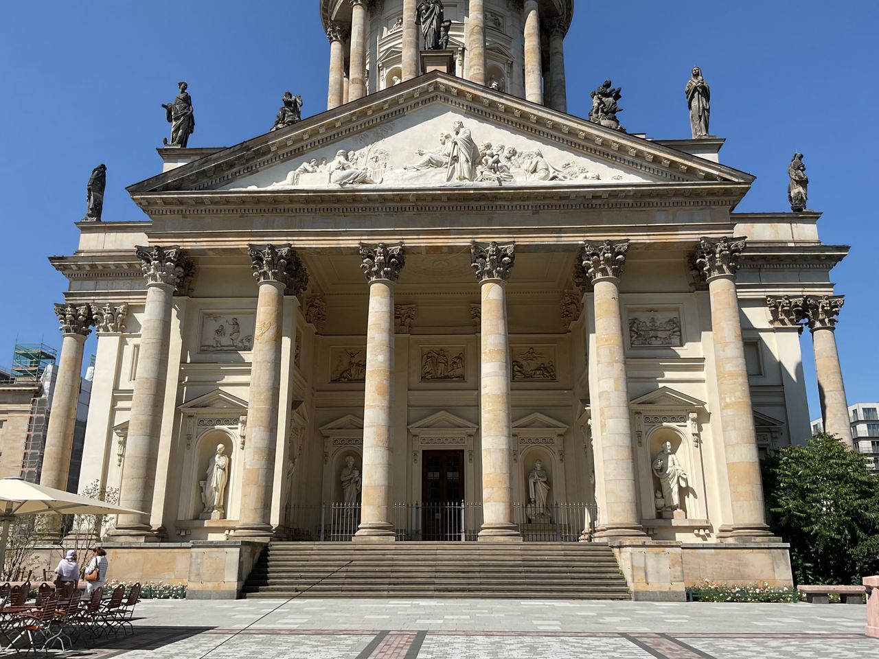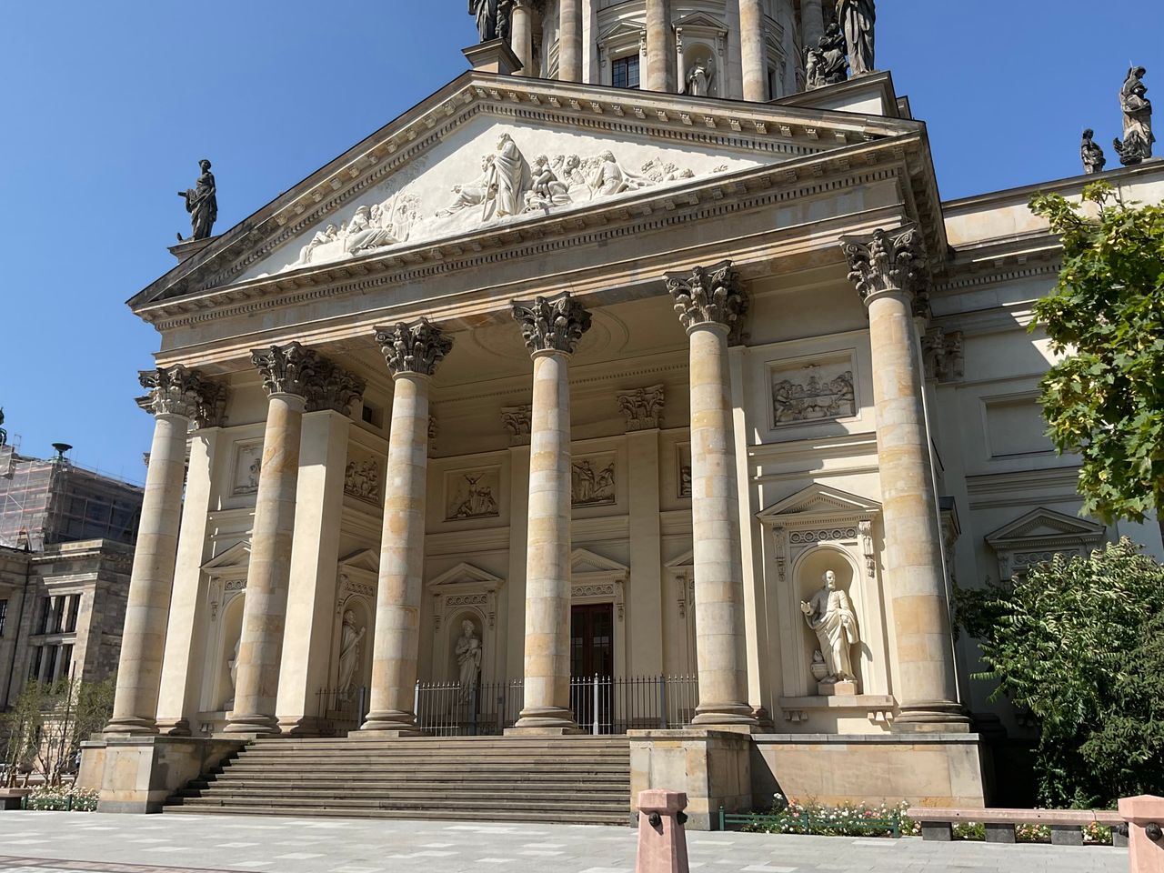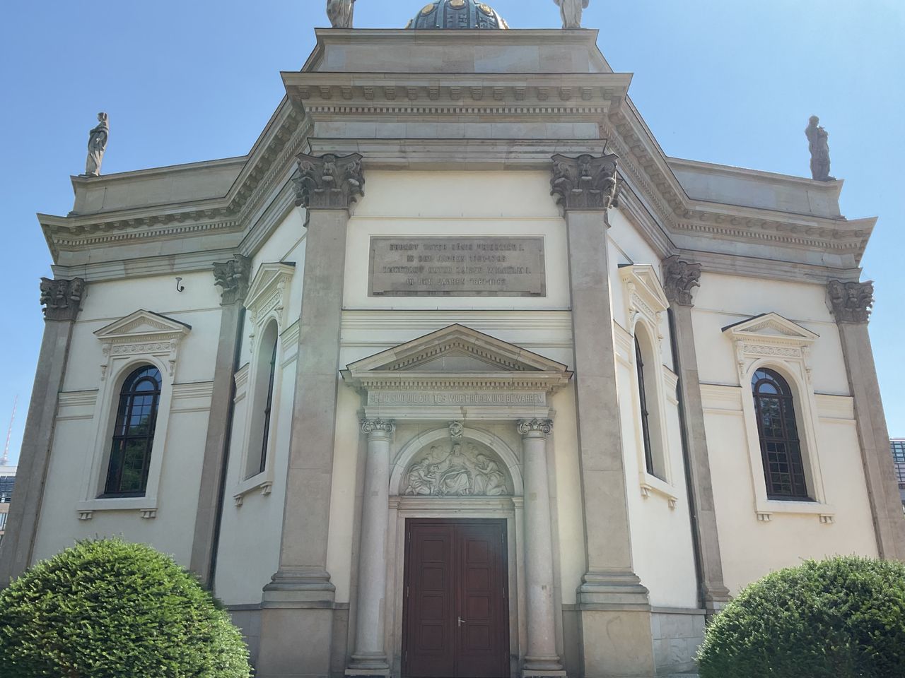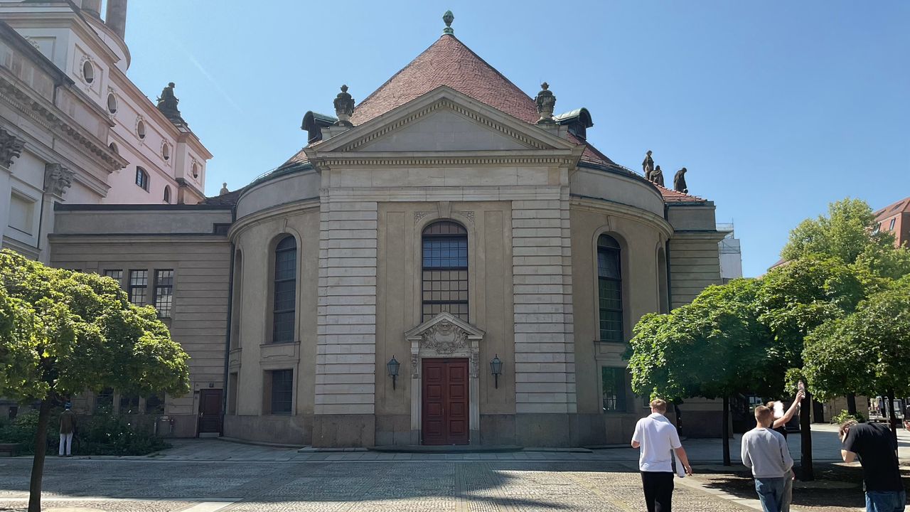 Seine Gestalt erhielt der Platz unter Friedrich II. – dem Großen – mit den beiden identischen Kuppeltürmen neben den Kirchen. Sie wurden in den Jahren 1780–1785 nach Plänen von Carl von Gontard errichtet. Als Vorbild für die Neugestaltung wird oft die Piazza del Popolo in Rom erwähnt, Laurenz Demps jedoch bezweifelt dies.[2] Da das Charakteristikum des Platzes in der Überdimensionierung der Türme besteht, wird manchmal als Vorbild das Old Royal Naval College (1703) in Greenwich genannt." (zit. nach: de.wikipedia.org)