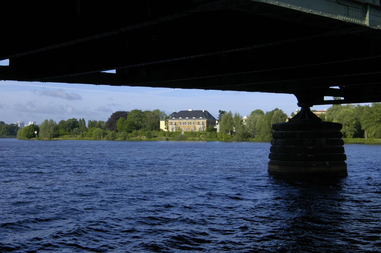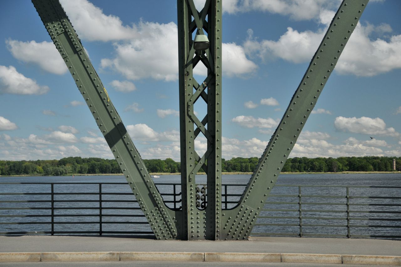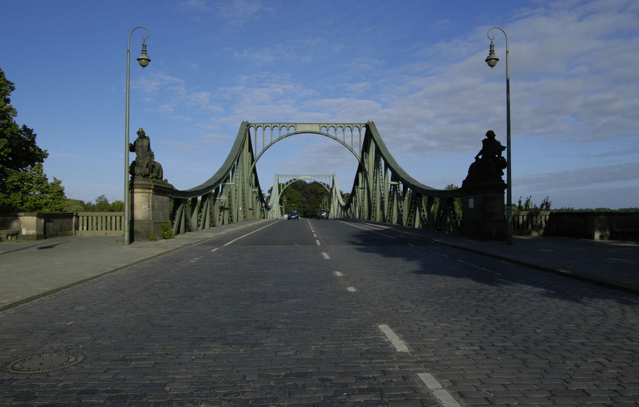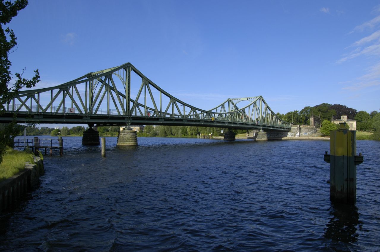 Stahlfachwerkbrücke über die Havel - berühmt durch Agentenaustausch zwischen Ost und West, der in der Zeit des Kalten Krieges regelmäßig hier stattfand. Die Grenze verlief exakt in der Mitte der Brücke, die auch “Brücke der Einheit” heißt. Stark befahren - wichtige Verbindungsstraße zwischen Berlin und Potsdam. Lage inmitten der Schloß- und Gartenlandschaft Glienicke und Babelsberg, mit wunderbarem Ausblick auf Schloß Babelsberg.