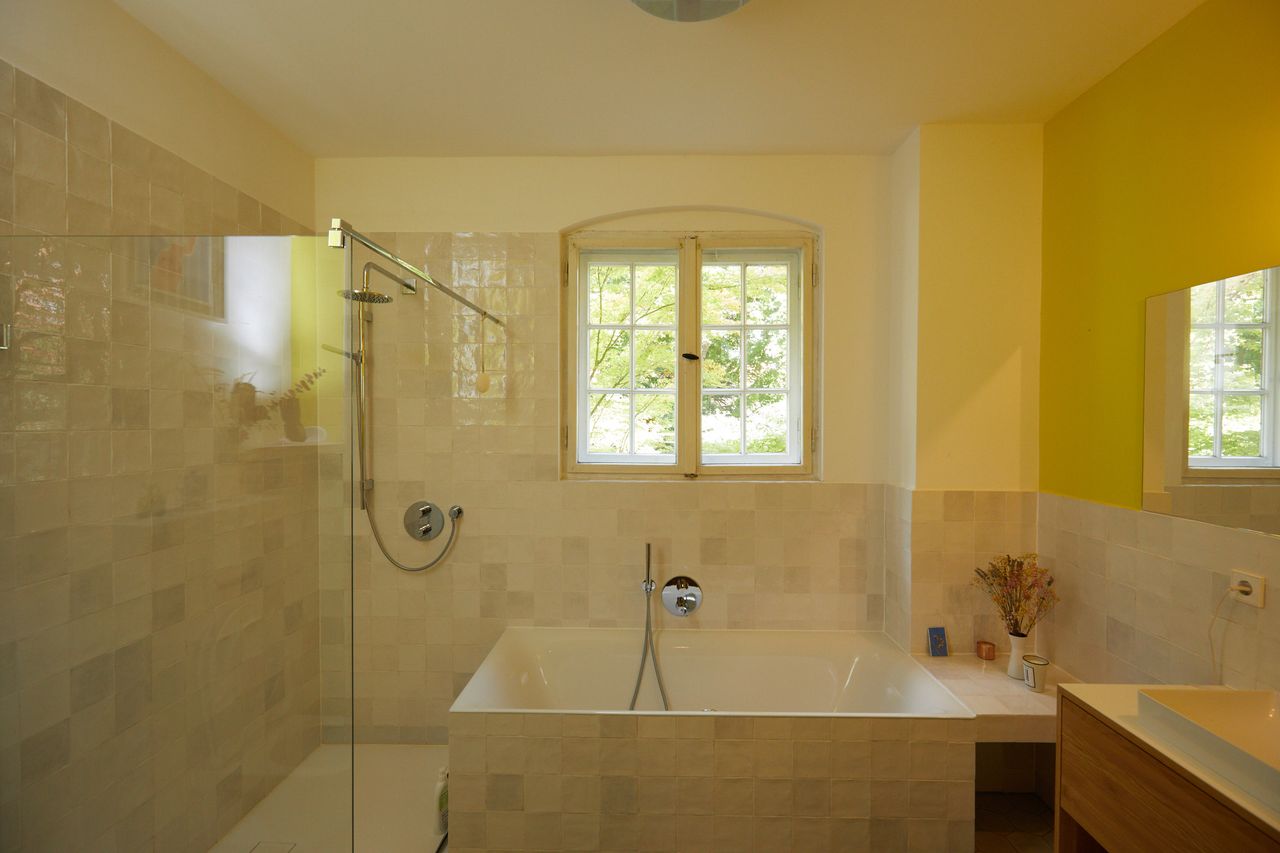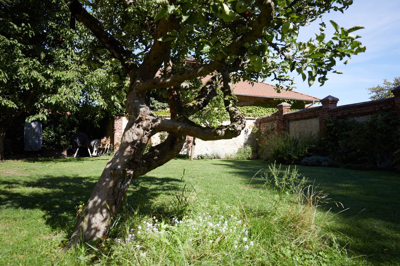 Umgeben von einem großem Garten, der viele verschiedene Motive ermöglicht: Gewächshaus aus den 60ern, eine alte Garage, ein Baumhaus, große Staudenbeete, von zwei Seiten umgeben von einer alten Mauer, alter und neuer Baumbestand.