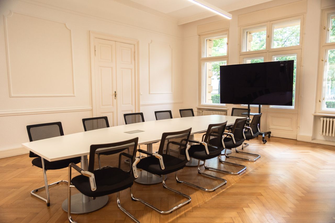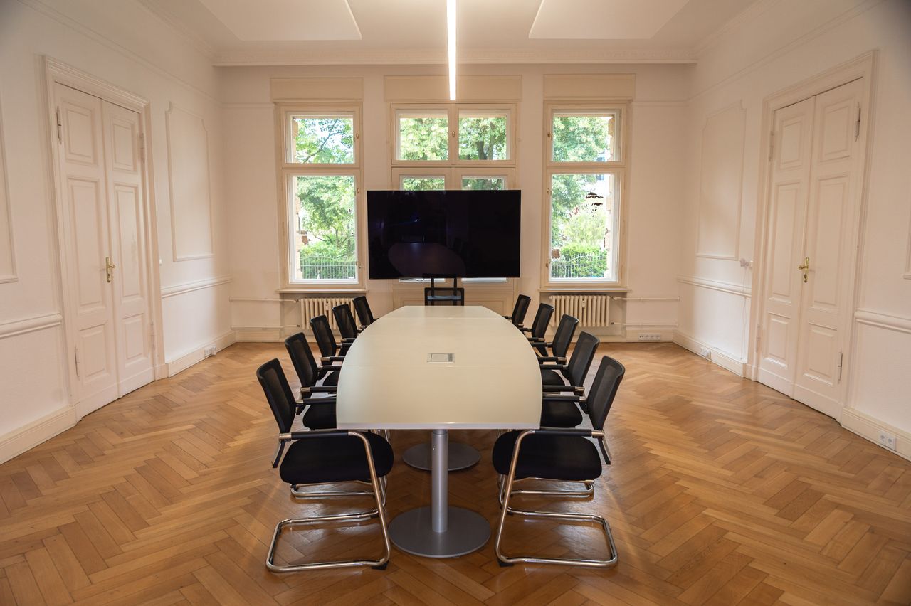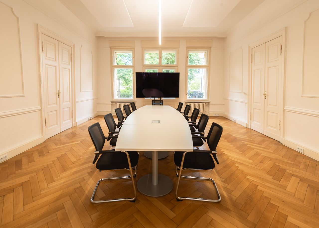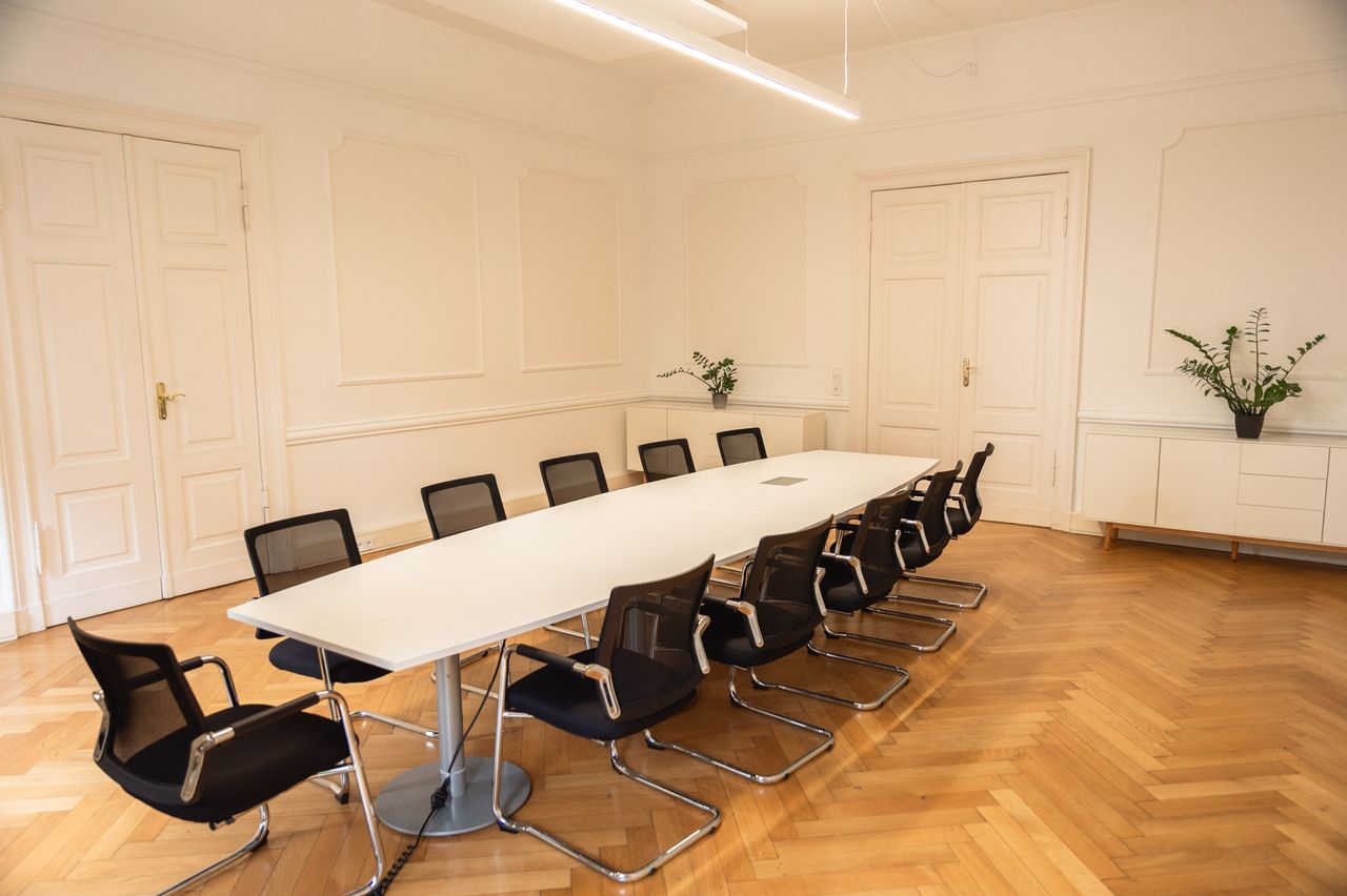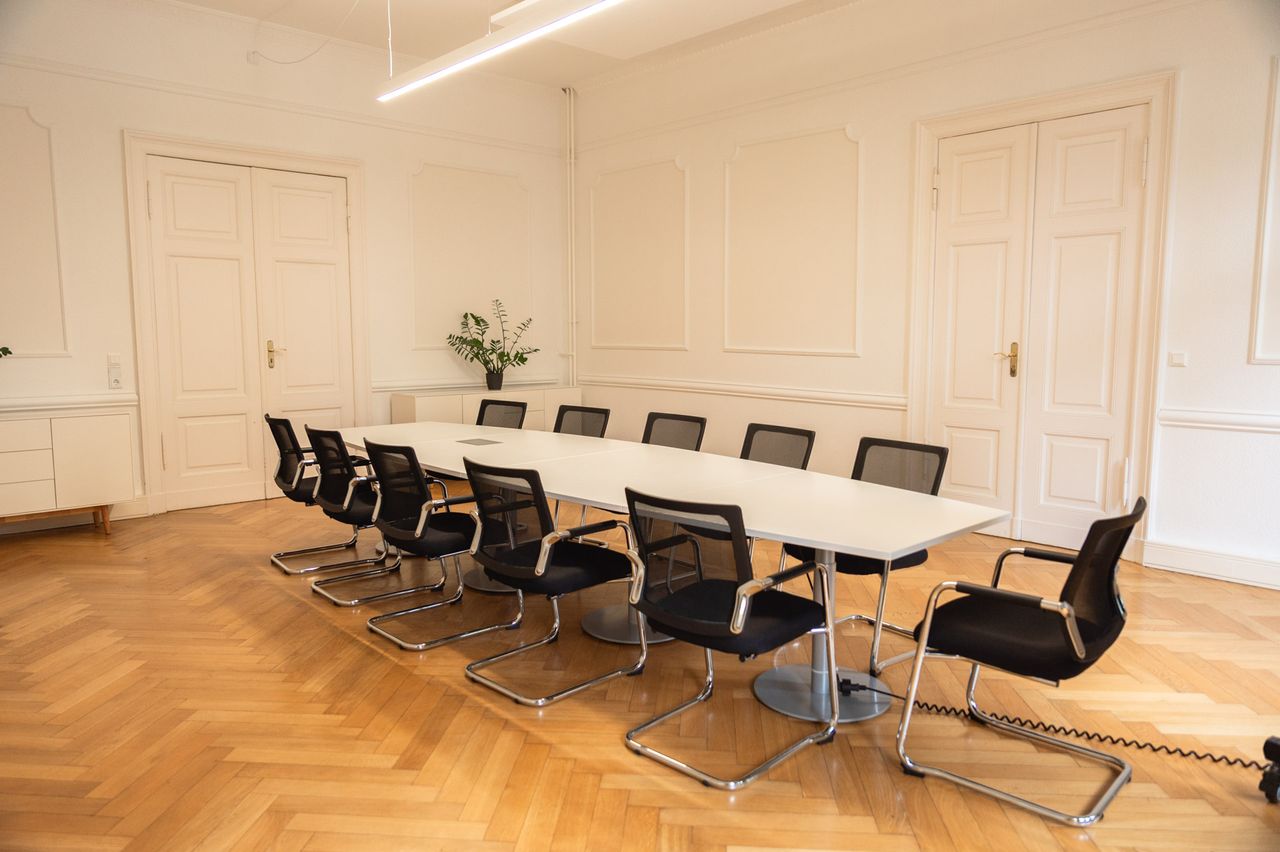 Im Zentrum steht ein großzügiger, heller Konferenzraum mit weiß gestrichenen Wänden und eleganten Stuckelementen – eine Kombination aus klassischer Architektur und modernem Minimalismus. Ein großer, mobiler Konferenztisch mit passenden Stühlen ermöglicht flexible Raumkonzepte. Unter der Decke sorgen Anti-Schall-Elemente für gute Akustik.
