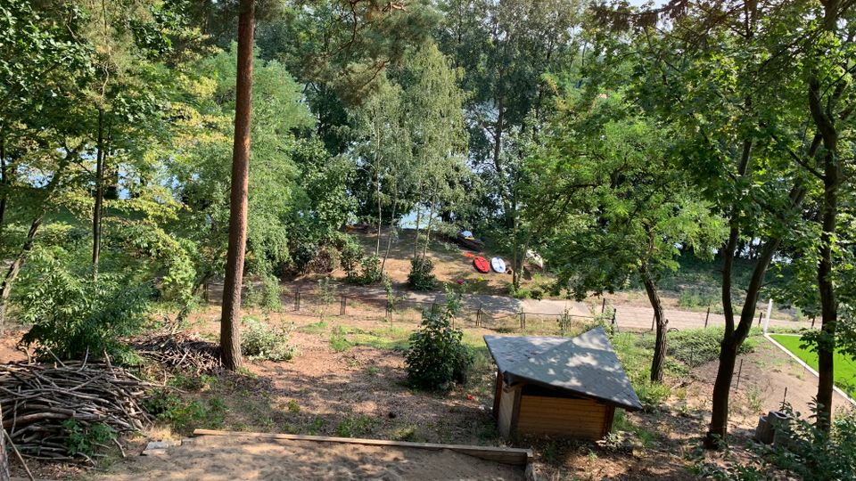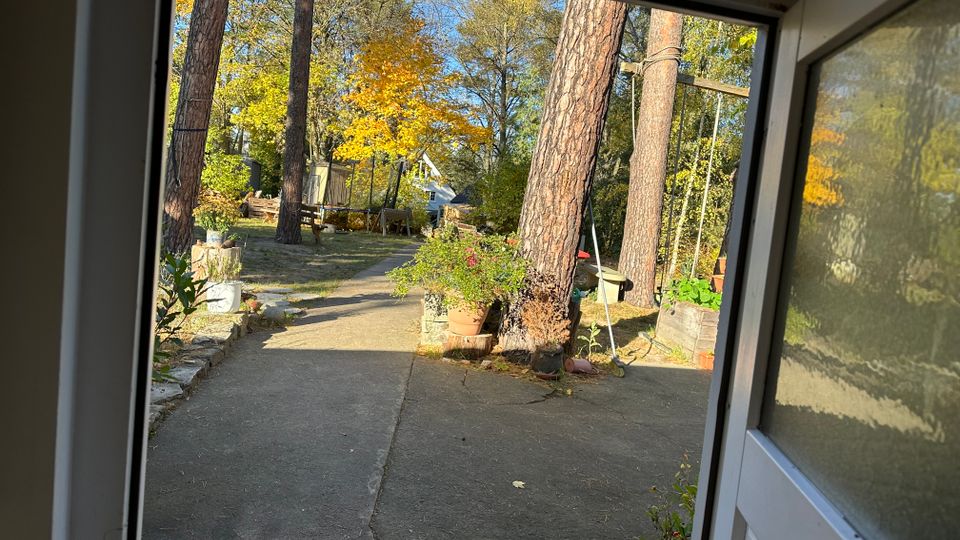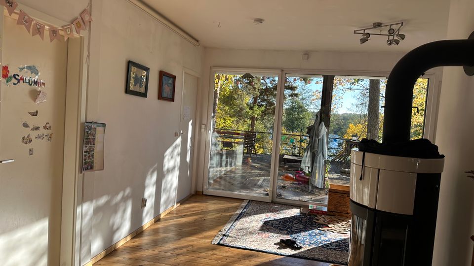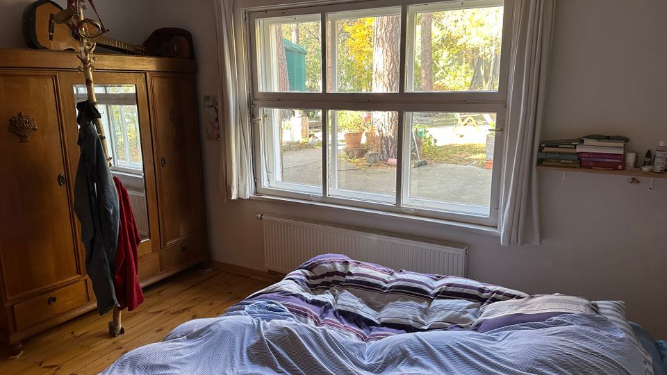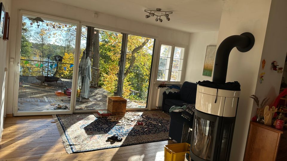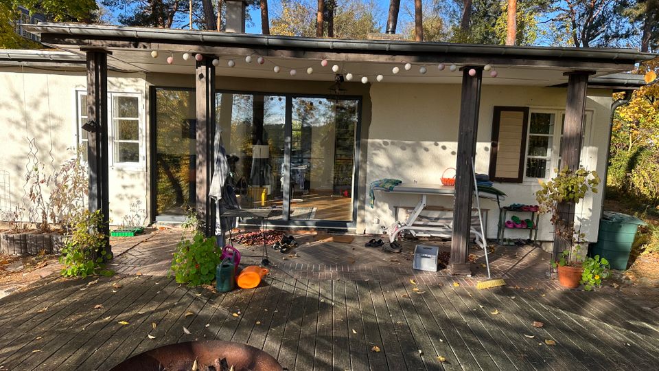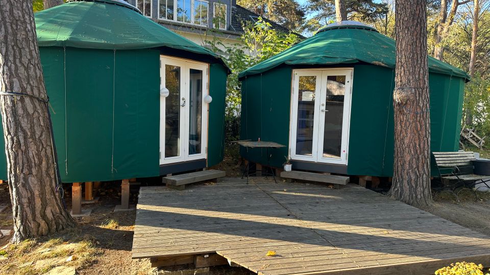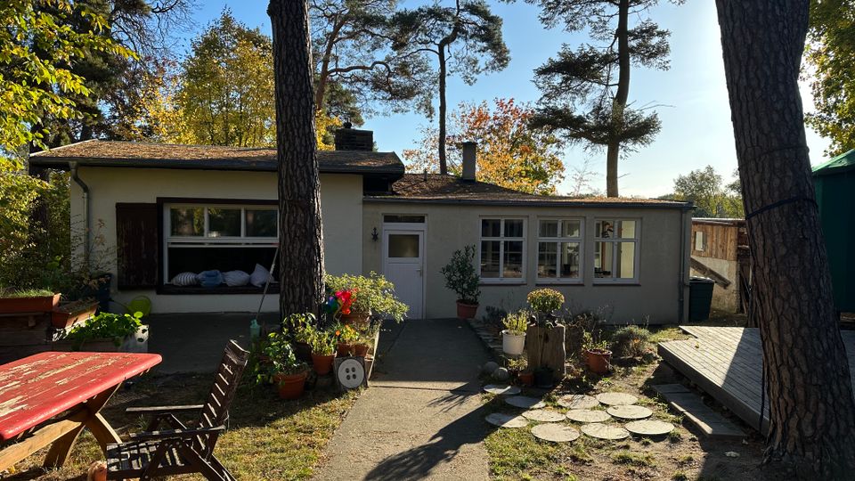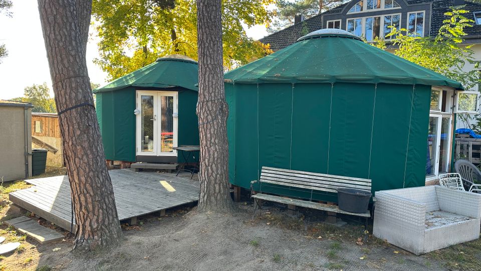 Es handelt sich um ein Sommerhaus am Groß Glienicker See – gebaut in den 20er Jahren sowie zwei moderne Jurten mit Heizung durch Wärmepumpe im Garten. Das Haus hat 3 Schlafzimmer, ein offenes Wohn-/Esszimmer und ein Bad. Ein Kamin steht im Wohnzimmer. Die Jurten sind je 20qm2 groß.