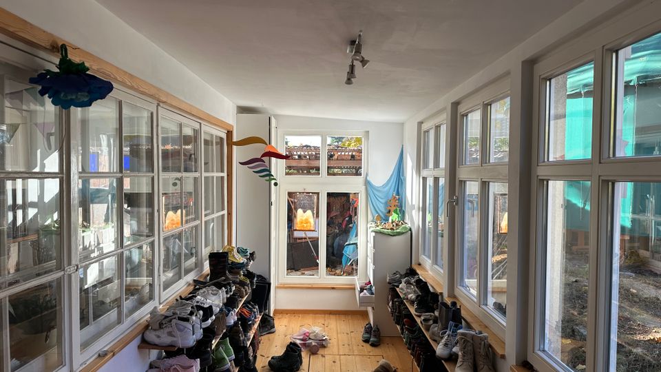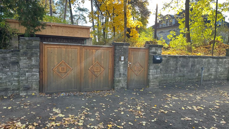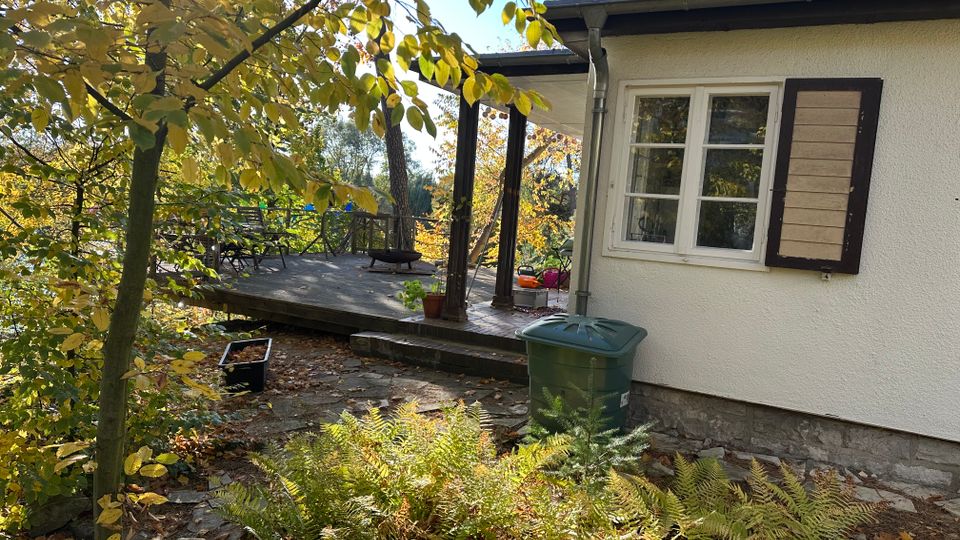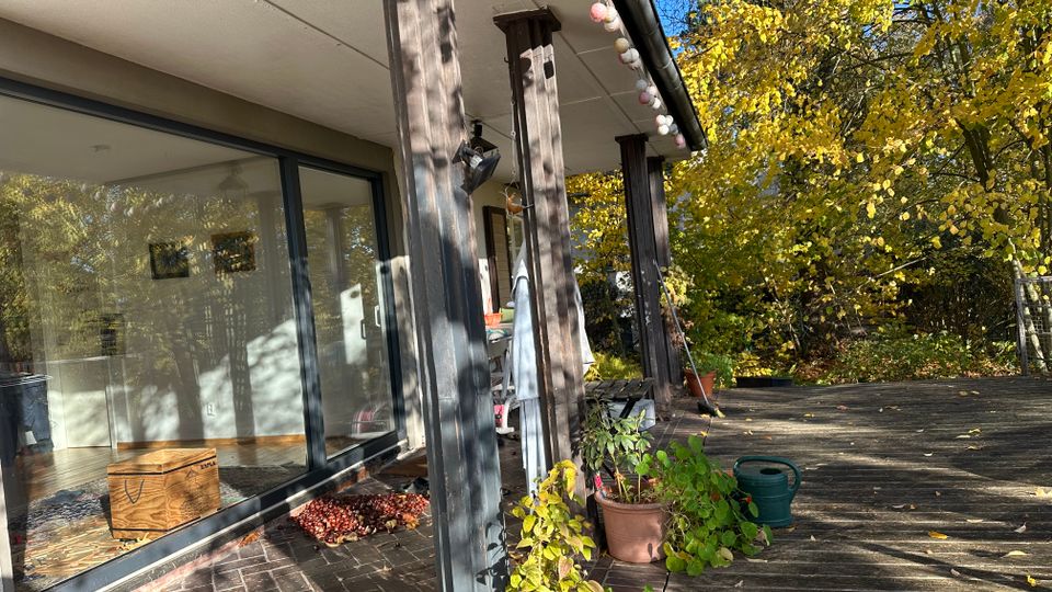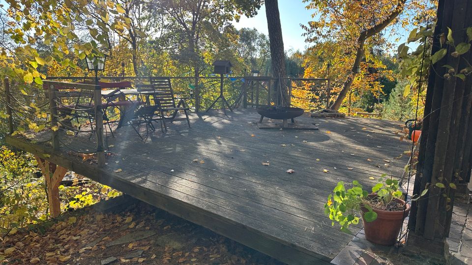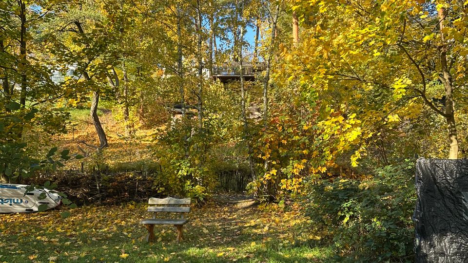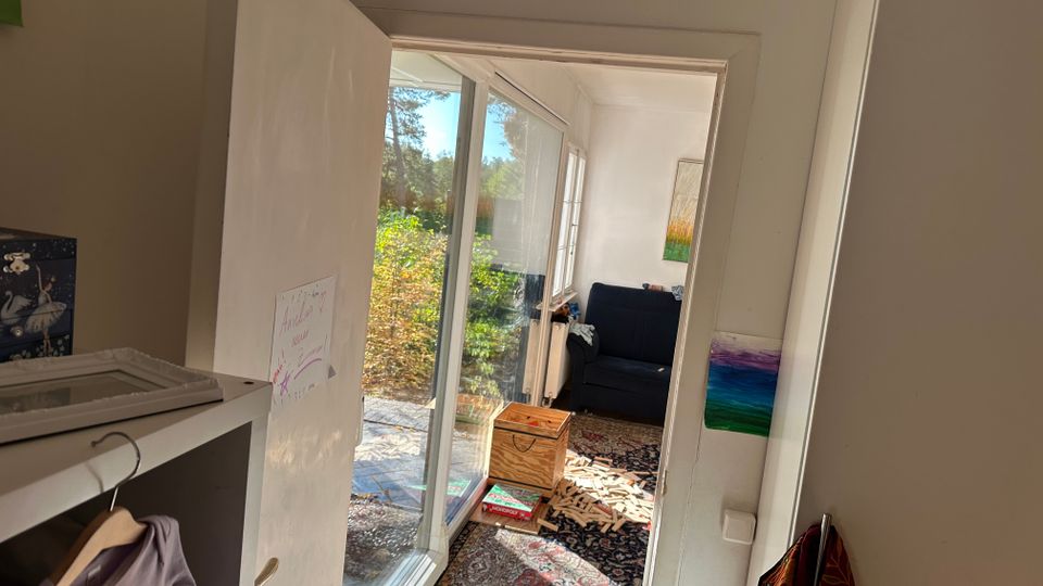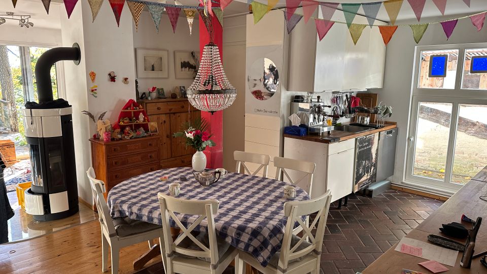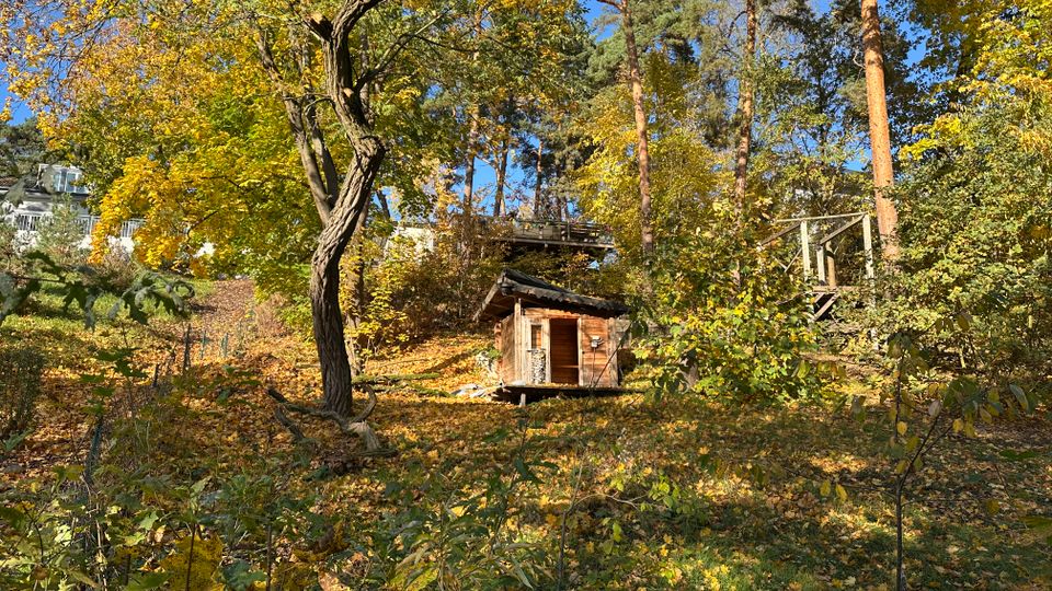 Es handelt sich um ein Sommerhaus am Groß Glienicker See – gebaut in den 20er Jahren sowie zwei moderne Jurten mit Heizung durch Wärmepumpe im Garten. Das Haus hat 3 Schlafzimmer, ein offenes Wohn-/Esszimmer und ein Bad. Ein Kamin steht im Wohnzimmer. Die Jurten sind je 20qm2 groß.
