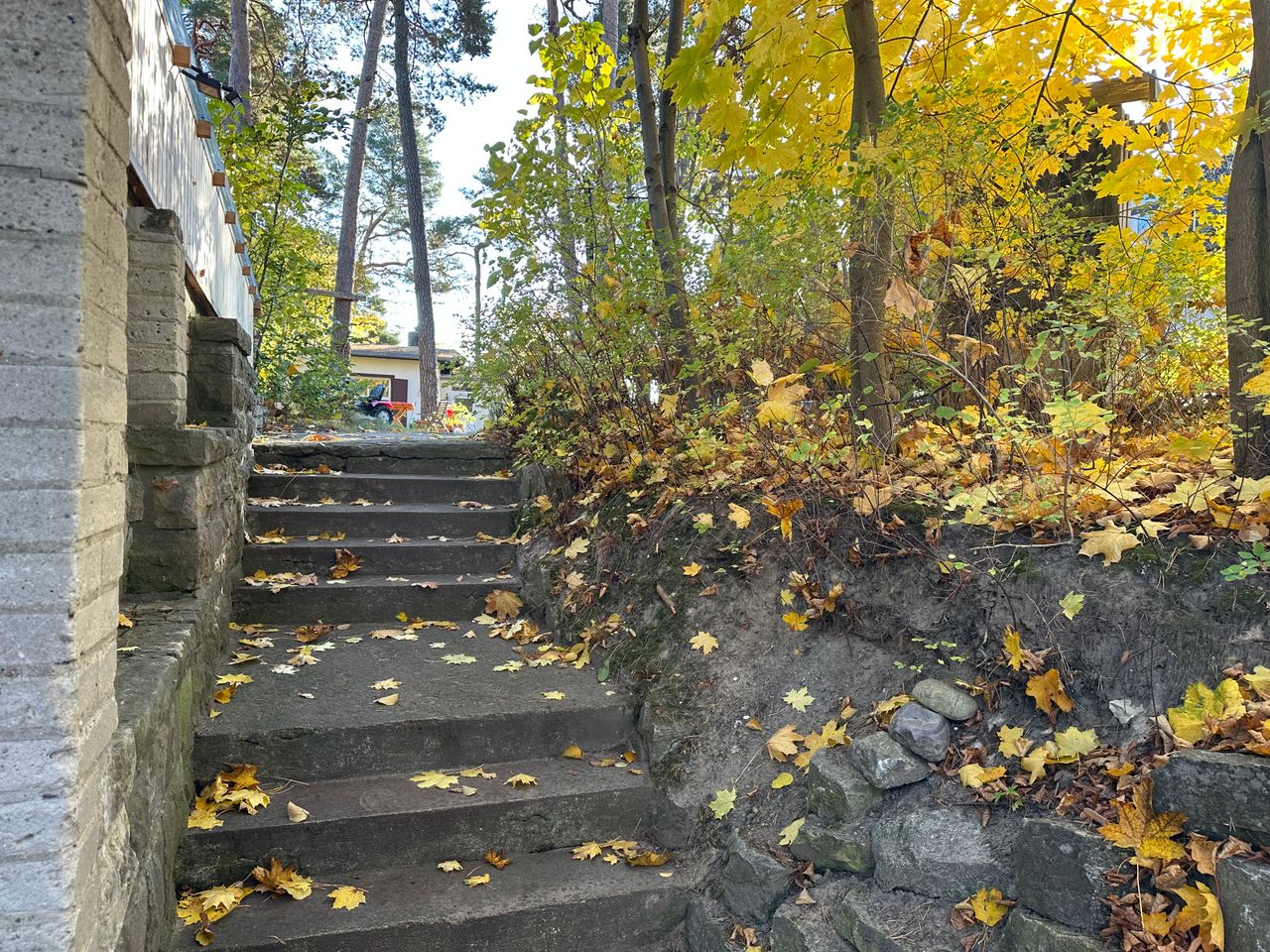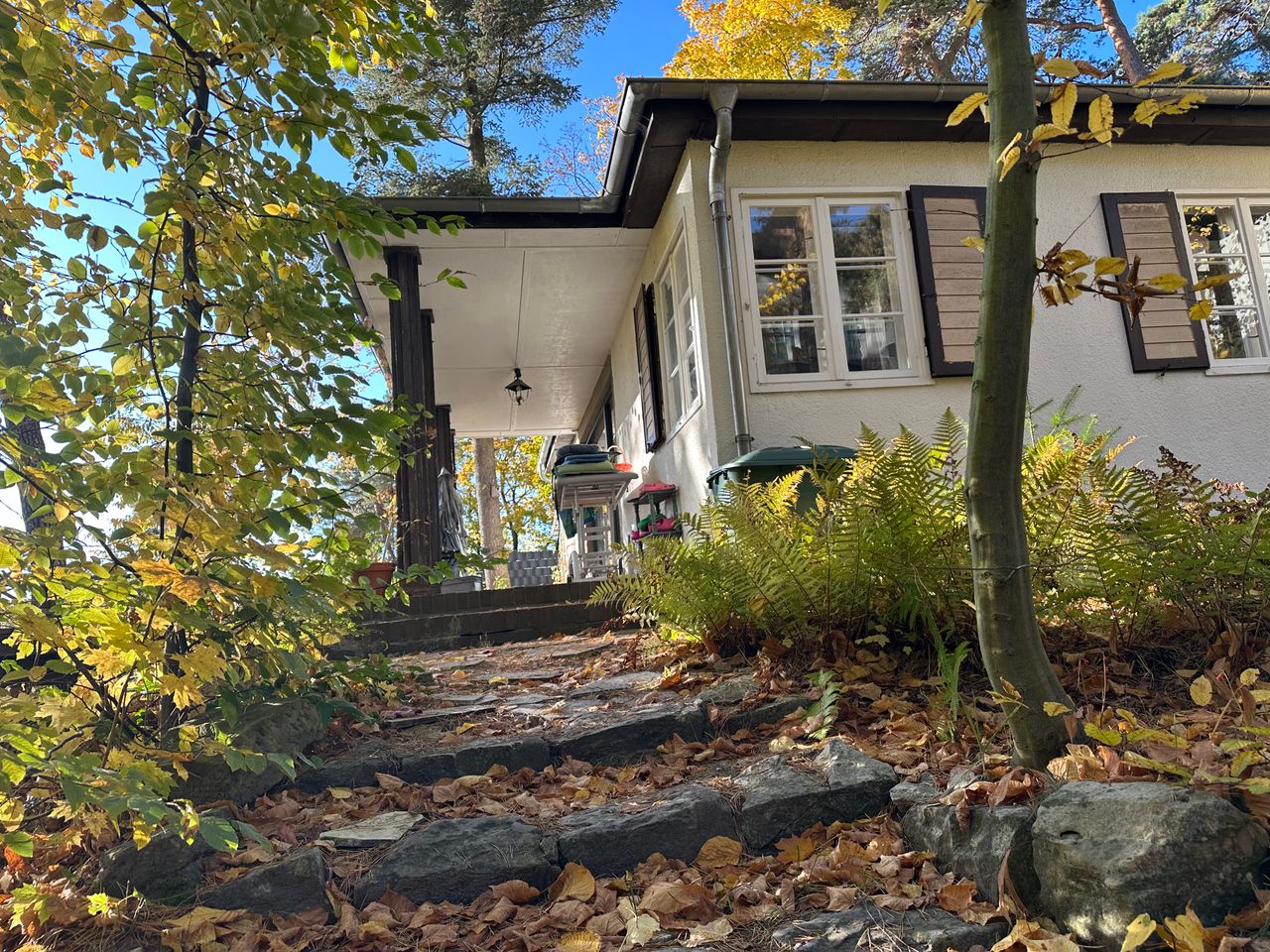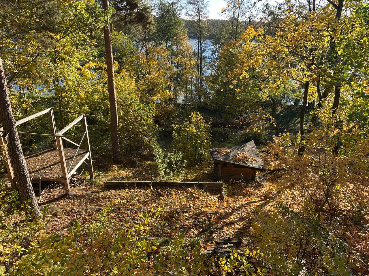 Das Grundstück ist mit 2500qm groß, am Hang gelegen, abfallend zum See mit Privatstrand. Am Hang steht eine freistehende Sauna. Die Kombination aus kleinem, historischem Häuschen und großem Panoramafenster neben 100 Jahre alten Doppelfenstern ist einmalig. Der Boden ist großteils original aus den 20er Jahren – Stein-Klinker und Holzdielen.
