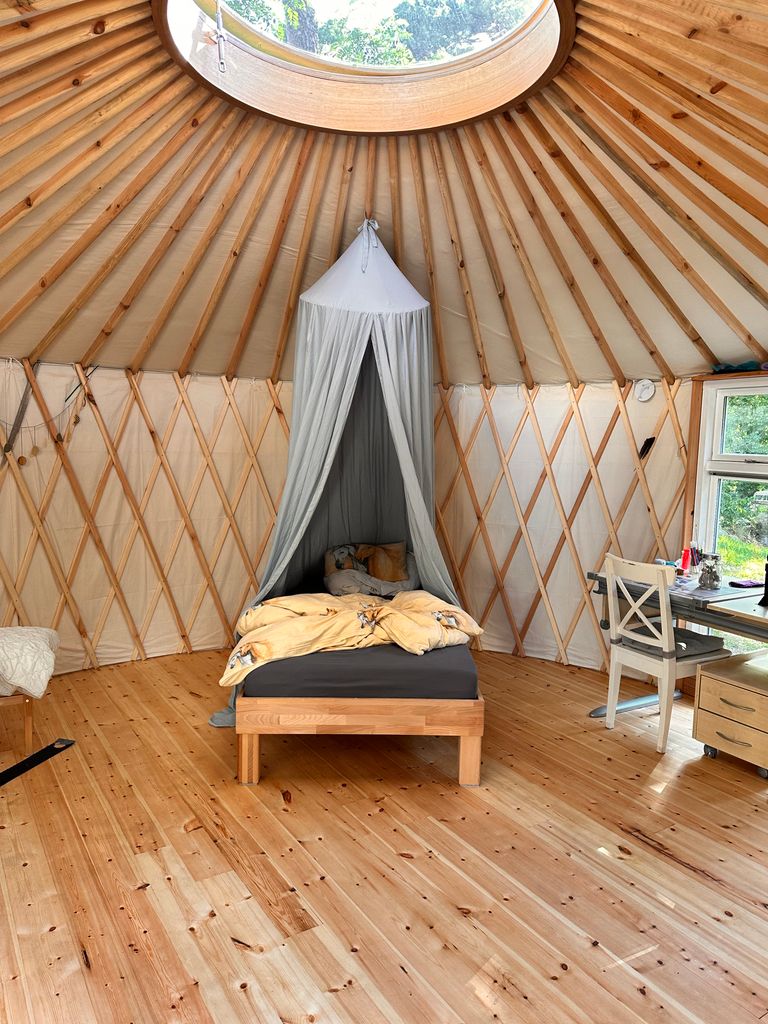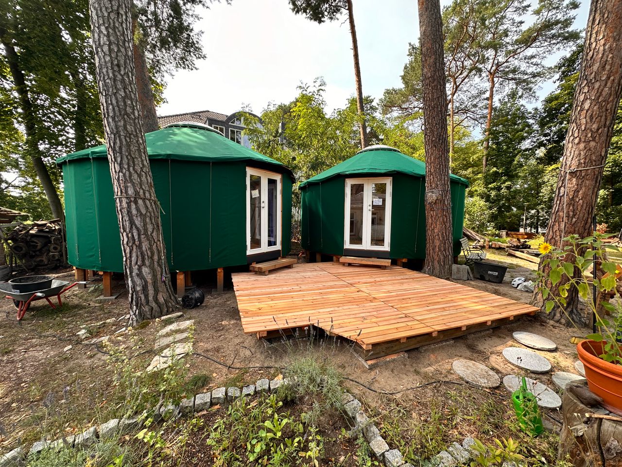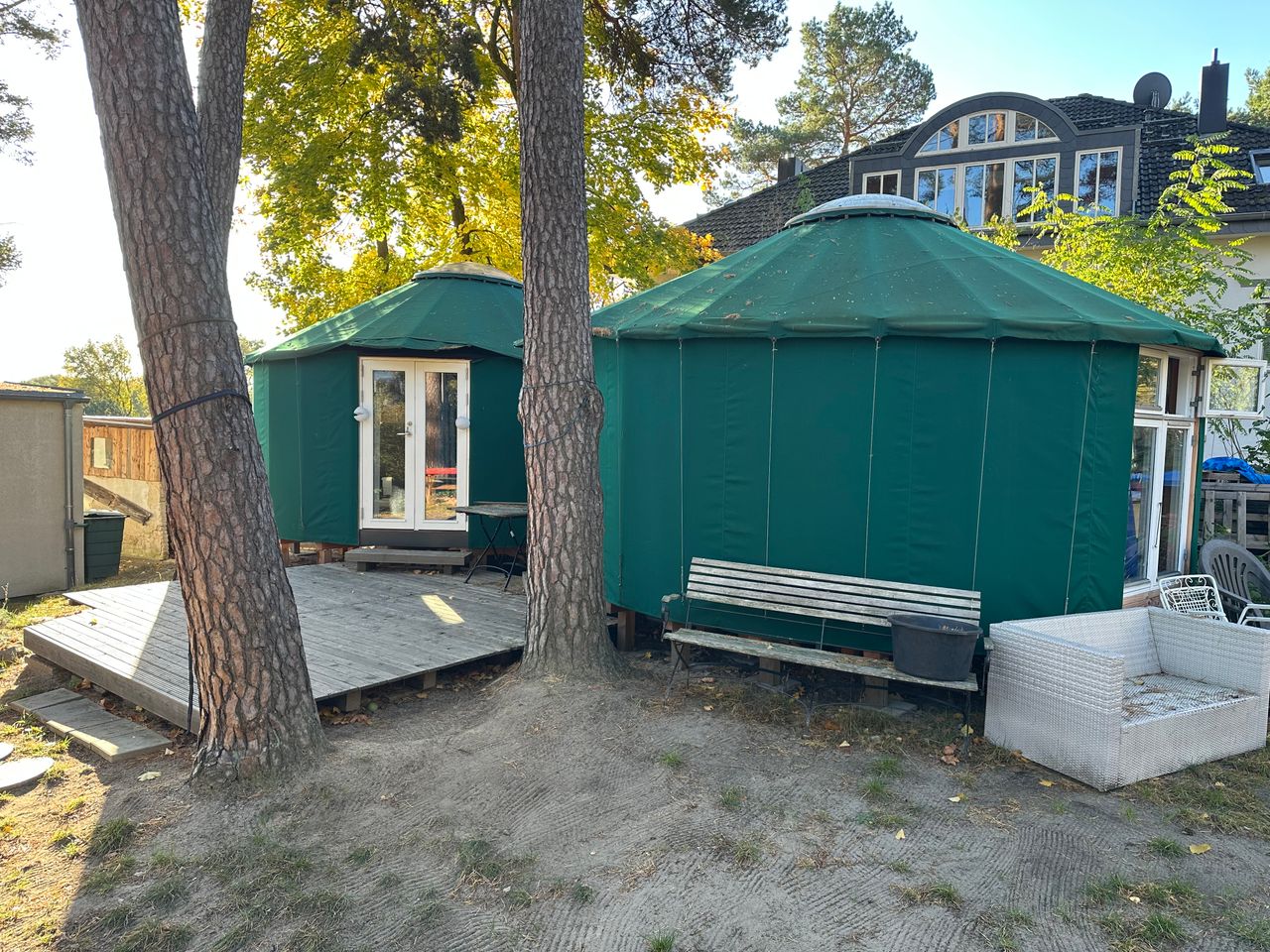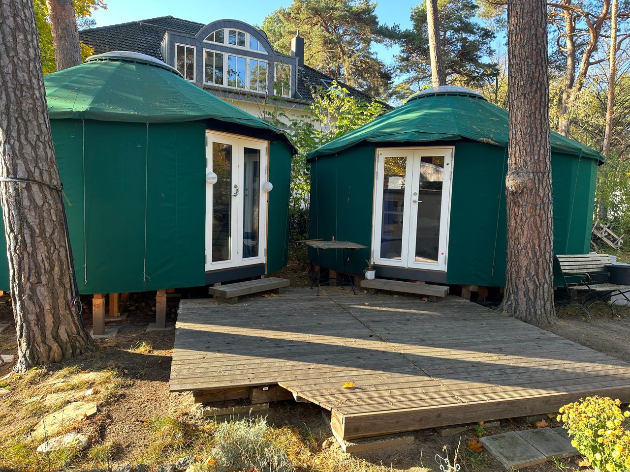 Es handelt sich um ein Sommerhaus am Groß Glienicker See – gebaut in den 20er Jahren sowie zwei moderne Jurten mit Heizung durch Wärmepumpe im Garten. Das Haus hat 3 Schlafzimmer, ein offenes Wohn-/Esszimmer und ein Bad. Ein Kamin steht im Wohnzimmer. Die Jurten sind je 20qm2 groß.