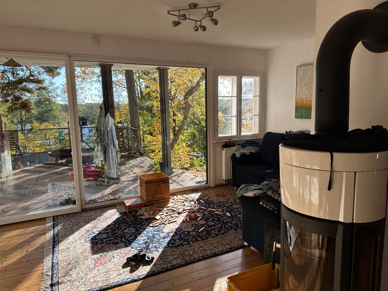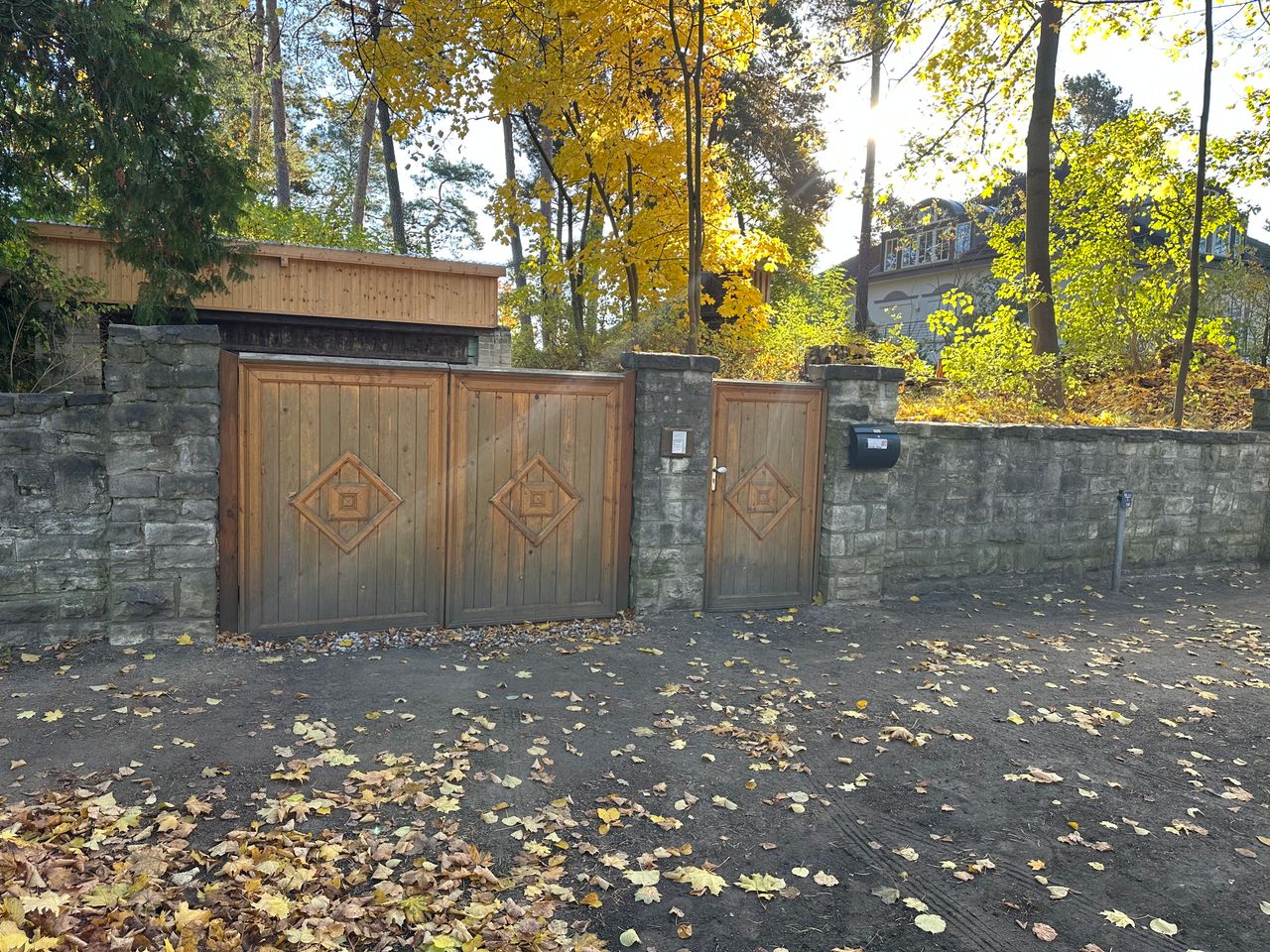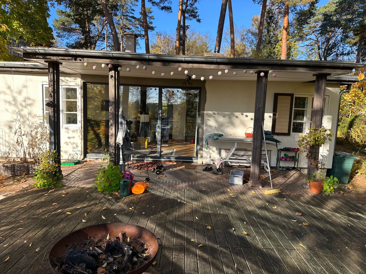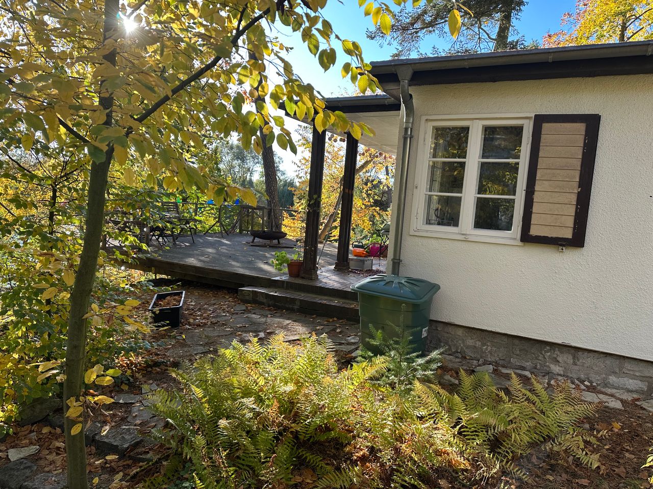 Es handelt sich um ein Sommerhaus am Groß Glienicker See – gebaut in den 20er Jahren sowie zwei moderne Jurten mit Heizung durch Wärmepumpe im Garten. Das Haus hat 3 Schlafzimmer, ein offenes Wohn-/Esszimmer und ein Bad. Ein Kamin steht im Wohnzimmer. Die Jurten sind je 20qm2 groß.