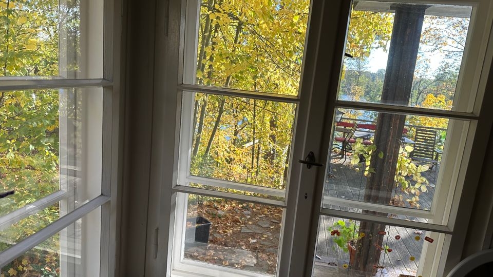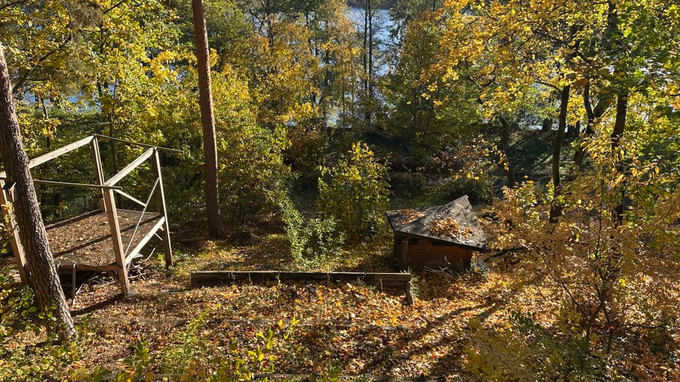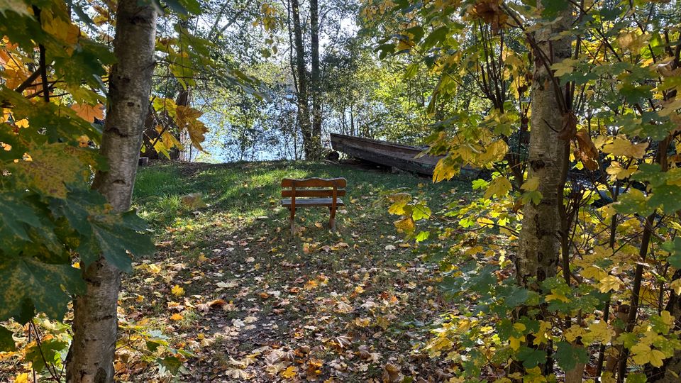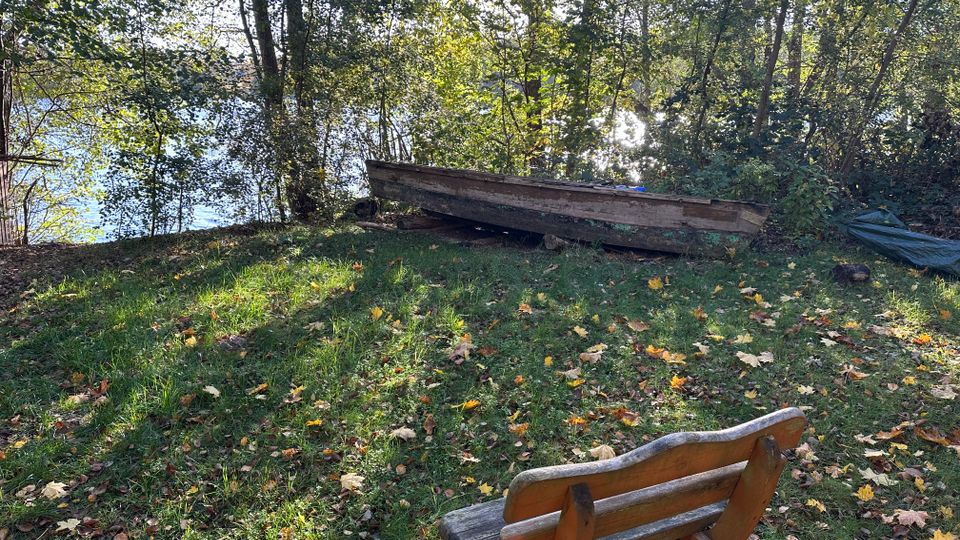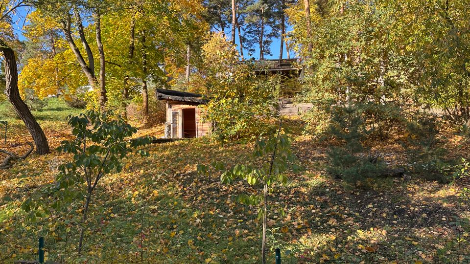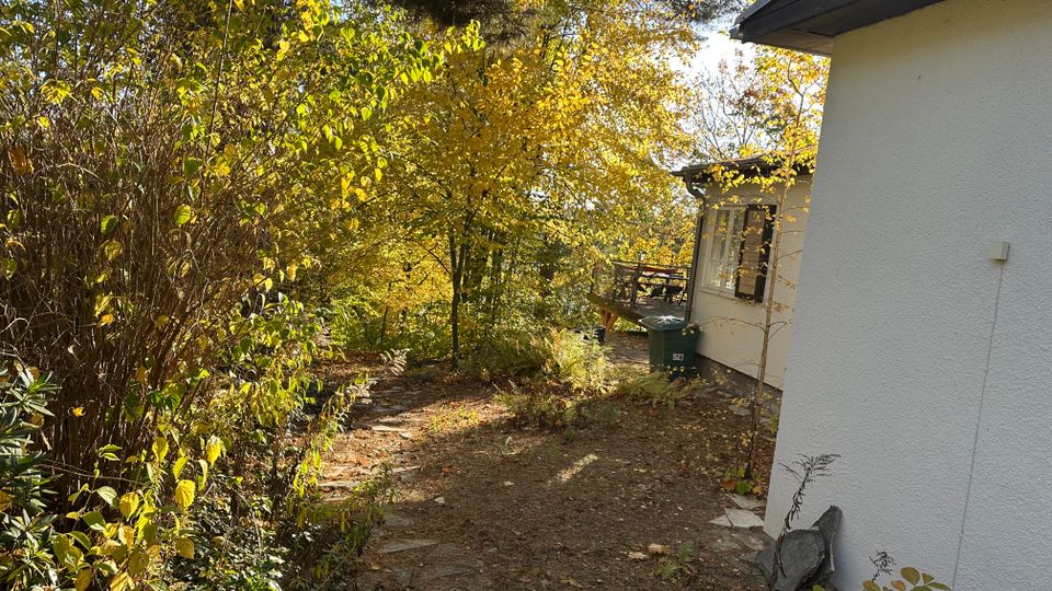 Das Grundstück ist mit 2500qm groß, am Hang gelegen, abfallend zum See mit Privatstrand. Am Hang steht eine freistehende Sauna. Die Kombination aus kleinem, historischem Häuschen und großem Panoramafenster neben 100 Jahre alten Doppelfenstern ist einmalig. Der Boden ist großteils original aus den 20er Jahren – Stein-Klinker und Holzdielen.