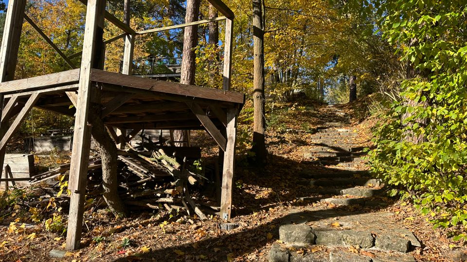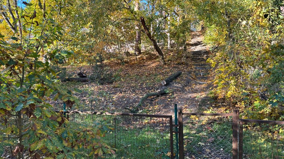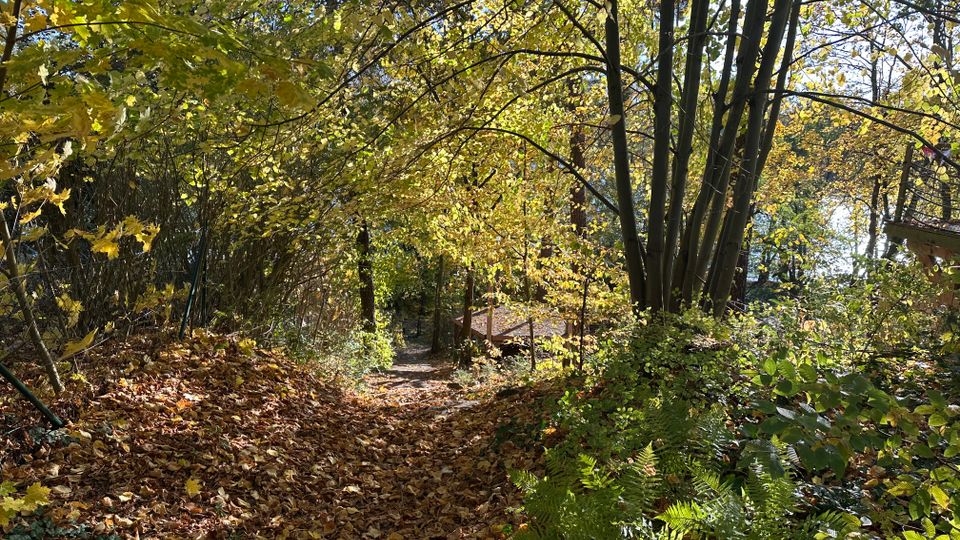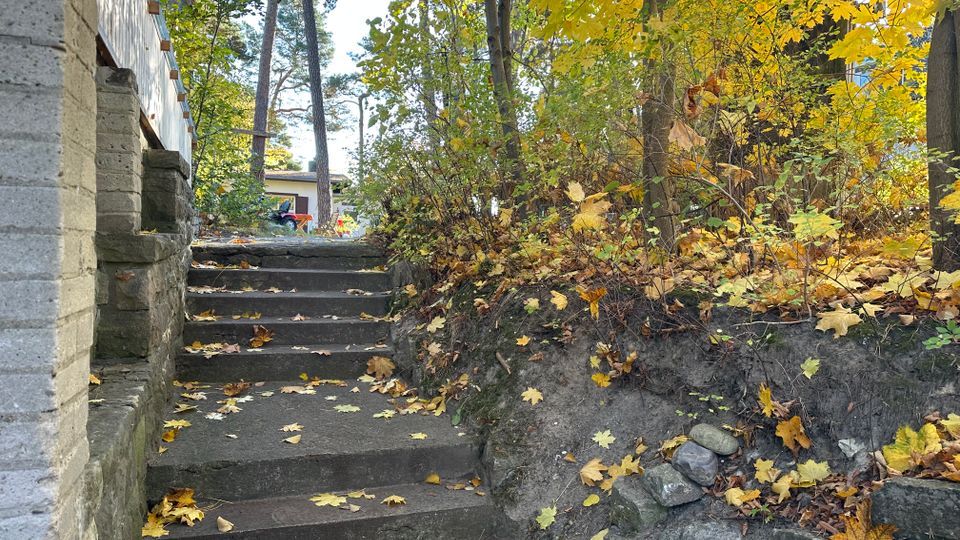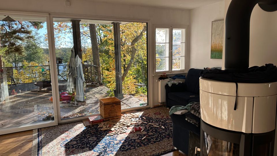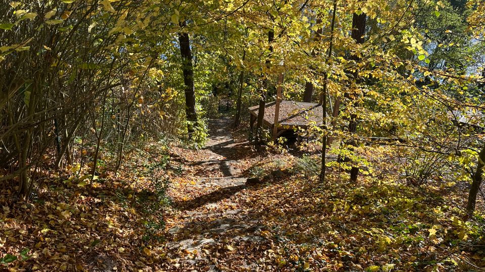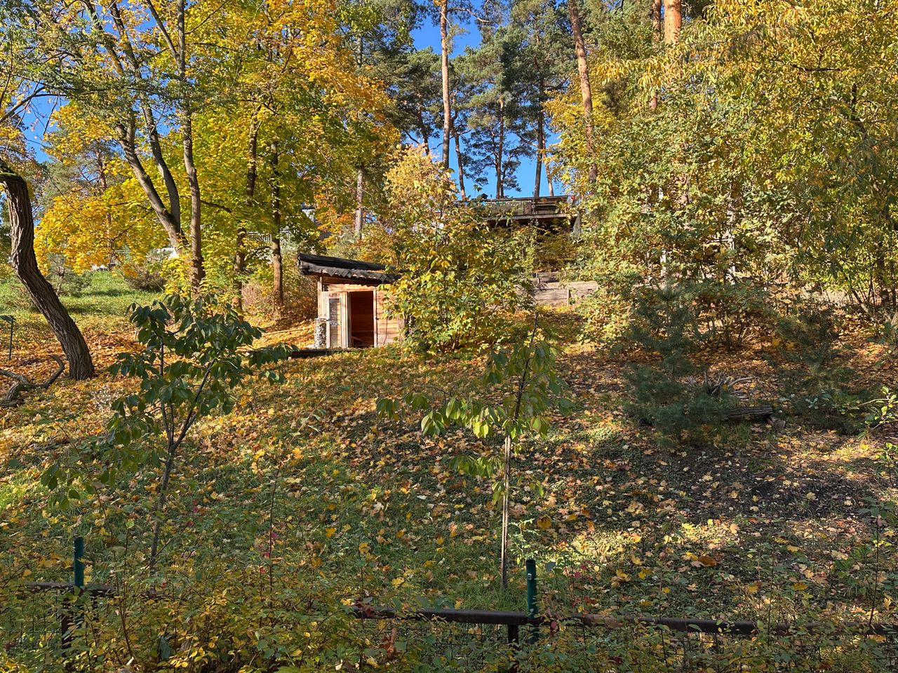 Das Grundstück ist mit 2500qm groß, am Hang gelegen, abfallend zum See mit Privatstrand. Am Hang steht eine freistehende Sauna. Die Kombination aus kleinem, historischem Häuschen und großem Panoramafenster neben 100 Jahre alten Doppelfenstern ist einmalig. Der Boden ist großteils original aus den 20er Jahren – Stein-Klinker und Holzdielen.
