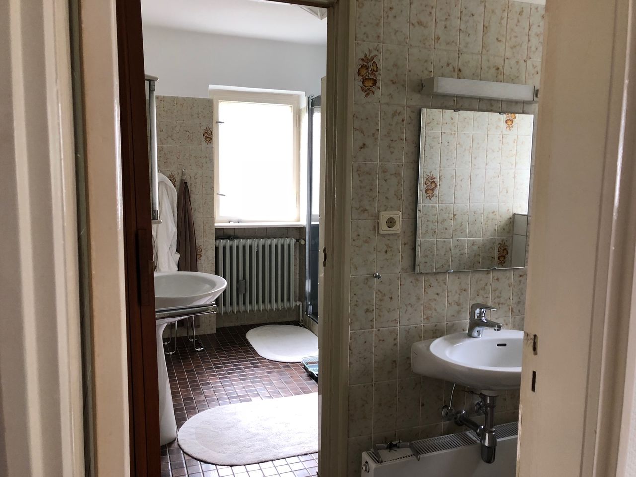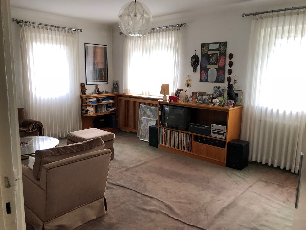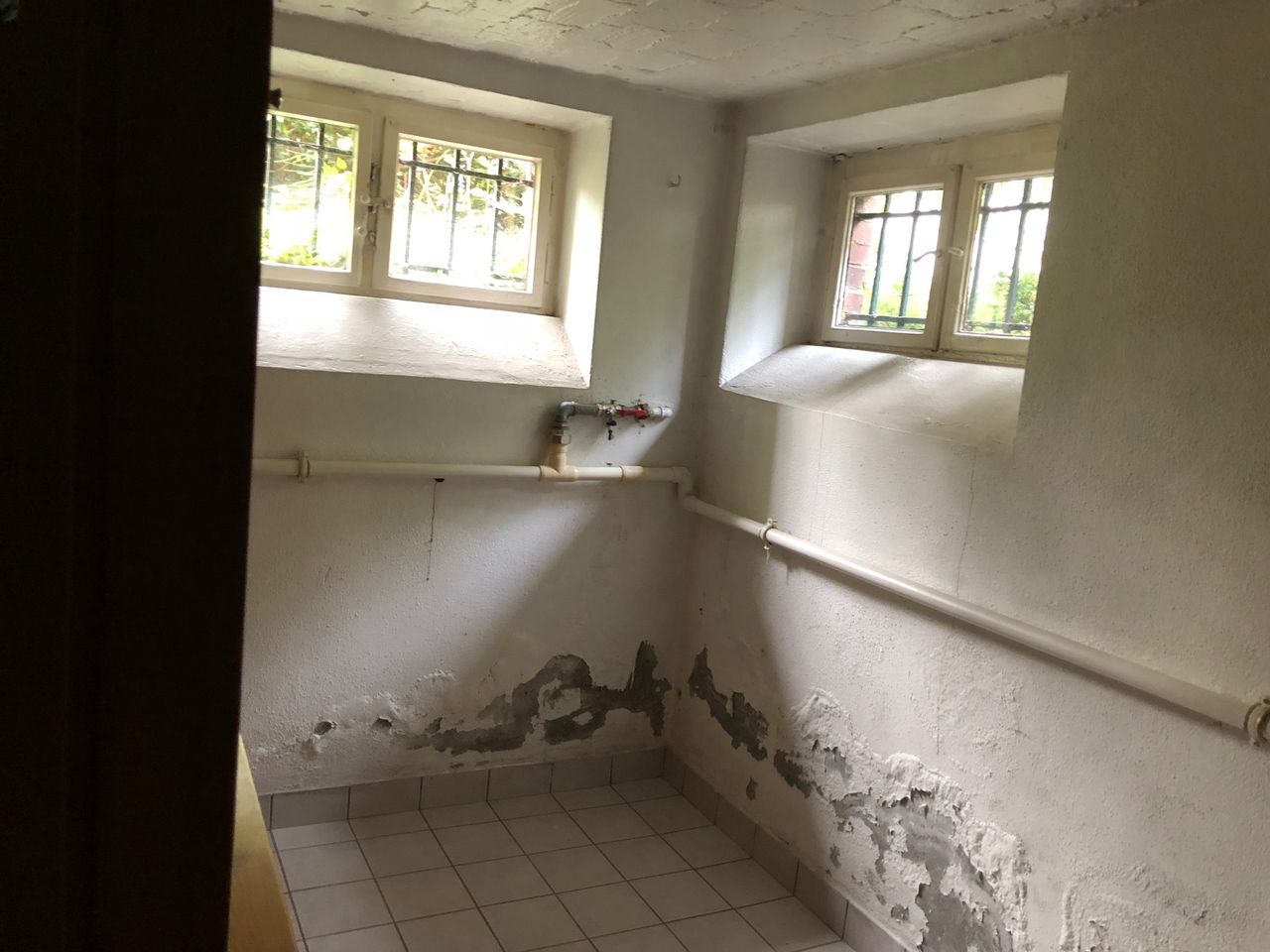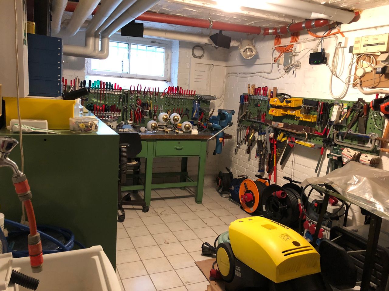 Keller, Erdgeschoss und erster Stock mit ca. 200qm. Keller, mit Waschküche (ausgestattet mit professionellen Waschmaschinen), Werkstatt und Tunnel zur Garage und Einfahrt. Einrichtung aus den 70ern und 80ern.