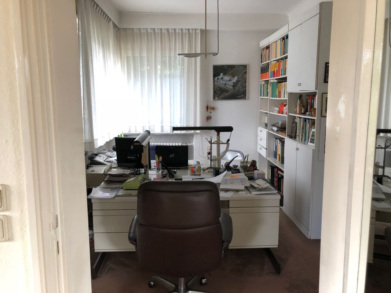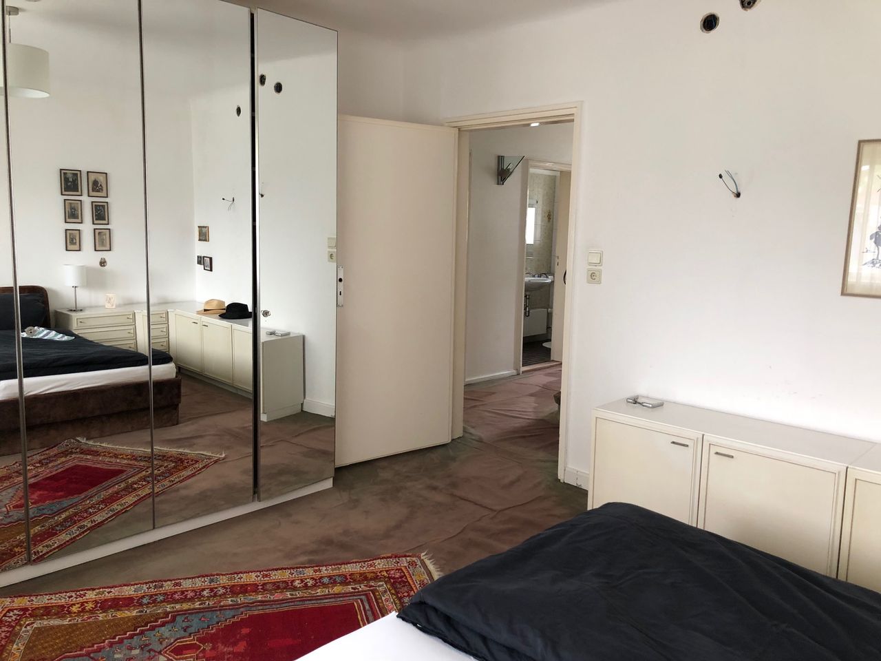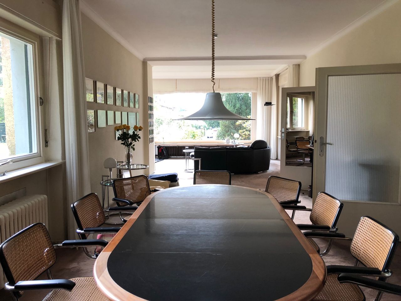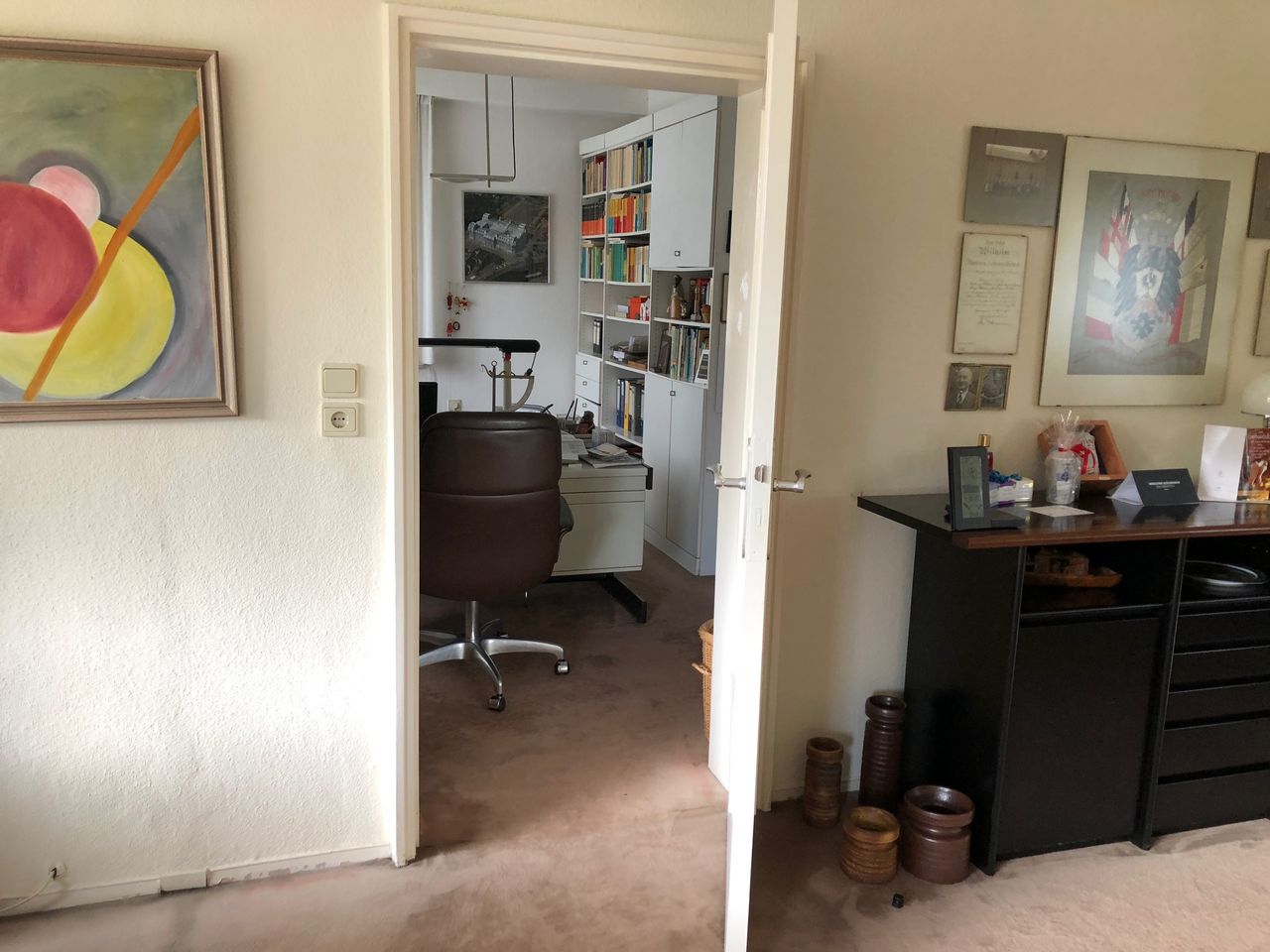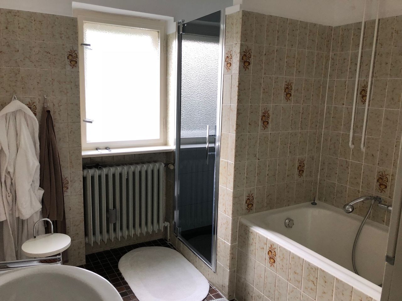 Keller, Erdgeschoss und erster Stock mit ca. 200qm. Keller, mit Waschküche (ausgestattet mit professionellen Waschmaschinen), Werkstatt und Tunnel zur Garage und Einfahrt. Einrichtung aus den 70ern und 80ern.
