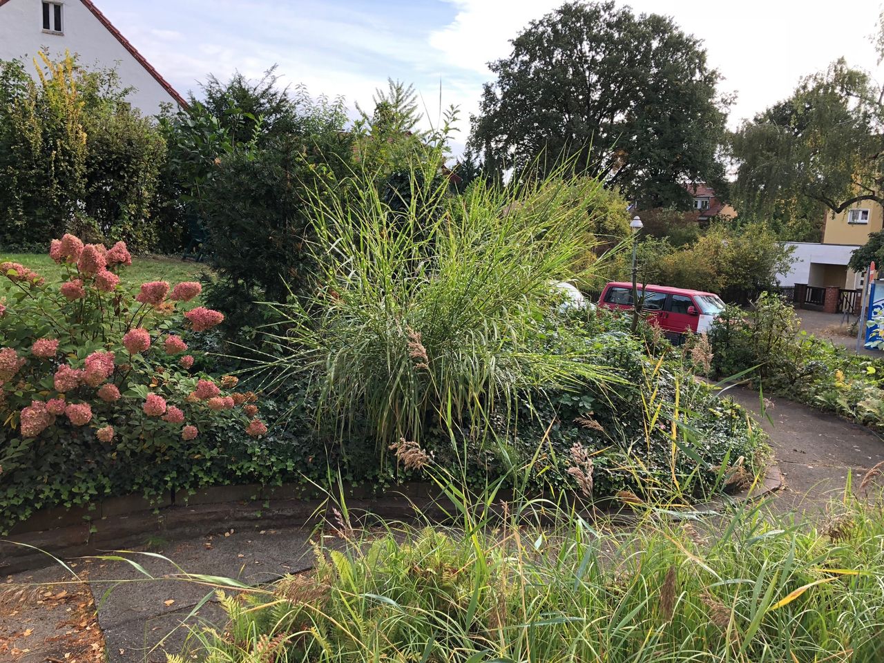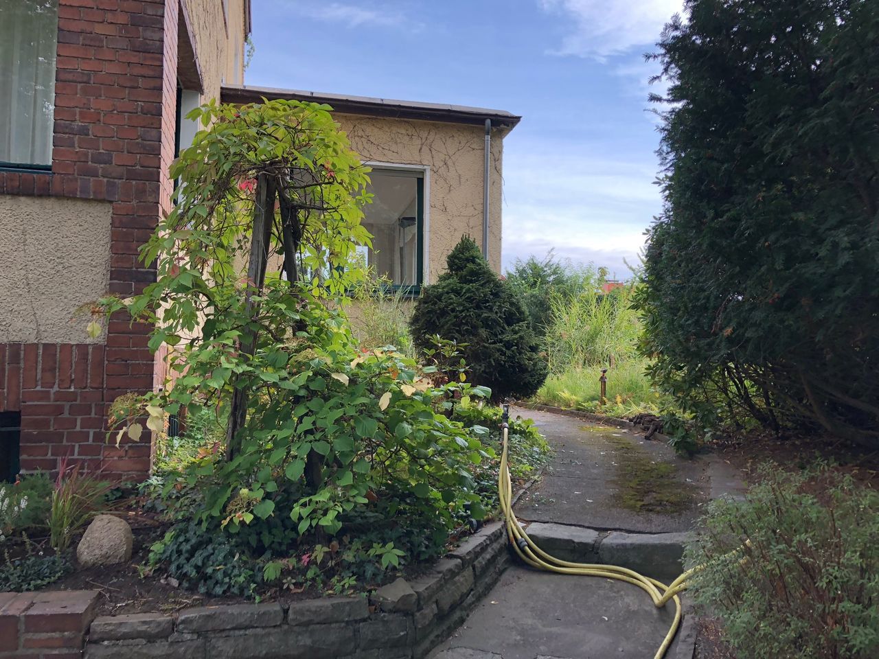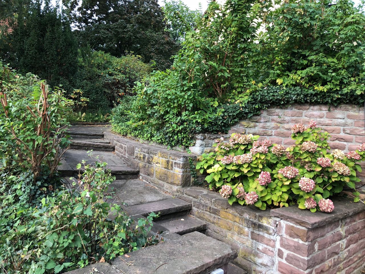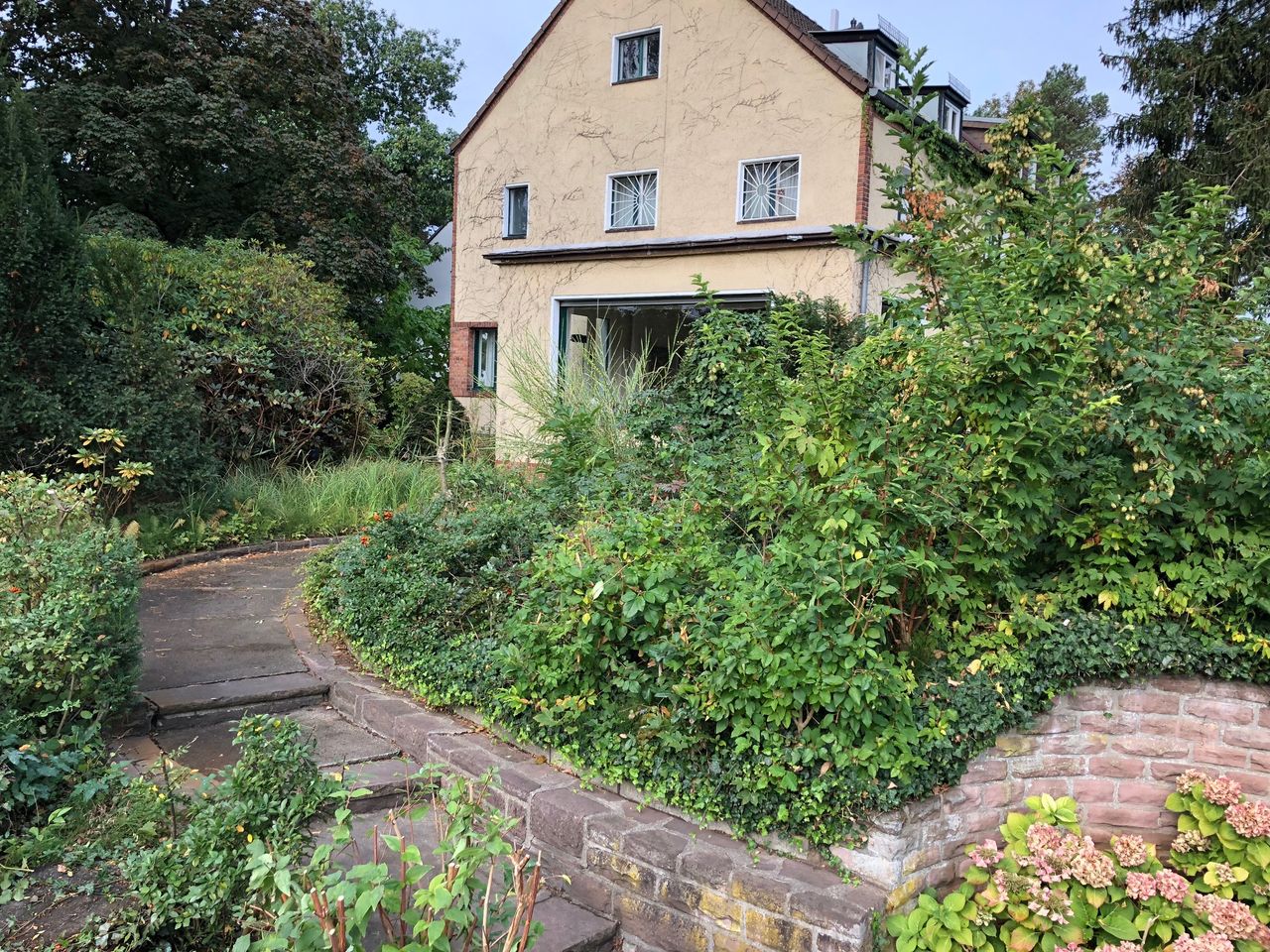 Gartenanlage mit altem Baumbestand mit ca. 700qm, mit gemauerten Wegen. Das Grundstück ist ein Eckgrundstück.