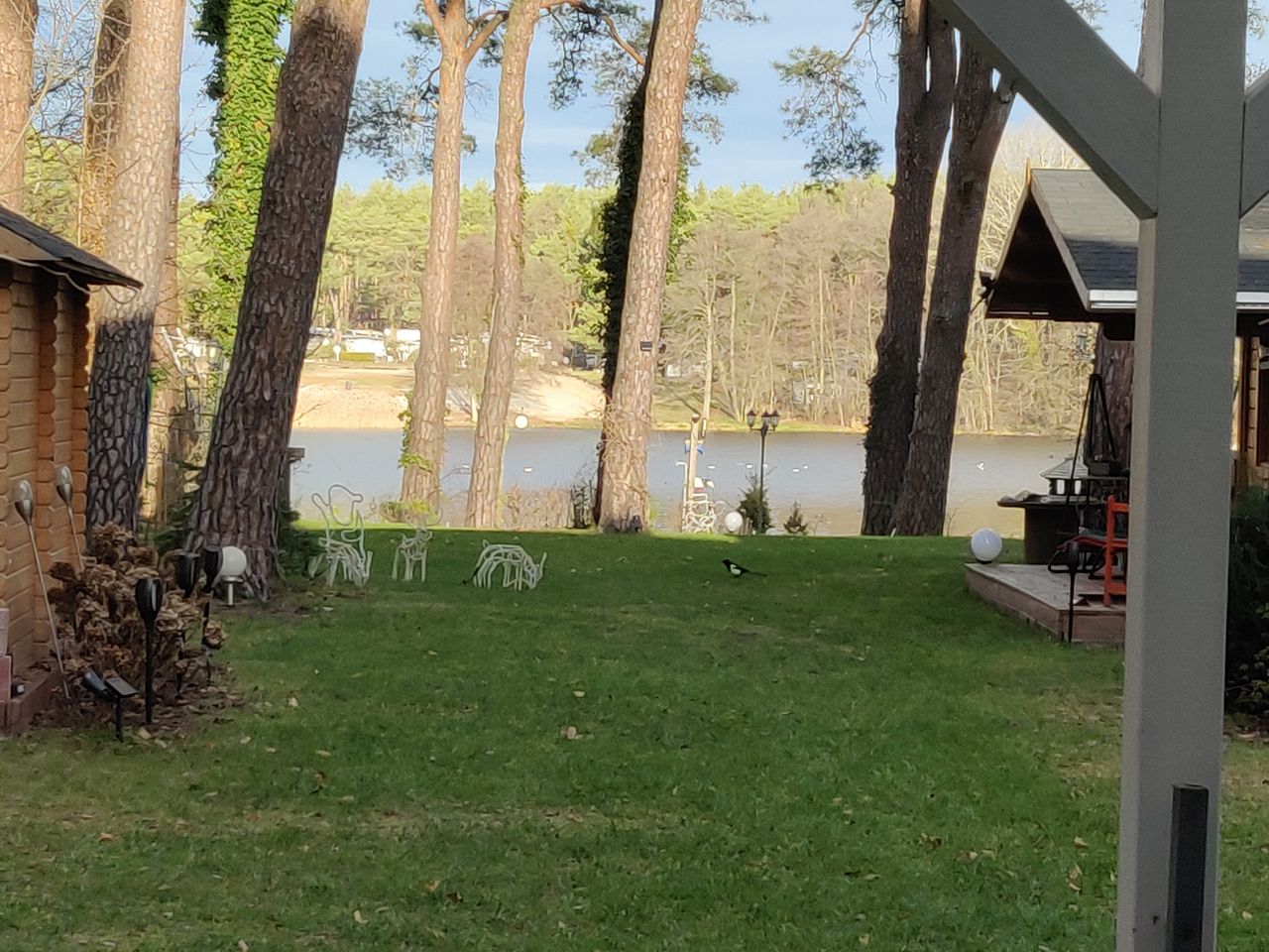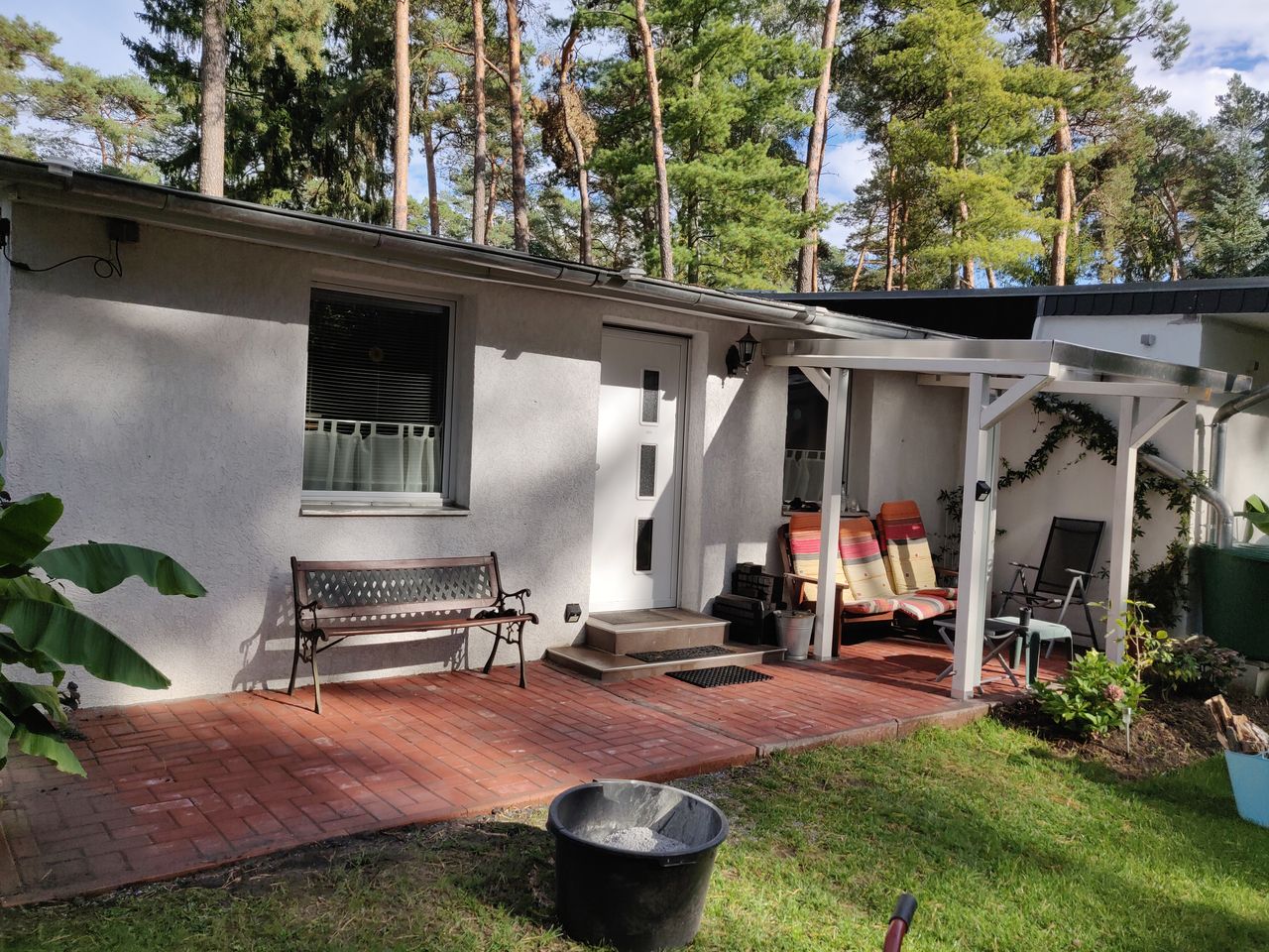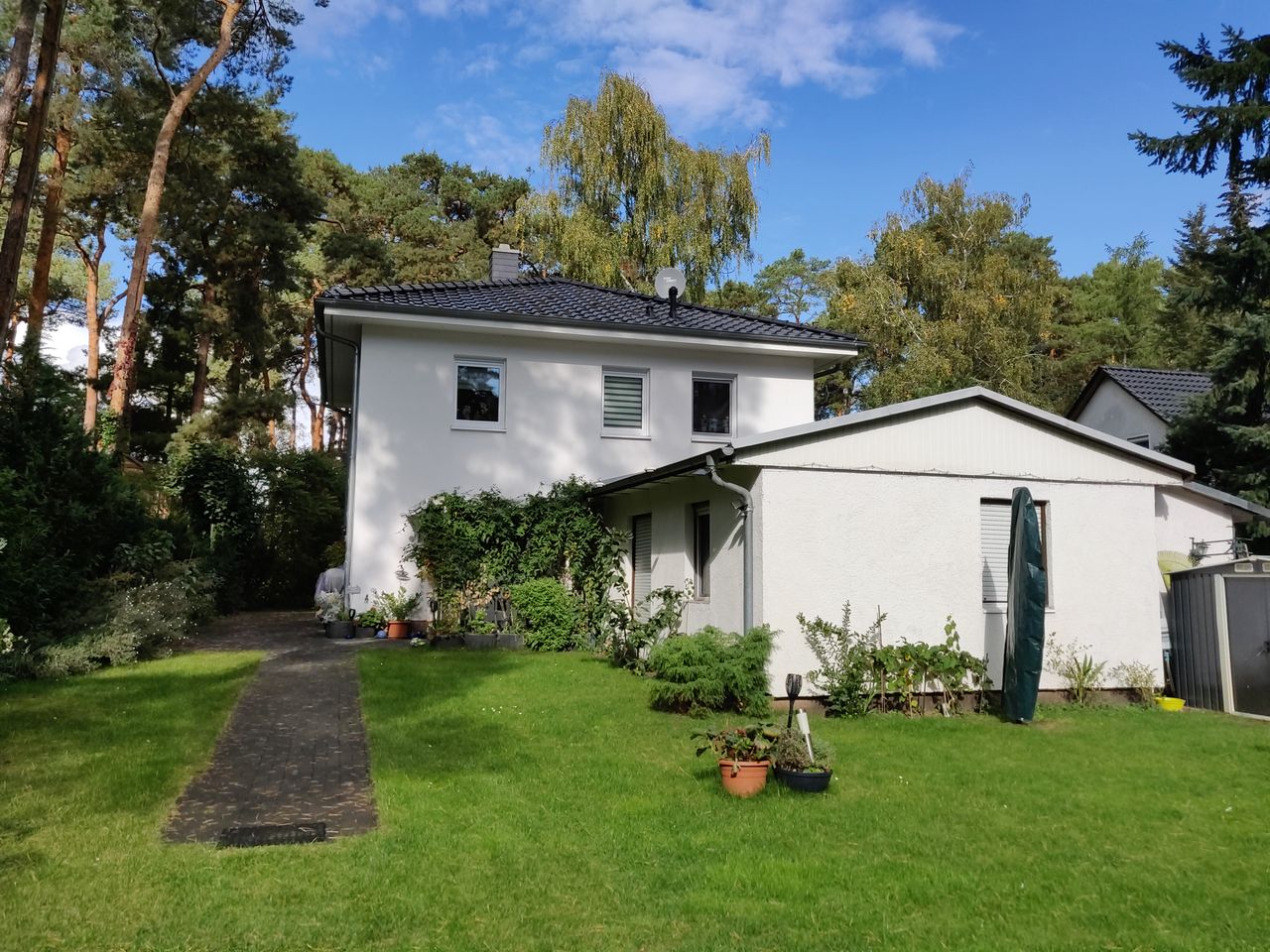 Im Garten stehen ein paar Kiefern.