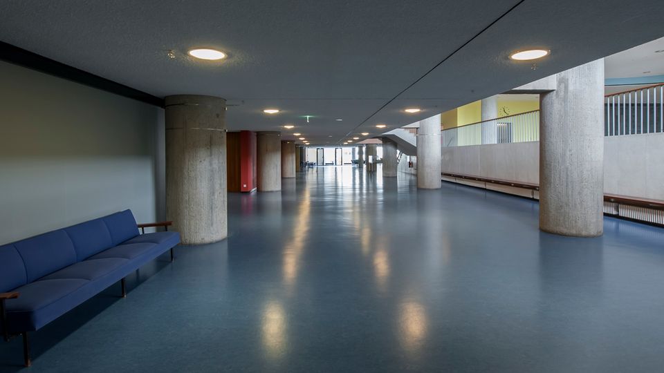Die bautechnische Umsetzung des programmatischen Anspruches stieß jedoch auf Schwierigkeiten: Der ursprüngliche Entwurf Stubbins‘ sah ein nur auf zwei Säulen liegendes, ansonsten frei schwebendes Dach vor. Die Idee eines nur auf wenigen Punkten ruhenden Daches entsprach dem damaligen Zeitgeist des organischen Bauens. Bereits 1953-56 hatte Eero Saarinen ein Dach für das Kresge Auditorium des Massachusetts Institute of Technologie in Cambridge konstruiert, das nur auf drei Punkten ruhte.