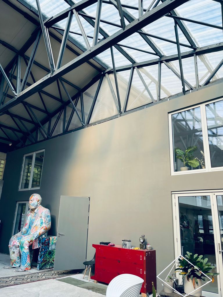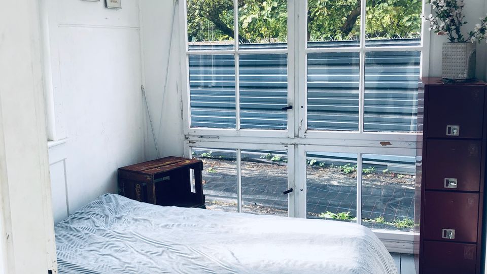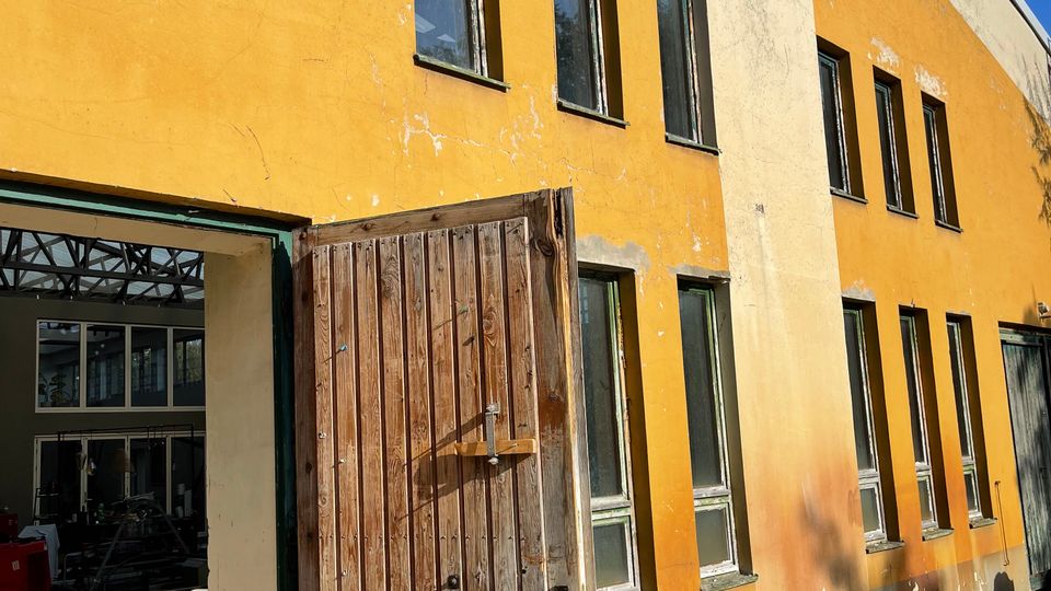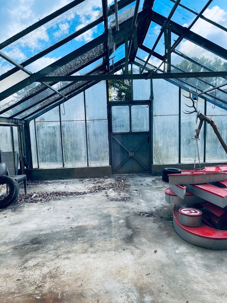 Die Halle auf dem Baumschulgelände wurde in Teilen saniert, u.a. die in der Halle befindlichen Büros, Sozial- und Aufenthaltsräume. Diese sind hell und modern. Vor allem ins Auge sticht der große und hohe wie helle Küche / Aufenthaltsraum / Atrium mit einer Raumhöhe von circa 5,50 m. Dieser ist auch einsehbar von einigen Räumen im OG. Letztere sind von eher normaler Deckenhöhe, aber durch die weißen Wände und hellen Holzböden dennoch nicht beengend. Das Innengebäude mit den beschriebenen Räumlichkeiten nimmt etwa 1/3 der Halle ein und bietet eine hohe Flexibilität an möglichen Motiven - von wohnlichen Szenen bis hin zu modern, künstlerischen Arbeitsräumen. Direkt angrenzend an die Halle liegen 5 charmant-marode Gewächshäuser.