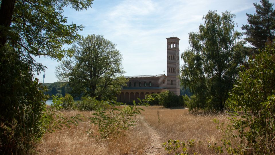 Die Heilandskirche liegt direkt an einer Landzunge, welche in einen Fluss ragt.