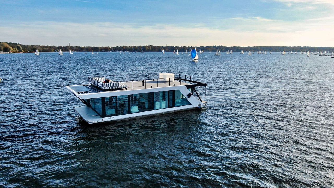 Event Hausboot - Auf mehr als 100m² bietet der vollverglaste Innenraum, mit direkt anschließender Bug- und Heck-Terrasse, ein für ein Boot unvergleichliches Raumgefühl sowie einen einzigartigen Panoramablick.