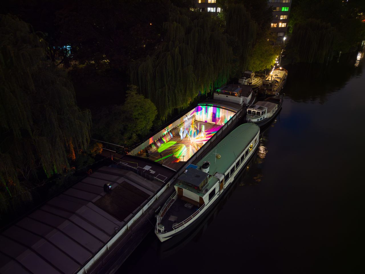 Both the exhibition and performance spaces on MS Heimatland can be rented for art or business events. We also have a range of opportunities for weddings, BBQs, concerts, art openings, film screenings, stage performances, theatre productions or film and photo shoots. With a direct view on the iconic TV tower, the Old City Hall and the tower of Humboldt Forum, the barge has kept its authentic features inside and outside. The original wooden floorboards, uneven and creaky, and rusty steel walls are some of the unique features of the exhibition space.